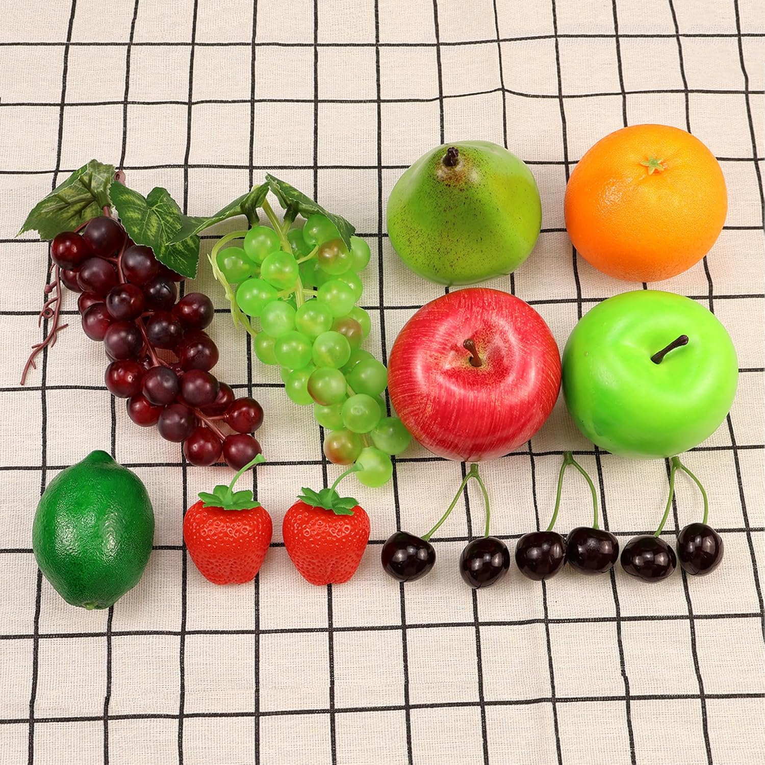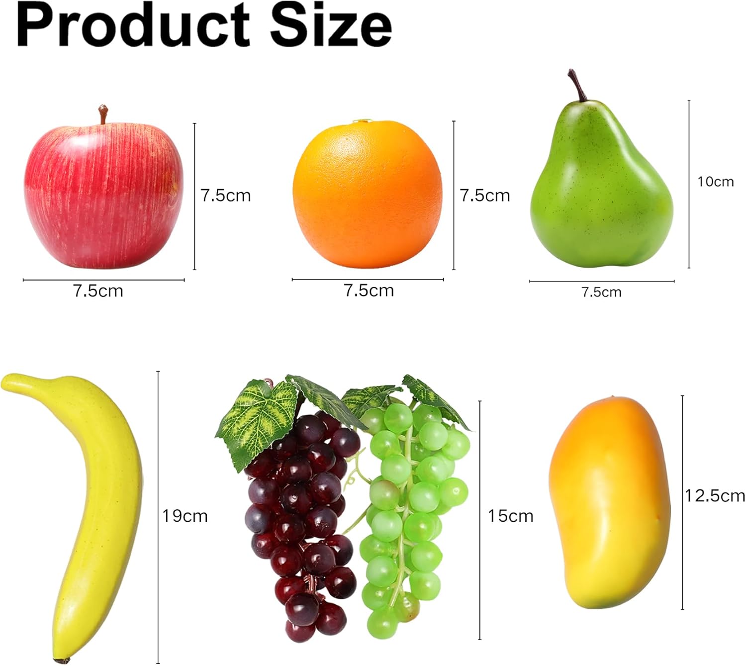 • Пакетът включва: череша x 5, ябълка x 3, банан x 2, грозде x 2, ягода x 2, лимон x 2, портокал x 1, манго x 1, круша x 1, черна слива x 1 (моля, обърнете внимание, че: комплектът съдържа само изкуствени плодове, а не чинийки)