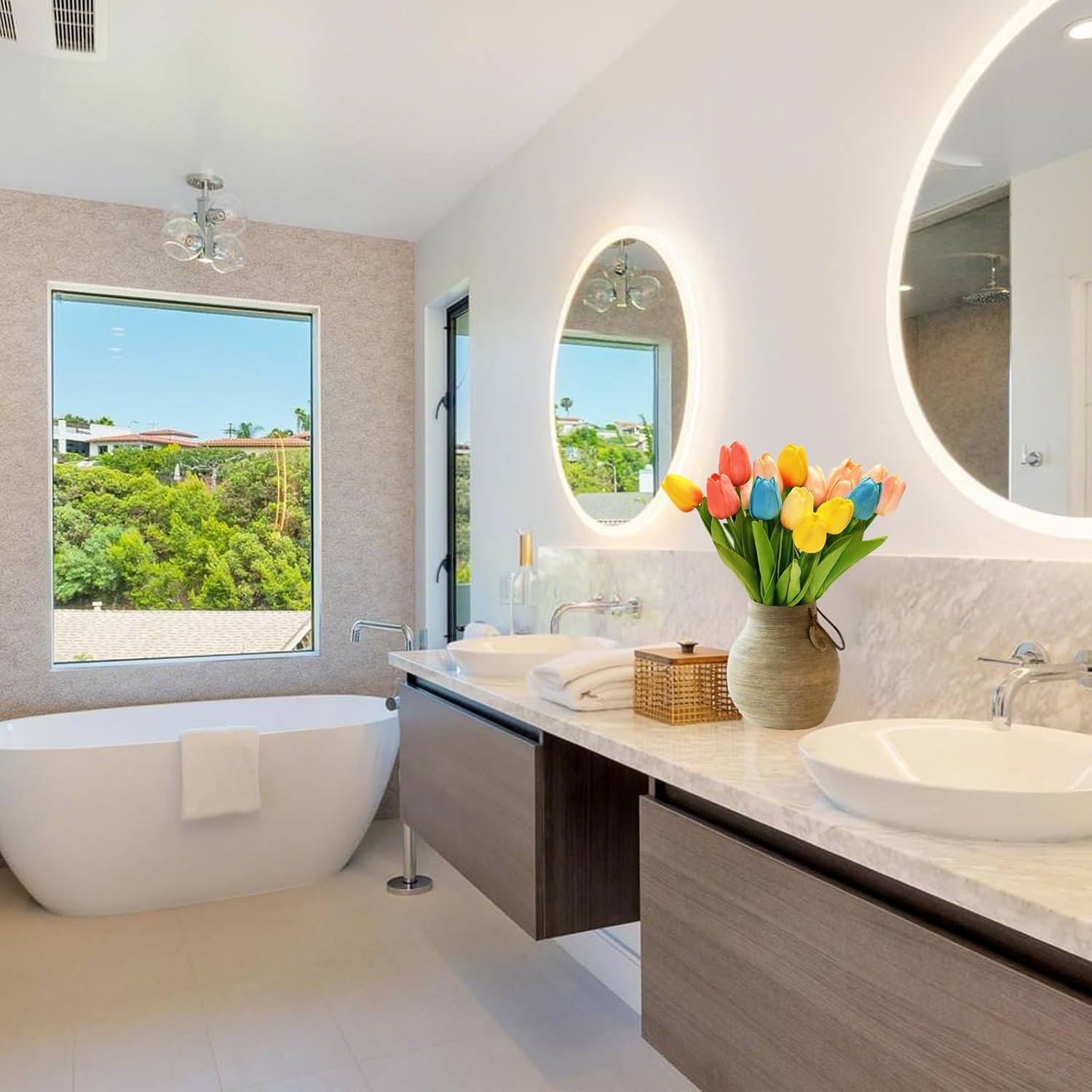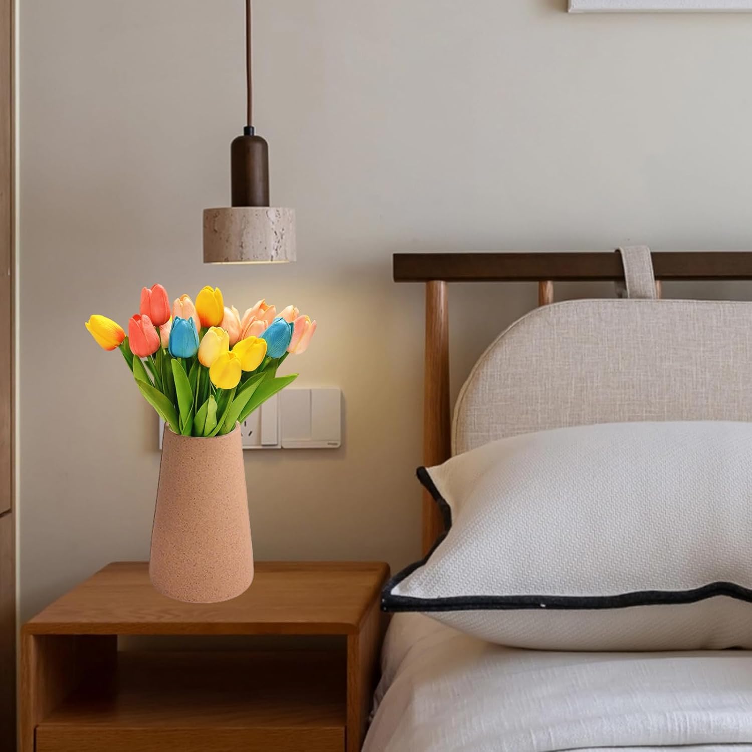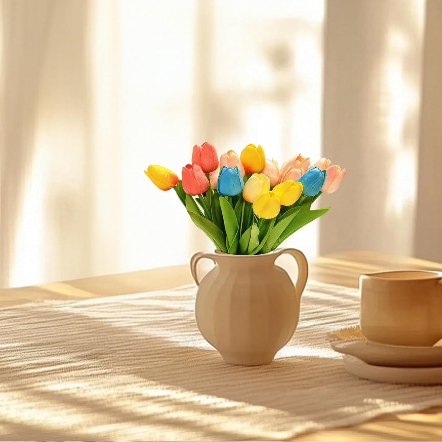 • ПЪСТРО РАЗНООБРАЗИЕ: 18 изкуствени лалета в 9 цвята (по 2 стъбла всяко) - идеални за добавяне на цвят в стаята! Всяко цвете е изработено от PU, стъбла с тел вътре, височина 34 см (цвете 5 см). Идеални за тези, които обичат разнообразието и не искат да се обвързват с един цвят. Излъчва радост и озарява всяка стая. Без ваза