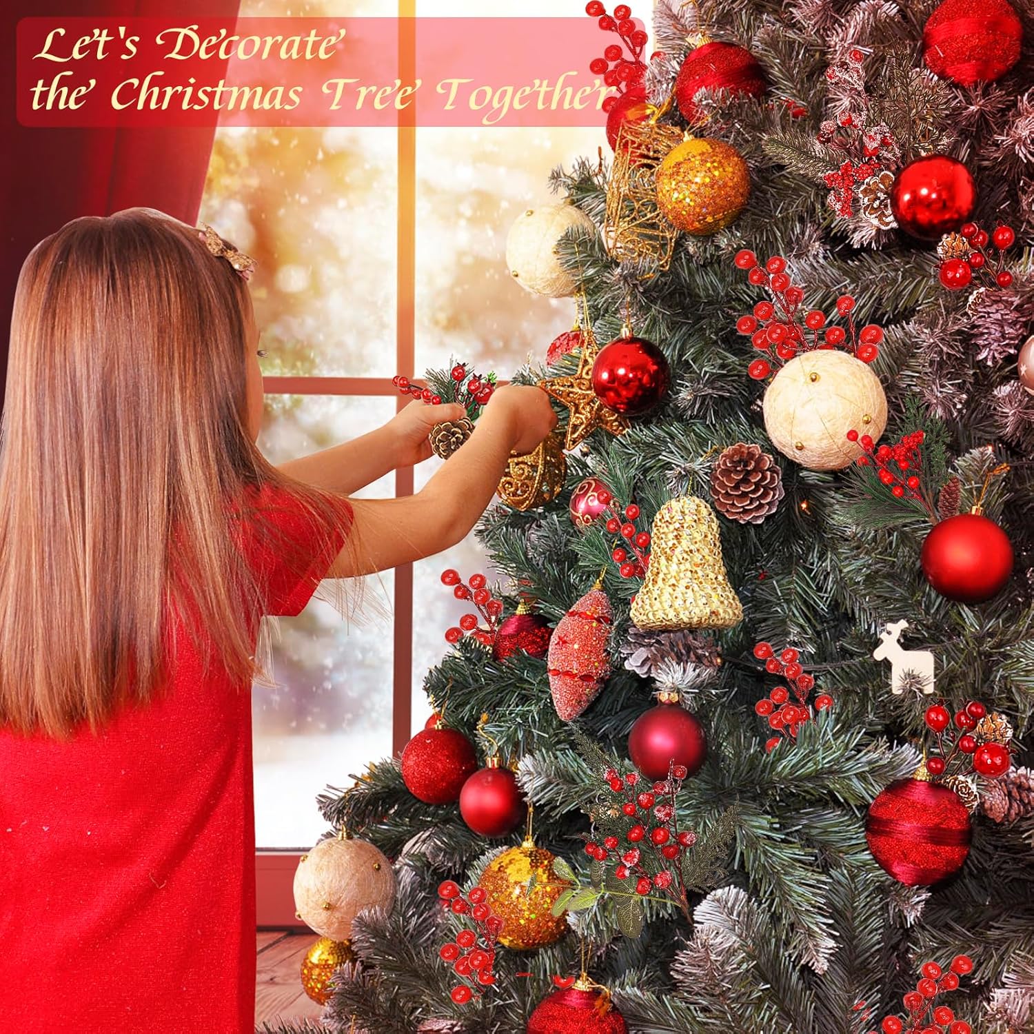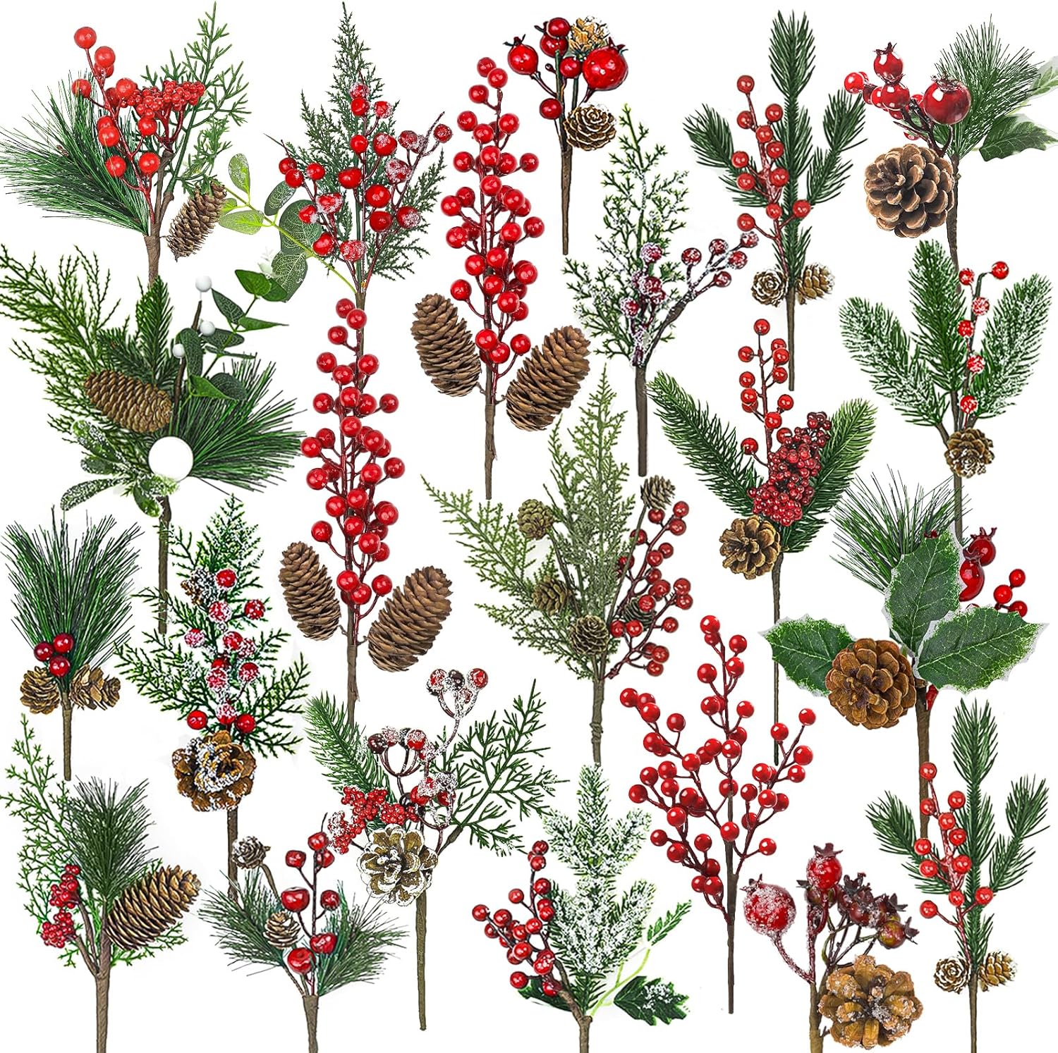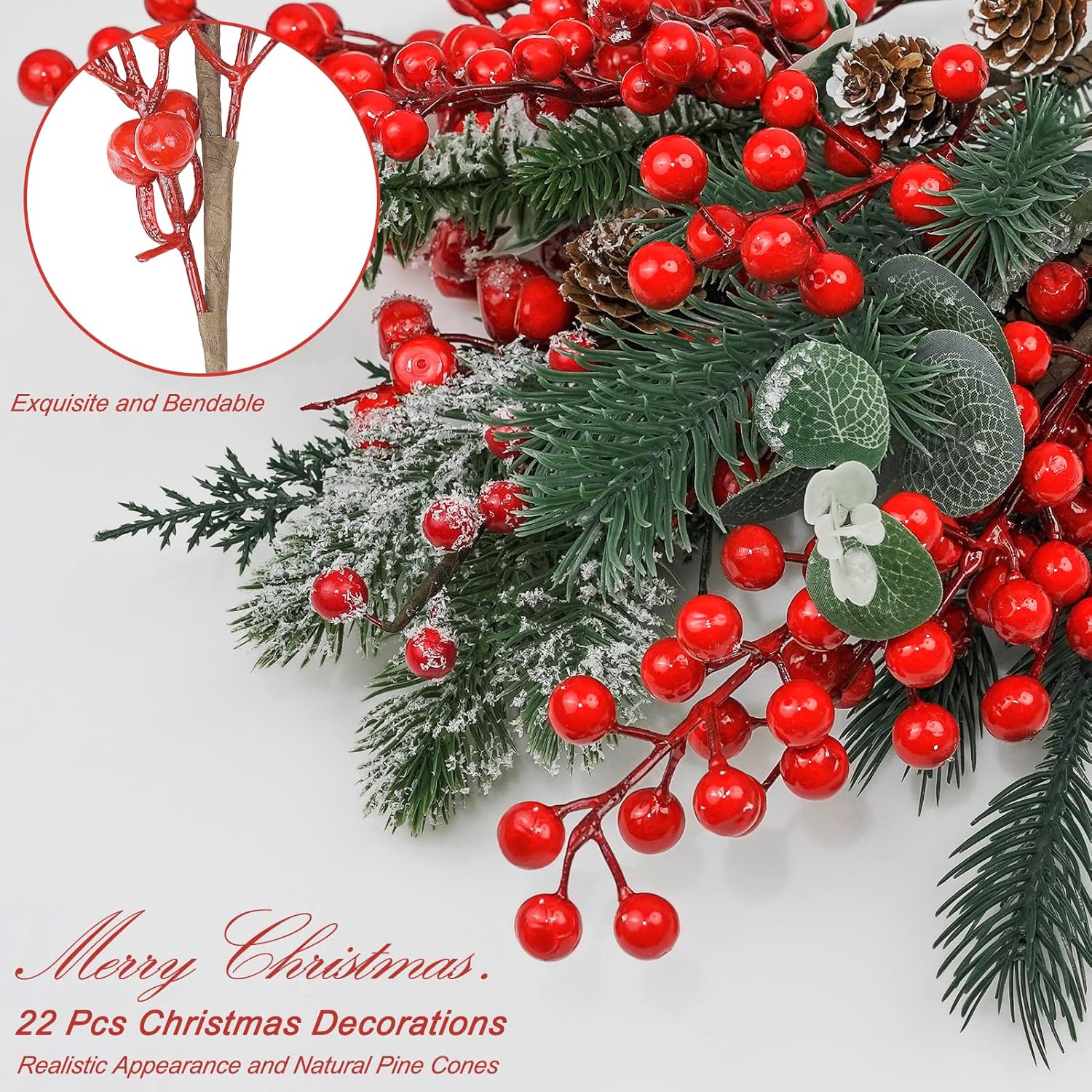 Пакет от 22 големи коледни плодове, изкуствени борови клонки с червени плодове, борови шишарки, асорти 20 вида коледни кирки за занаяти, кирки за подаръци, зимни кирки за цветя, венци за елхи, коледни подаръци
