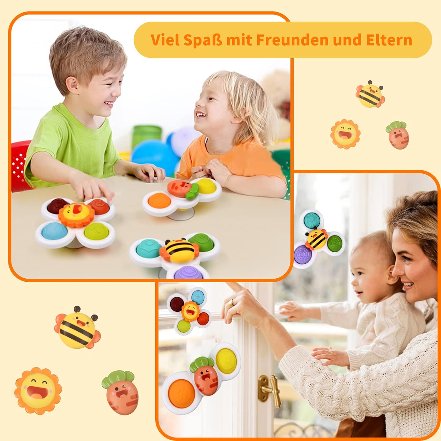 3 different cute cartoon shapes with suction cup toy: bee, sun, carrot