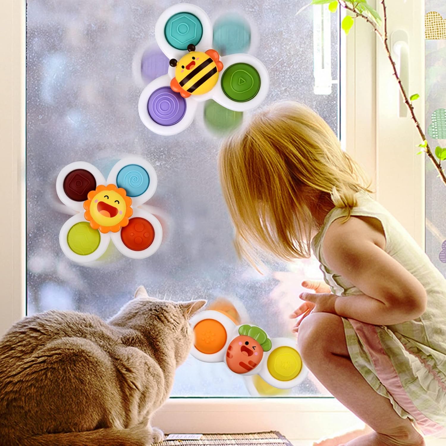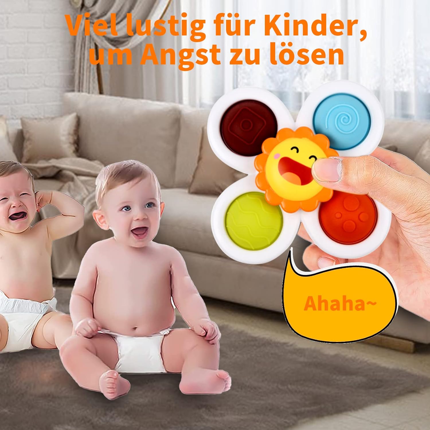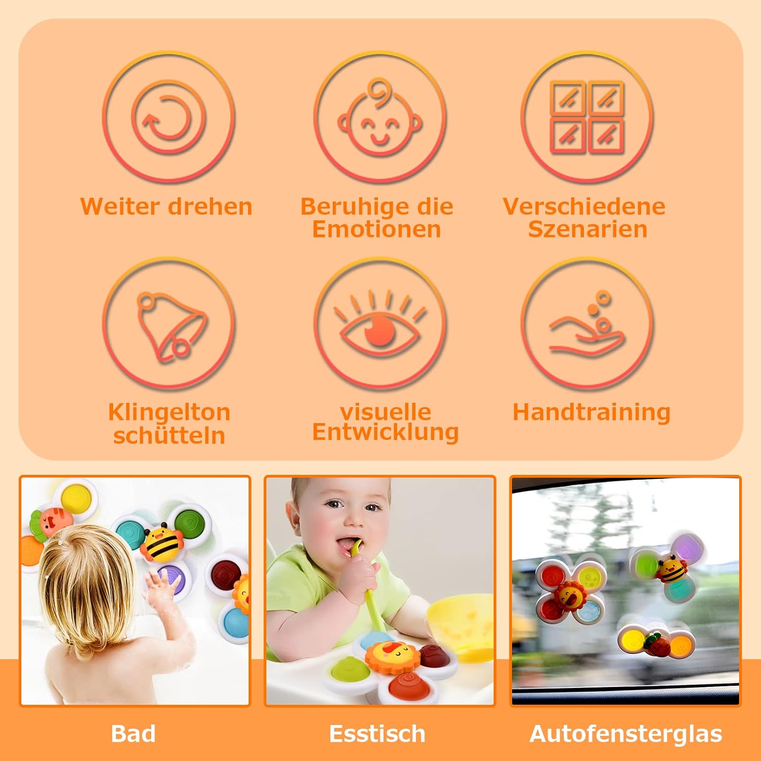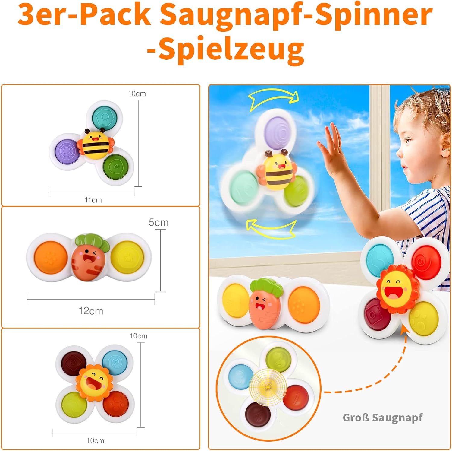 The powerful suction cup can attach the spinning toy to various smooth surfaces. You can use this toy to make yourself and your child feel happy and laugh!