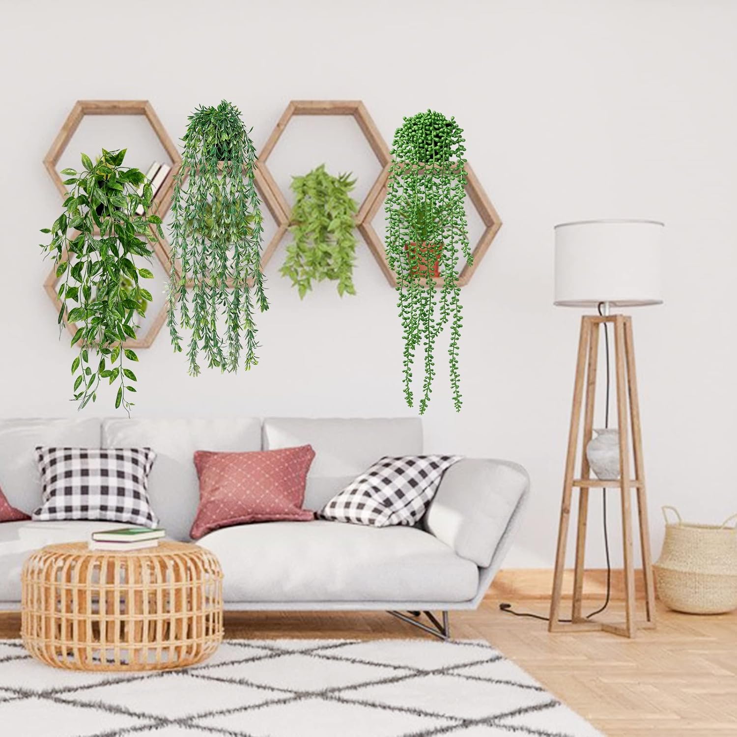 4. In order to avoid damage during transportation, our artificial hanging plants are fully packaged and shipped. After you receive the goods, you need to arrange them manually and make the artificial hanging plants as fluffy and dense as the picture by DIY.