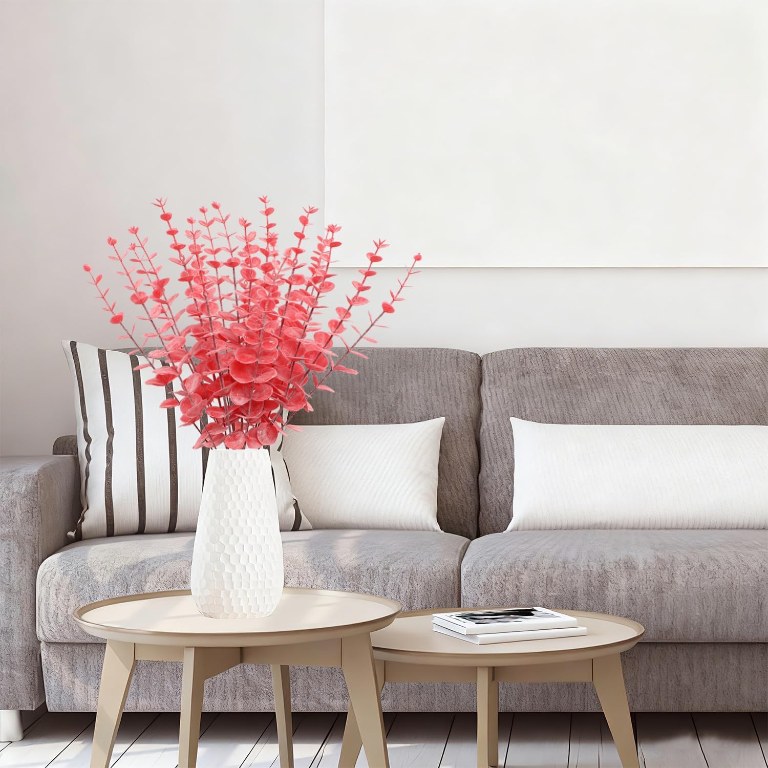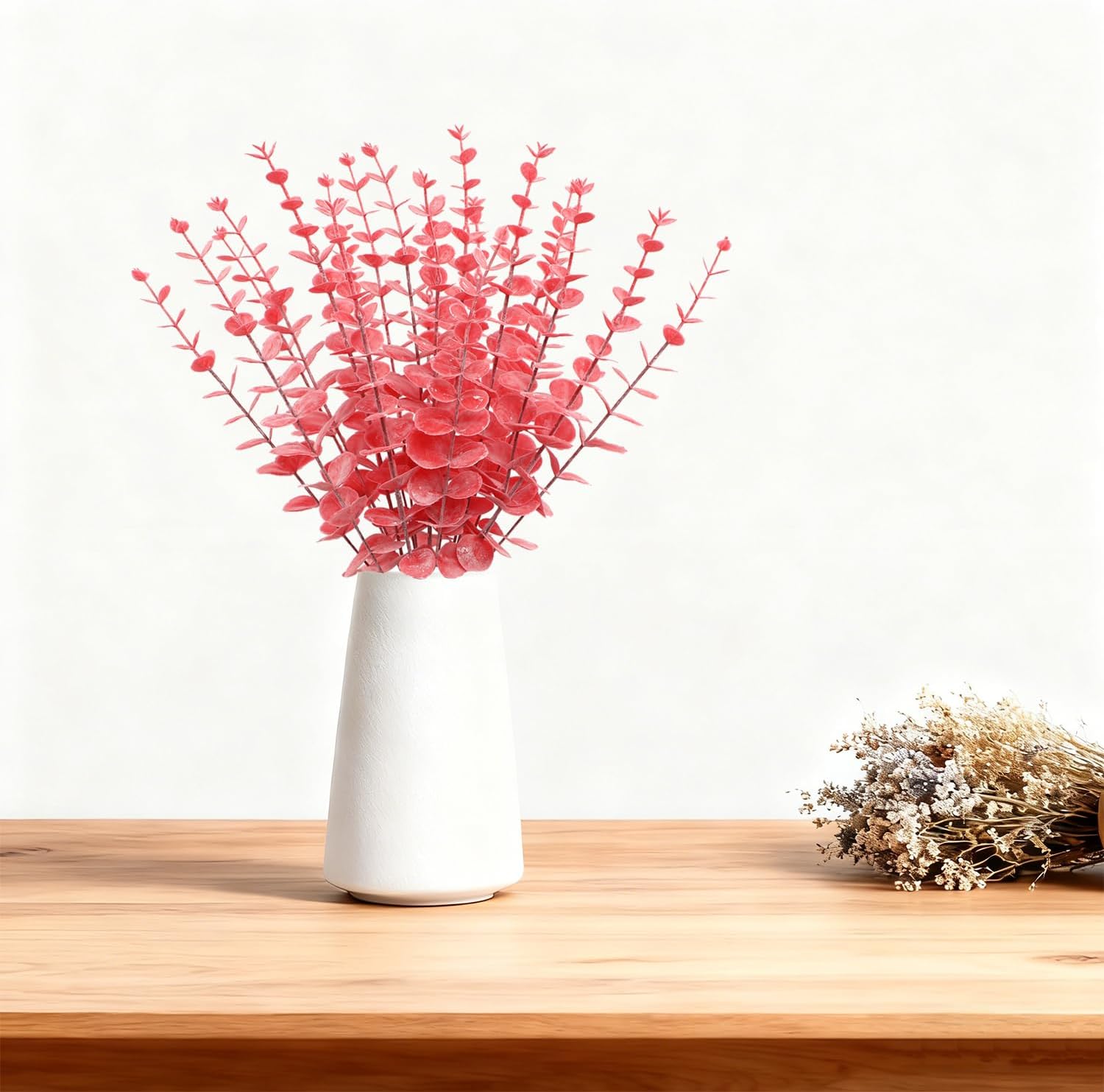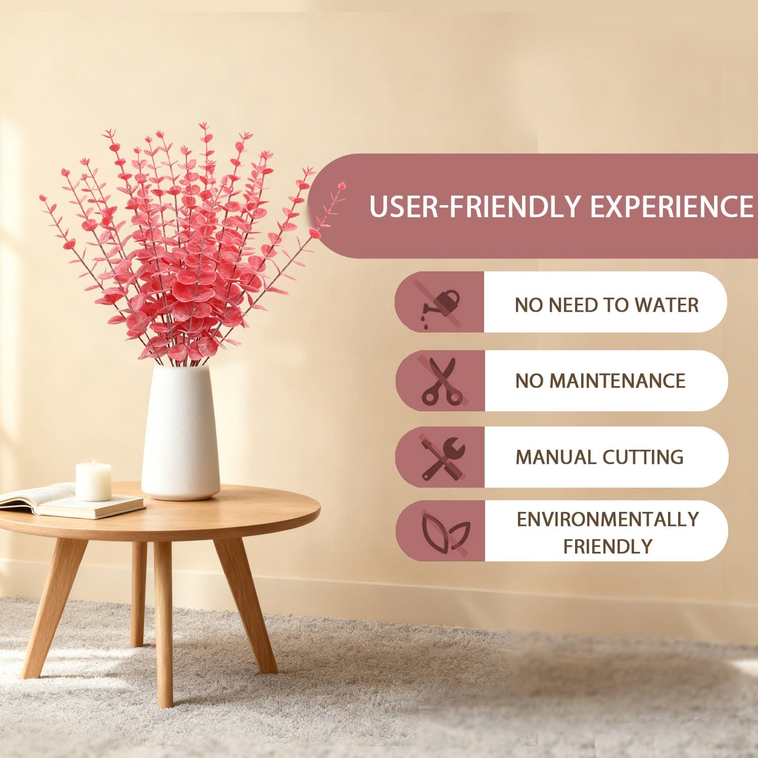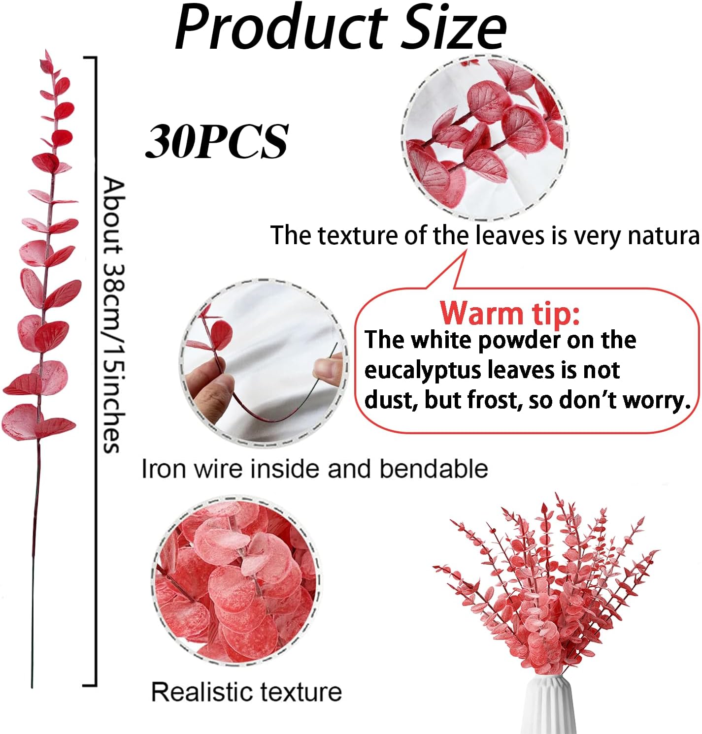 Warm tips: 1. Due to the long shipping, our eucalyptus decoration will be stored in an airtight room for a long time, so there will be a slight smell if you simply remove it, but it will not cause any damage, you can put it in a ventilated place for 1-2 days. 2. We want to be friends with you, so please let us know if you have any questions.