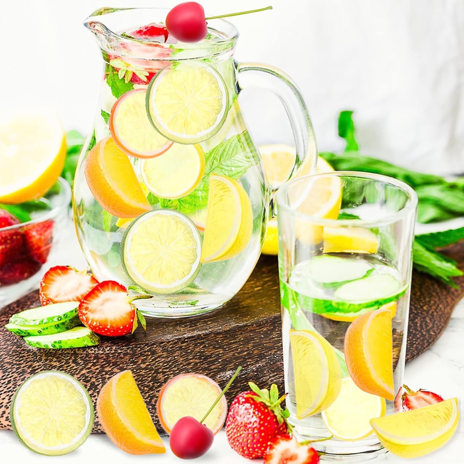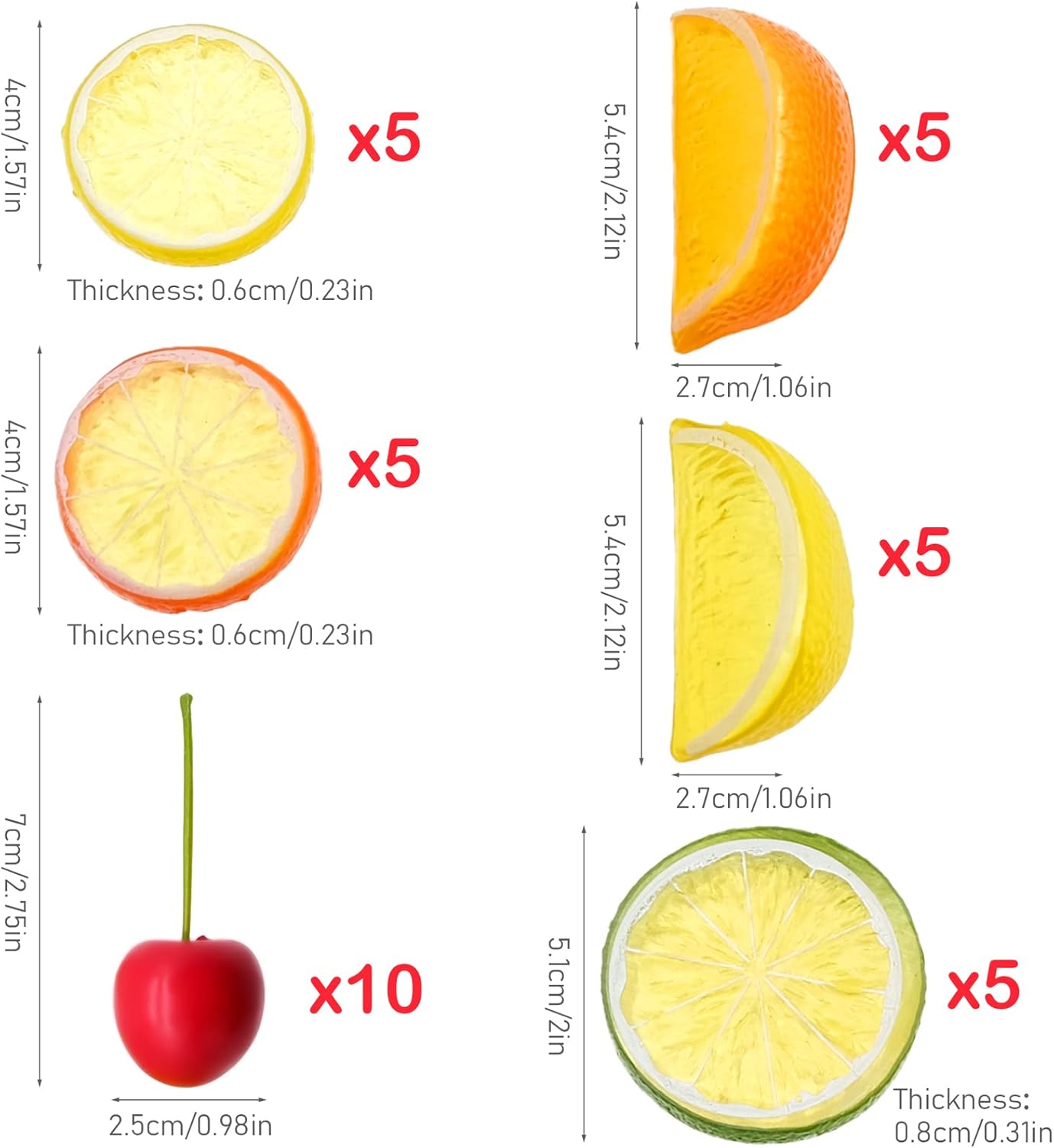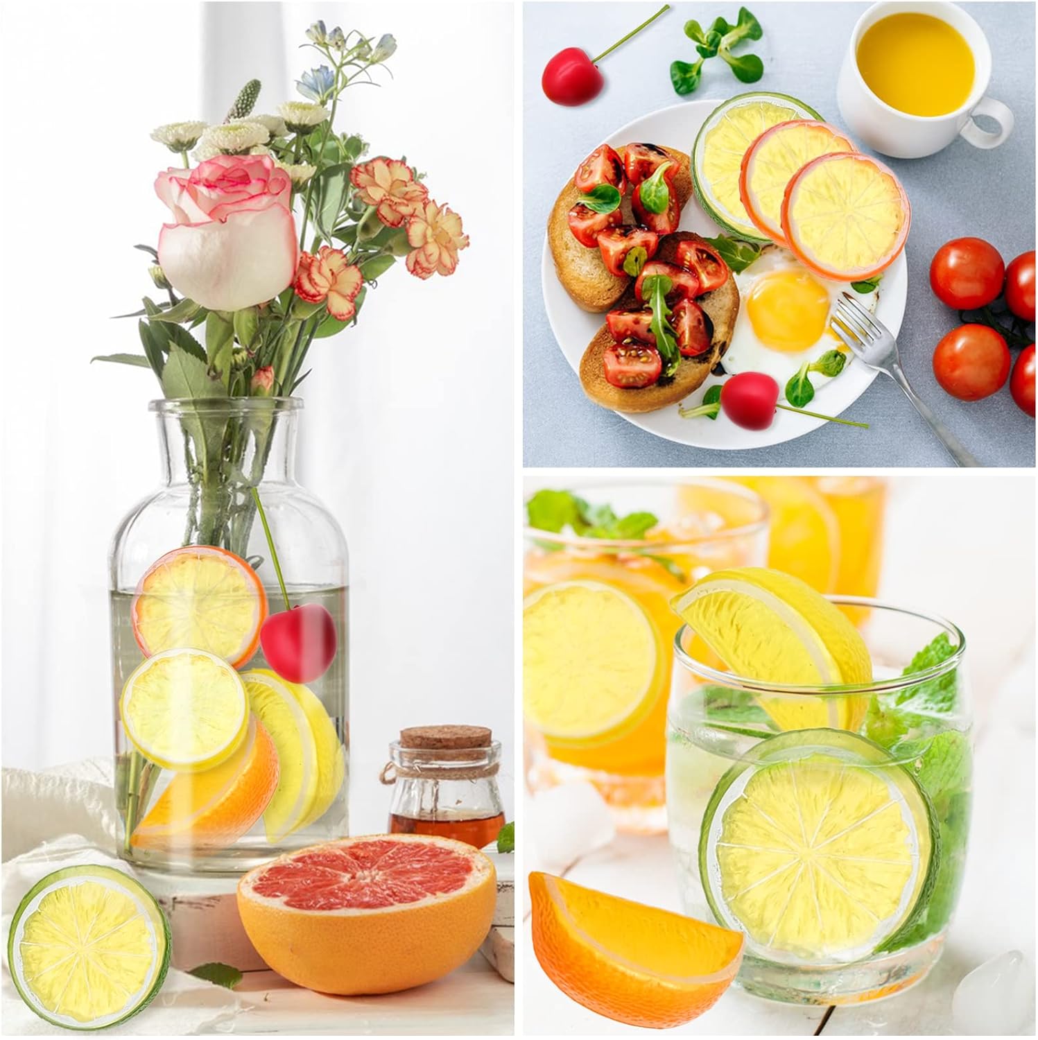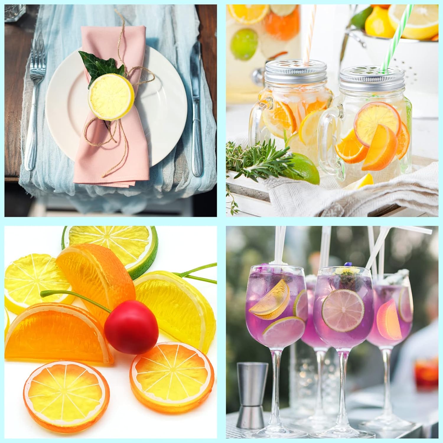 Комплект изкуствени лимони : Блокчетата с резенчета лимон са изработени от екологична, твърда и леко прозрачна пластмаса. Те са водоустойчиви и лесни за почистване. Двустранният дизайн прави тези модели да изглеждат реалистични и живи. Нежният лимонов мотив и ярките цветове внасят жизненост и прохлада в лятото. Те са за многократна употреба.