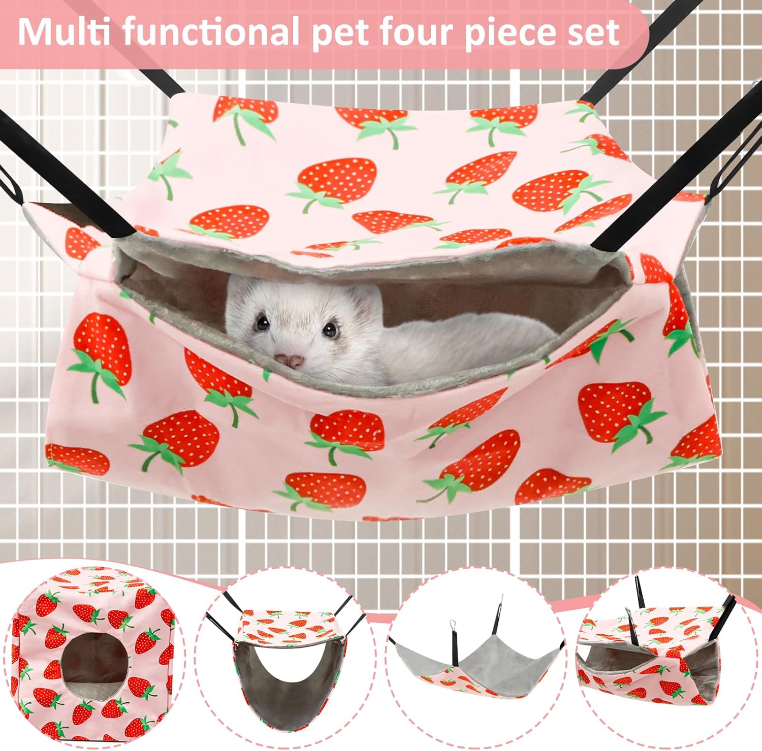 Основни характеристики Забавен комплект: Универсалността в множество сцени се откроява, тъй като се трансформира от уютно гнездо в игрив тунел или хамак, премахвайки нуждата от отделни играчки и стимулирайки ги с различни дейности. Спецификация Име на продукта: Хамак за хамстер Материал: Полиестер Стил (по избор): Розов стил ягода, Зелен стил гъба Размери: Дължина на въжето 11,5 см / 4,53 инча Квадратно висящо гнездо: 28 x 28 см / 11 x 11 инча, Диаметър на отвора 9 см / 3,54 инча; Квадратна подложка: 34 x 34 см / 13,39 x 13,39 x 13,39 инча; Хамак с голям отвор: 26x34 см/10,24x13,39 инча; Гнездо за достъп за домашни любимци: 19x34x13 см/7,48x13,39x5,12 инча. Бележки: 1. Възможно е да има леки разлики между снимката и действителния цвят на продукта. Ще направим всичко възможно да ви покажем точния цвят. 2. Моля, позволете лека разлика в размерите поради ръчно измерване.