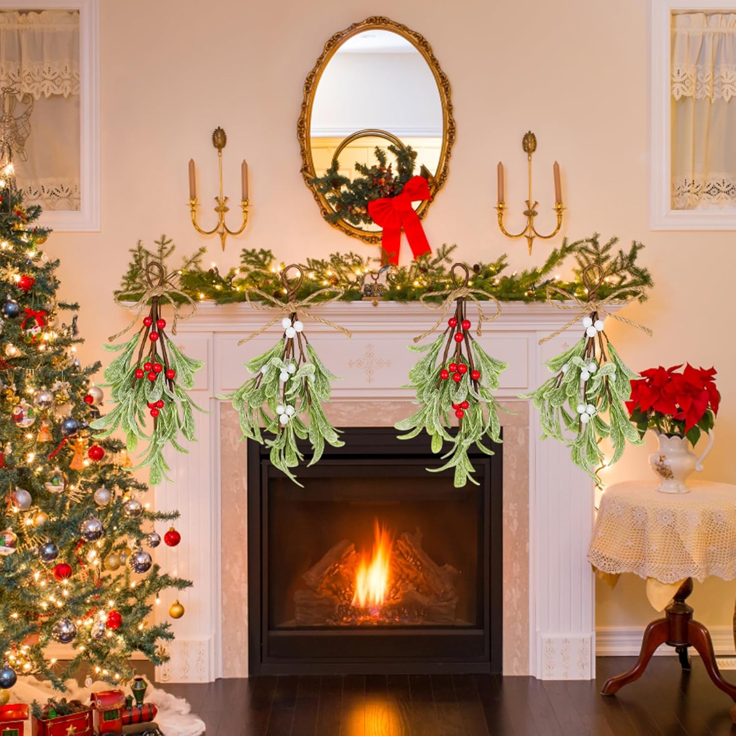 Превърнете дома си в коледен оазис с тези очарователни изкуствени клонки от имел. Коледните декоративни клонки от имел, състоящи се от 4 броя, са идеални за създаване на гирлянди, венци или просто за окачване. Завършени с червени и бели плодове, те добавят празнична атмосфера към всяка стая.