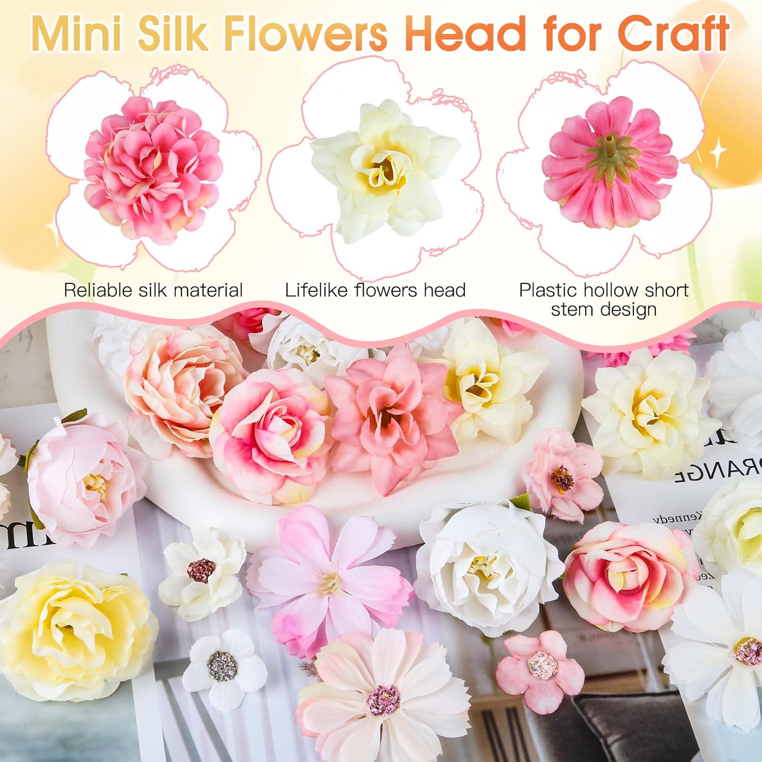 Всяка копринена цветна глава е проектирана с късо кухо стъбло, което е много лесно за използване. Можете да поставите малките изкуствени цветя на стъблото или да ги залепите на стената.
