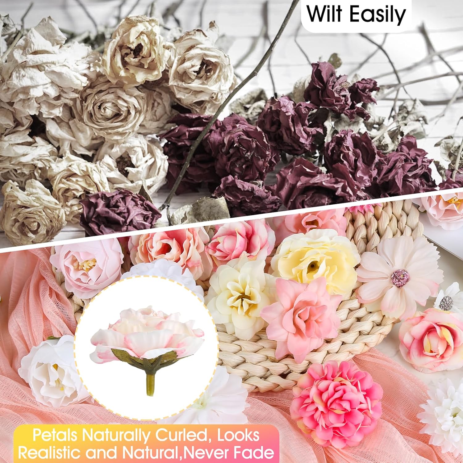Изкуствените цветя са изработени от висококачествена копринена тъкан и пластмаса, които не избледняват, не се чупят или не се чупят лесно и могат да се използват повторно за дълго време.