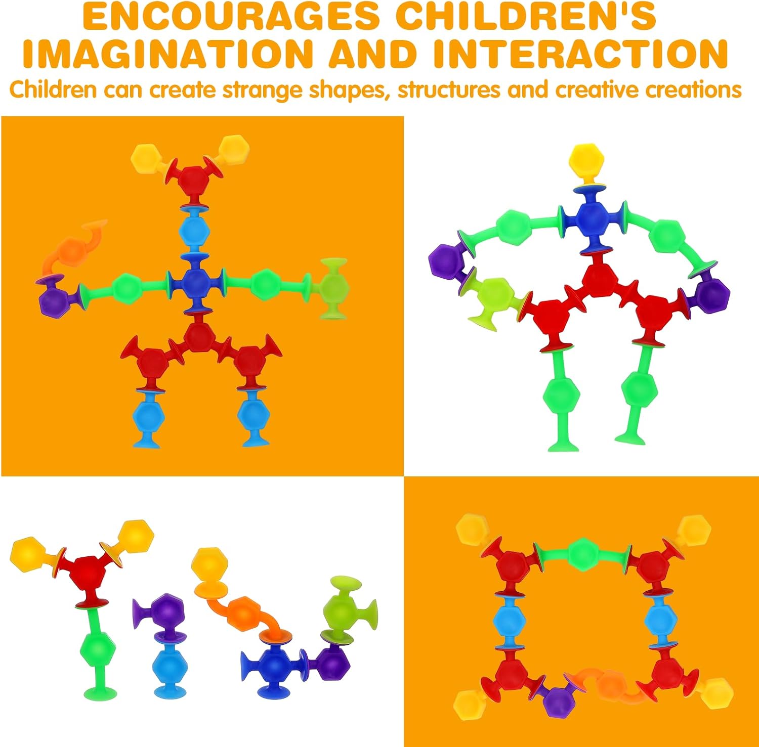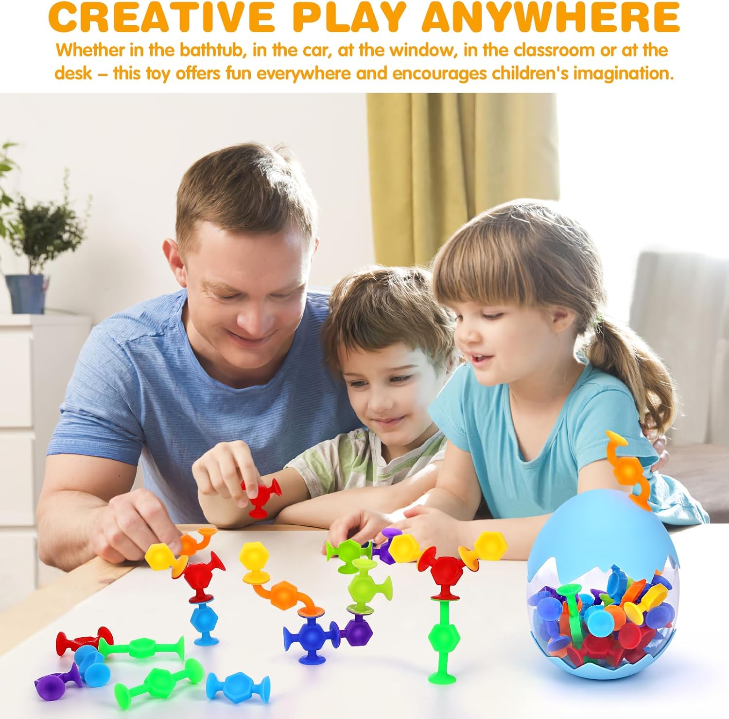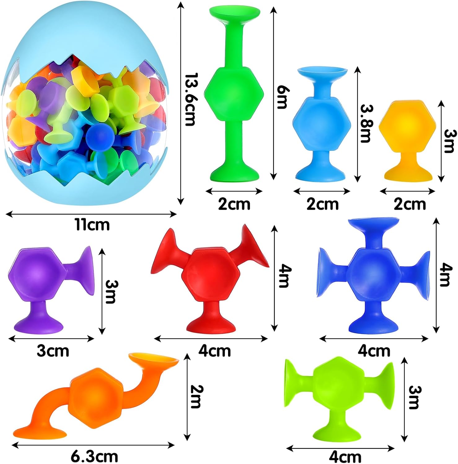 ГИГАНТСКИ КОНСТРУКЦИОНЕН ПОТЕНЦИАЛ Играчката с вендуза предлага разнообразие от строителни елементи, които могат да се залепват за гладки повърхности и да се съединяват. С 48 части в шест цвята и седем форми, тя позволява на децата да създават креативни конструкции, независимо дали във ваната, на прозореца или в класната стая.