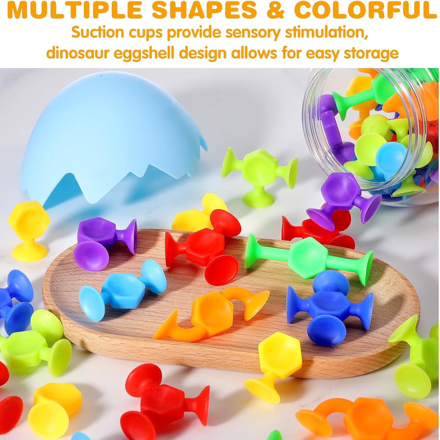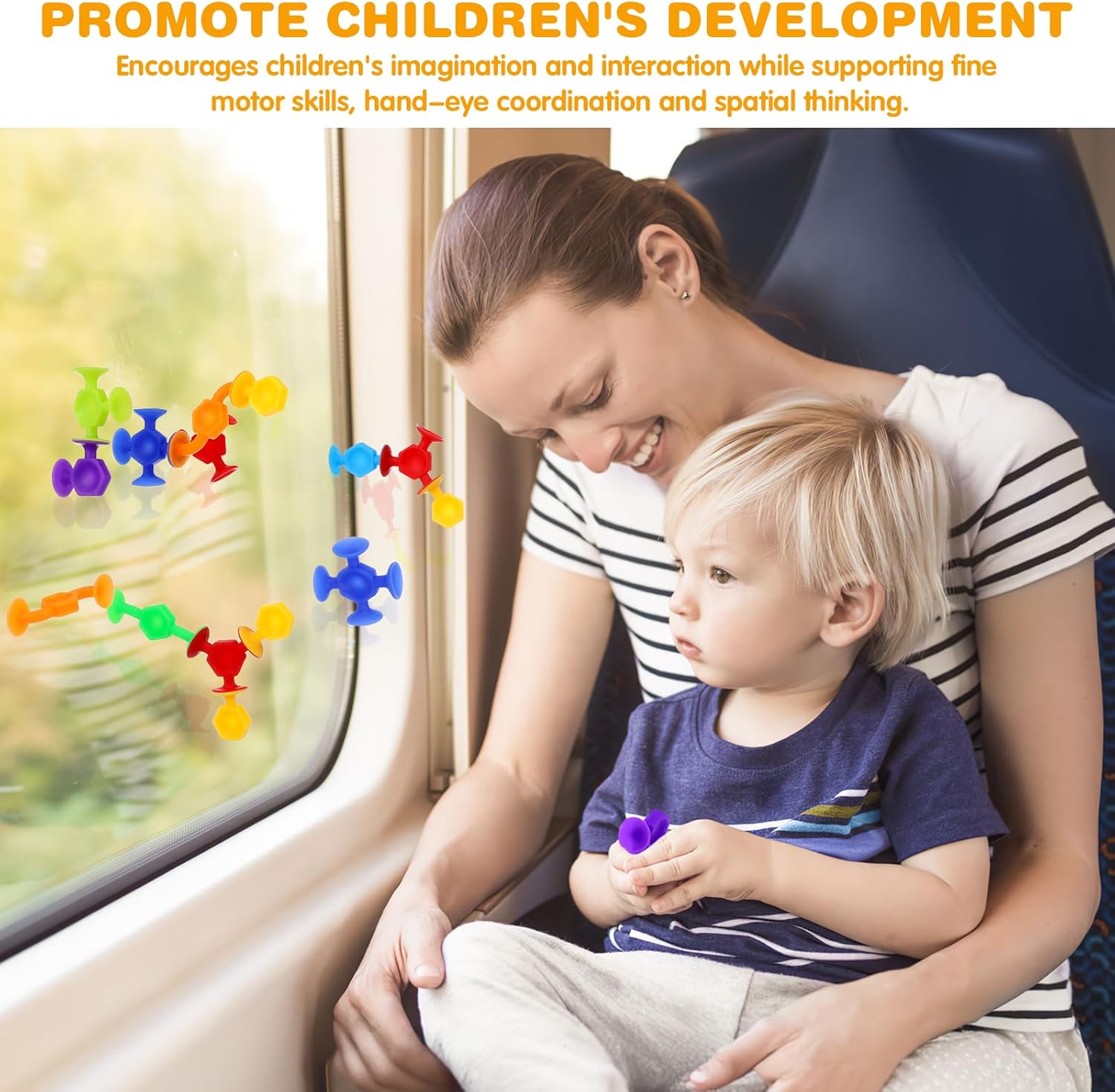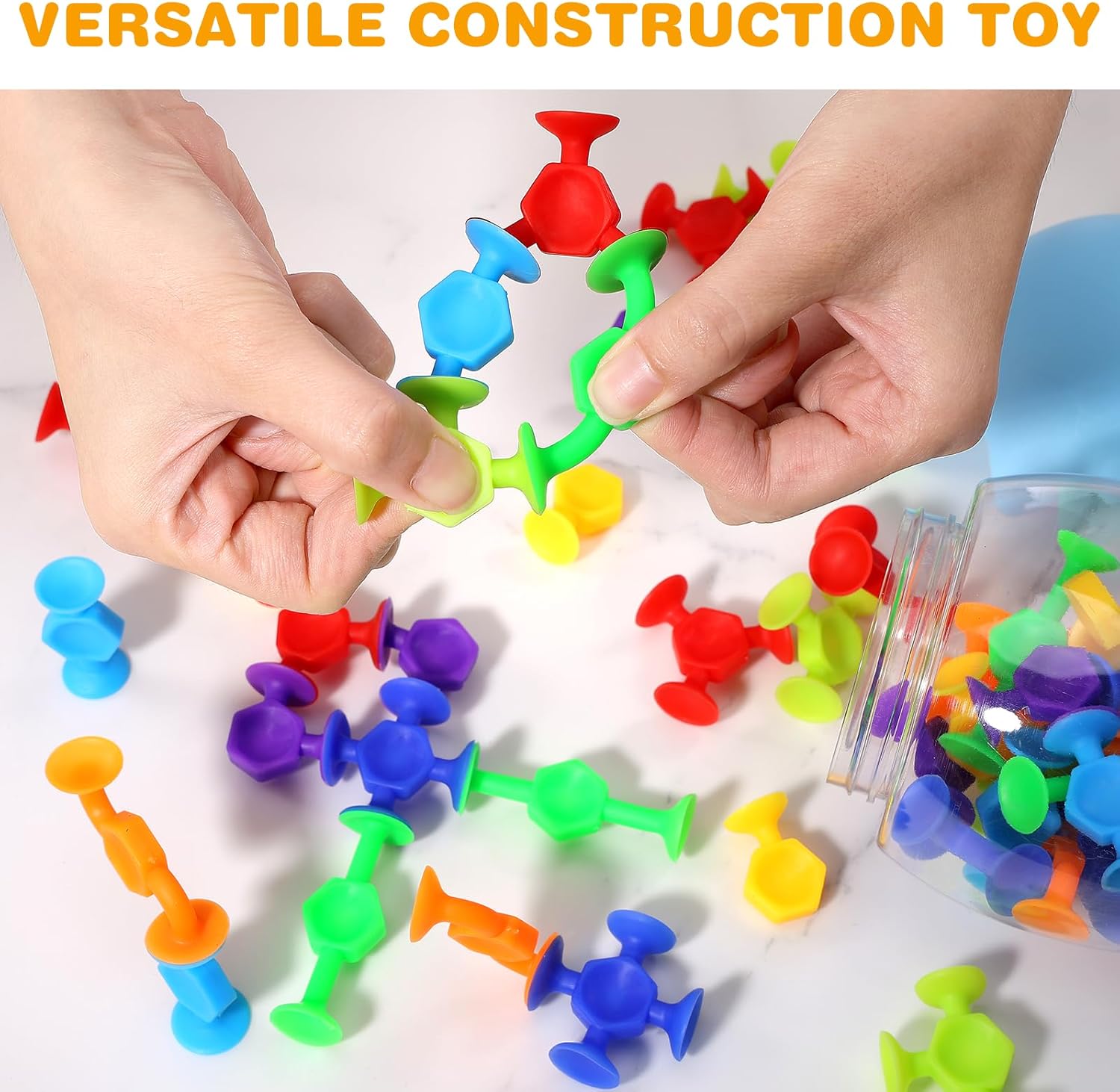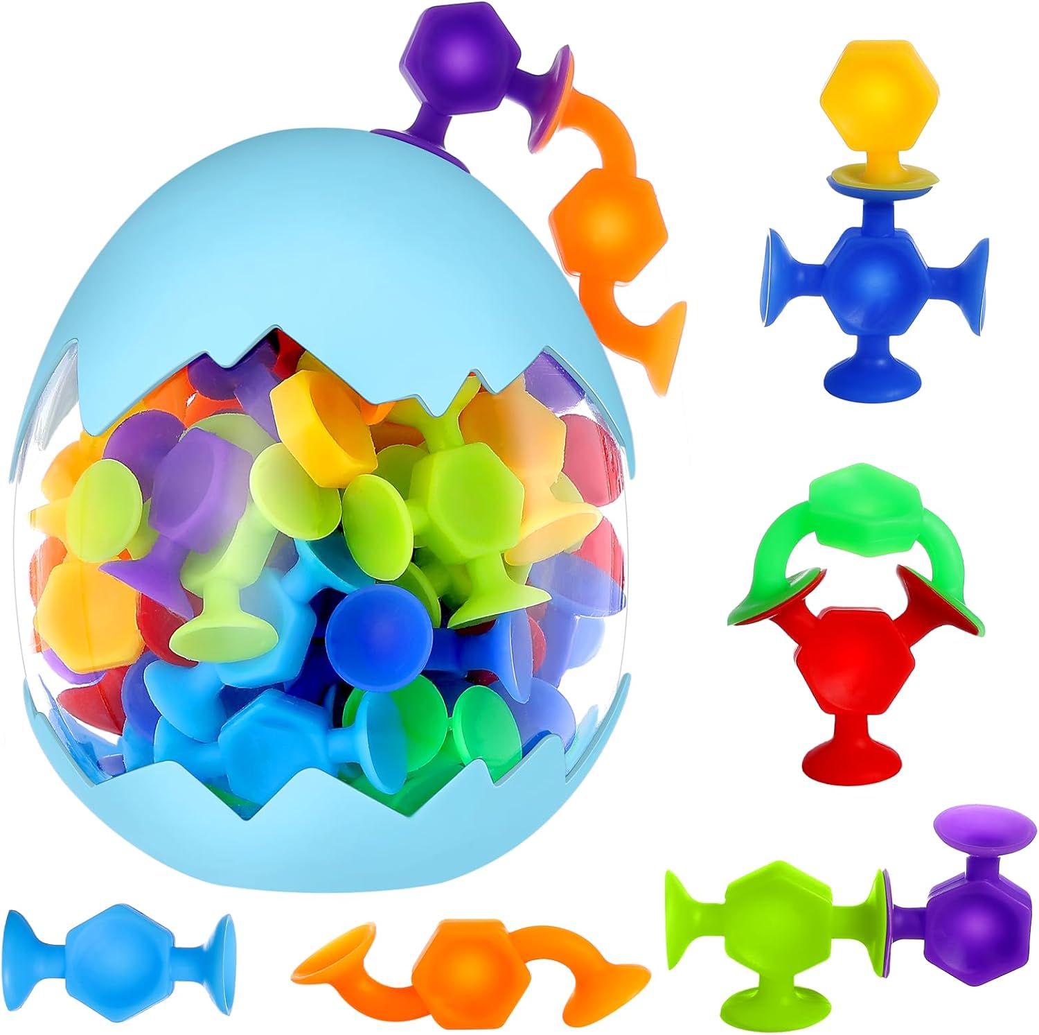 ГИГАНТСКИ КОНСТРУКЦИОНЕН ПОТЕНЦИАЛ Играчката с вендуза предлага разнообразие от строителни елементи, които могат да се залепват за гладки повърхности и да се съединяват. С 48 части в шест цвята и седем форми, тя позволява на децата да създават креативни конструкции, независимо дали във ваната, на прозореца или в класната стая.