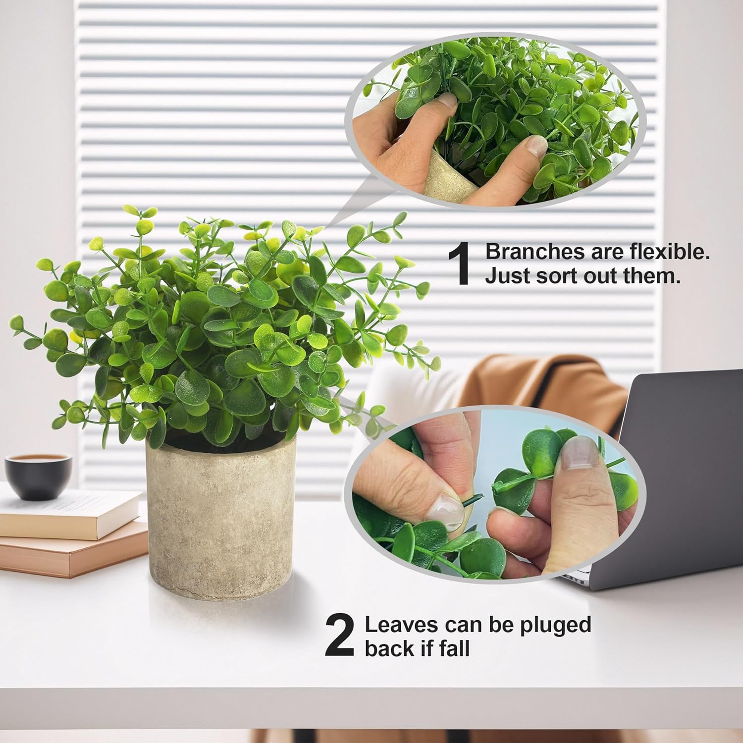 Функции Нашите изкуствени растения са реалистични и чудесни за декорация на мебели и офис, можете да ги поставите на бюра, масички за кафе, первази на прозорци и други.