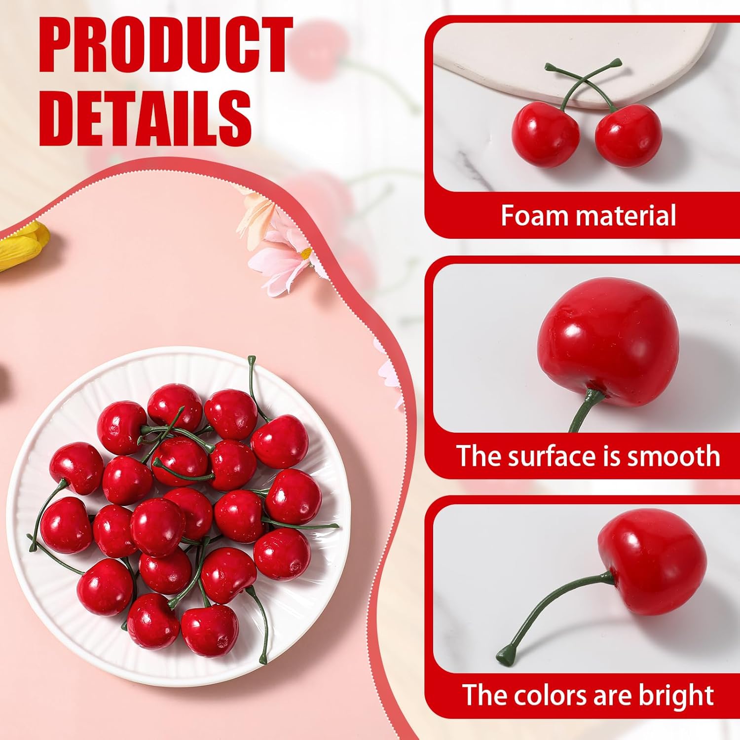• Висококачествени материали Нашите изкуствени череши са изработени от висококачествена пяна с лъскава повърхност, която е лека и гладка. Текстурата е реалистична, цветовете ярки, не избледняват и могат да се съхраняват дълго време.