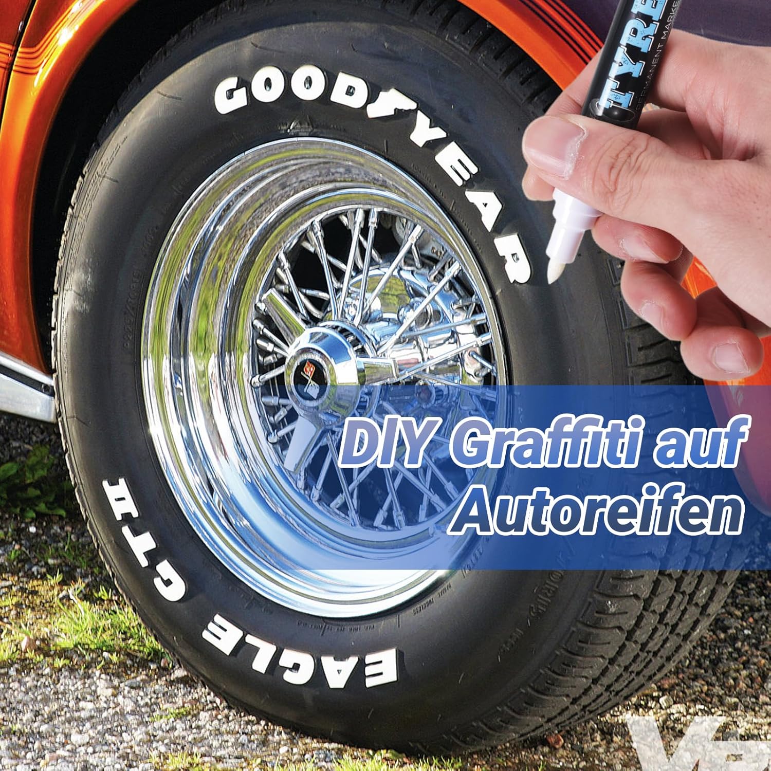 - Този маркер за автомобилни гуми е идеален за декорация на гуми, за да направи колата ви да изглежда по-стилна и динамична. Можете също така да нанасяте графити върху различни предмети: метал, стъкло, пластмаса, плат, дърво и др.