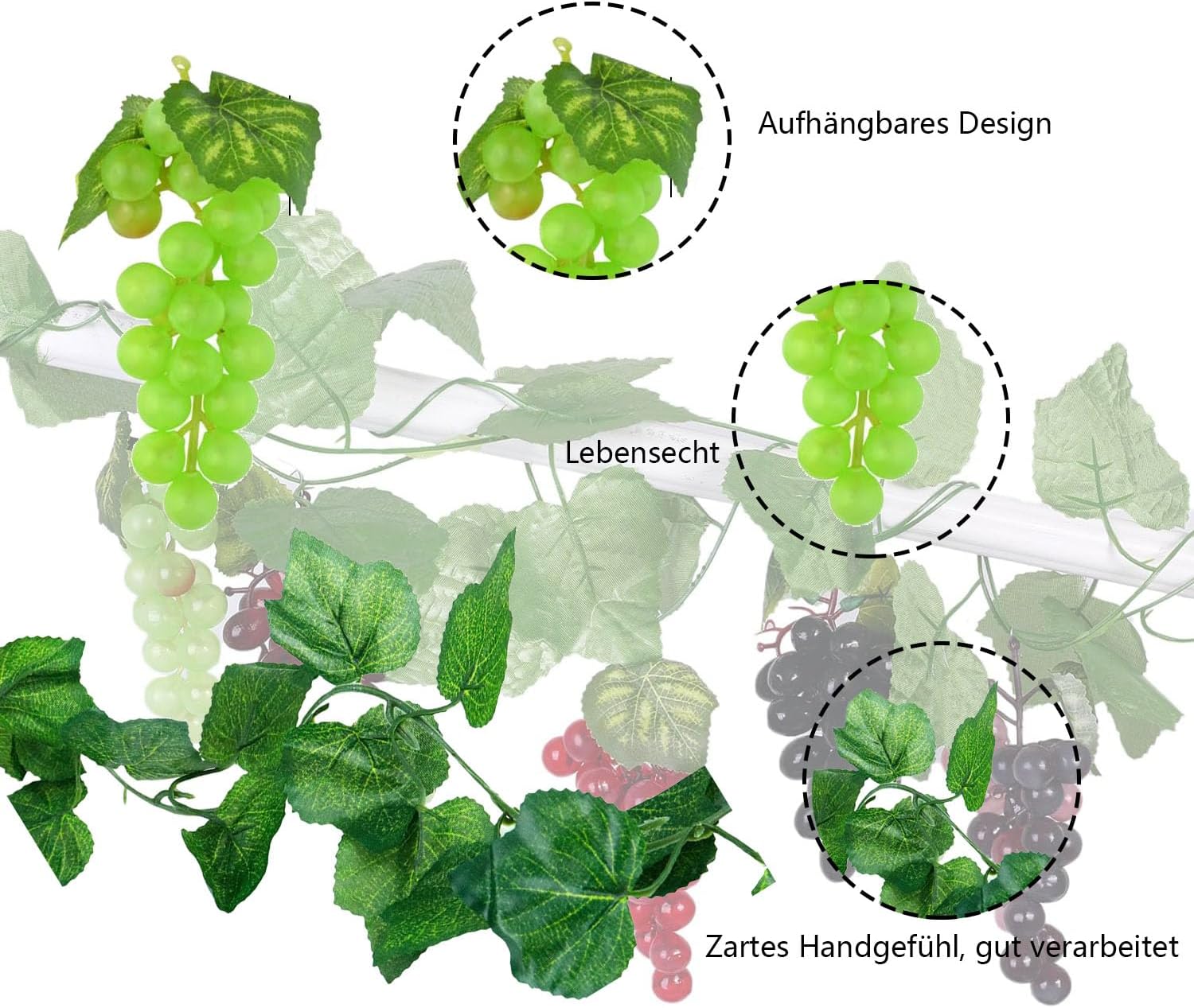 • Широка гама от приложения: изкуственото грозде е подходящо за представяне на плодове, декорация на вино, изработка на гирлянди, презентация на шкафове, декорация на дома, декорация на пазари, декорация на партита, декорация на купи, учебни помагала, реквизит за игри, предучилищно образование и др.