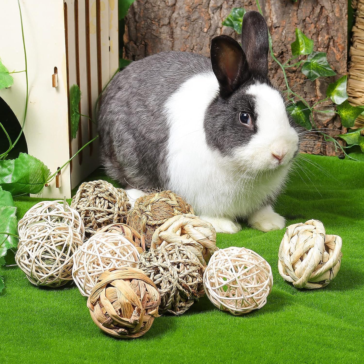 Пакет от 8 дъвчащи топки, играчка за дъвчене за малки животни, играчка с трева за зайци, плетена играчка за малки животни, дъвчащи топки за грижа за зъбите, топка сено за зайци, чинчили хамстери
