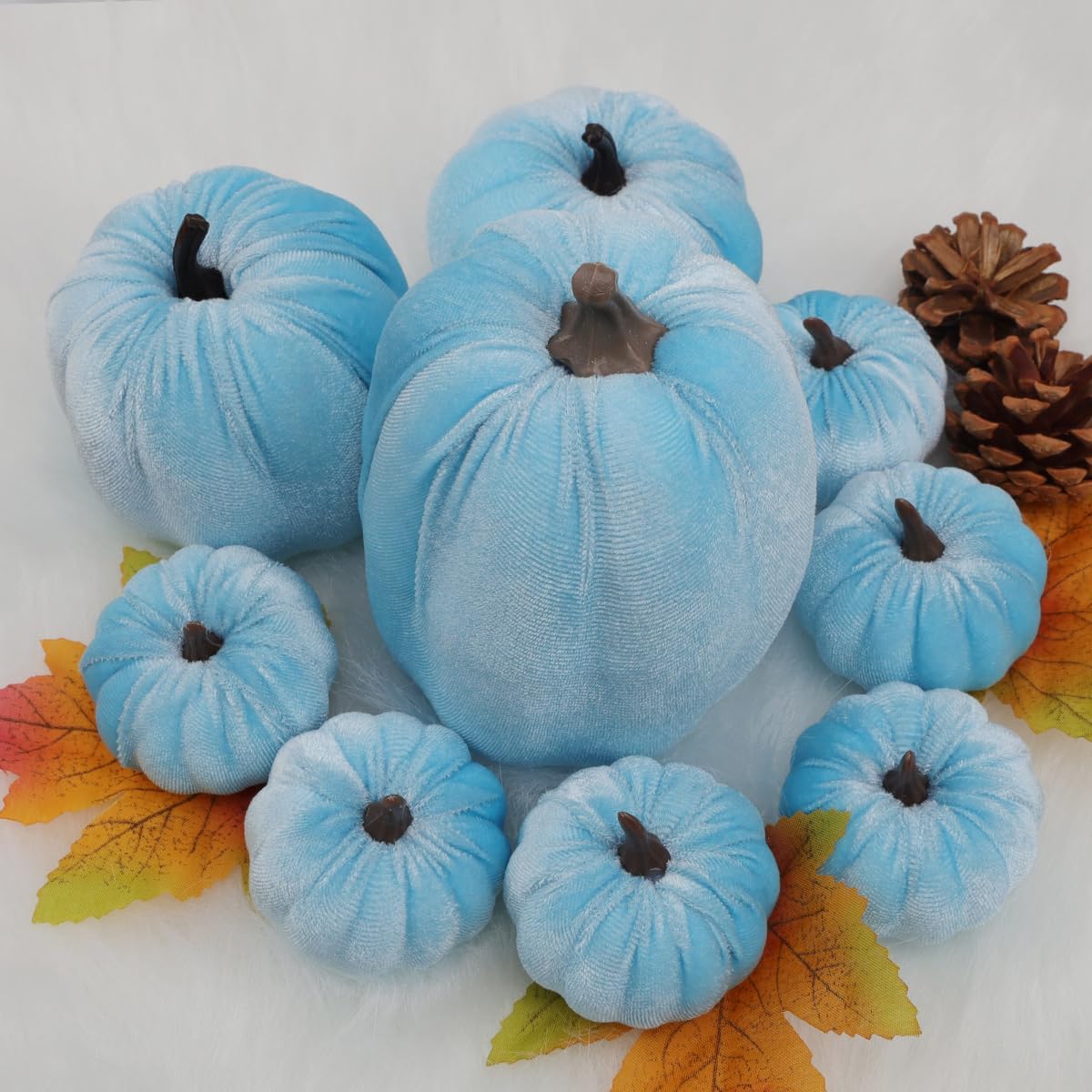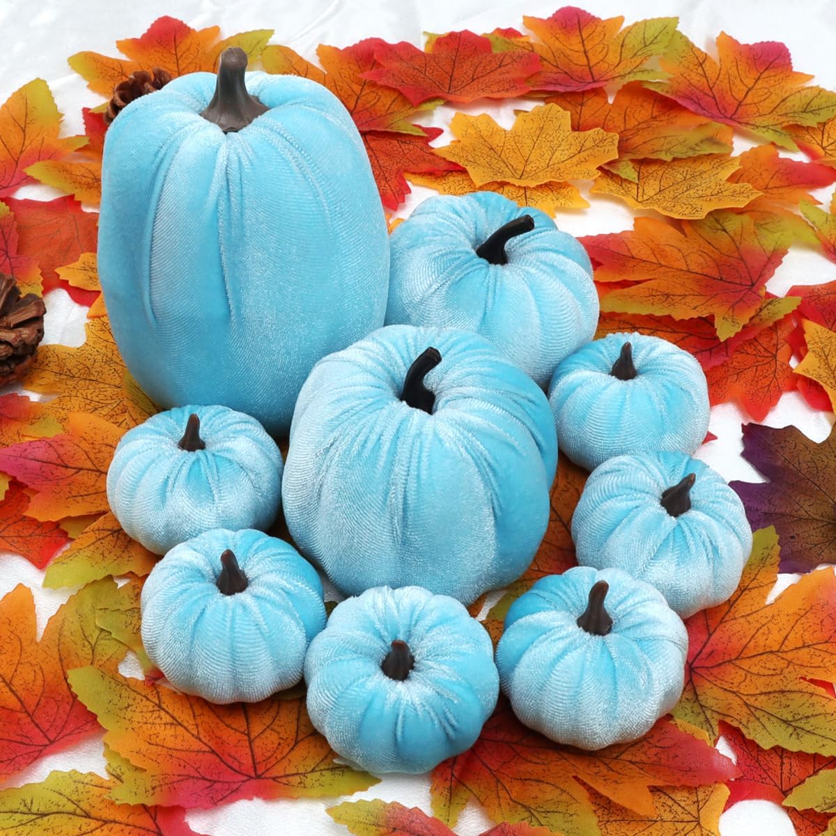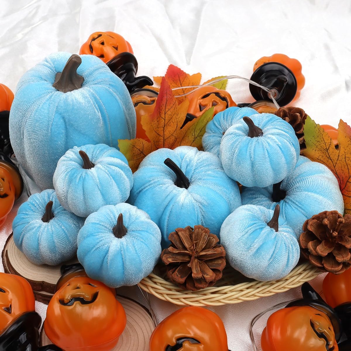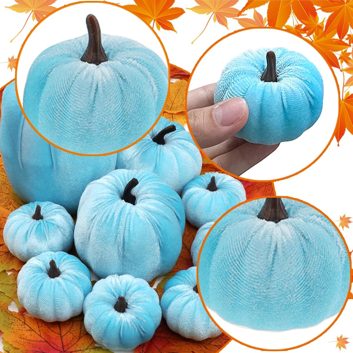 Пакет от 9 тикви за декорация, кадифена изкуствена материя, малки тикви, асорти, модерна декорация за Хелоуин, есенно палто, централни елементи за сватбено парти, синьо-зелени