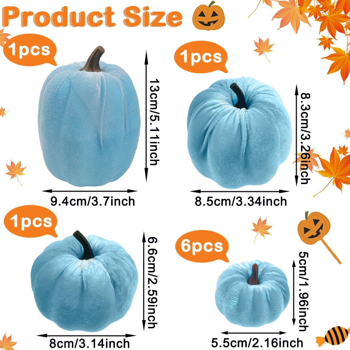 • [Размер на комплект тикви от плат] Тиквите от плат се предлагат в 4 размера. 6 броя са 5,5 см/2,1 инча, 1 брой е 8 см/3,1 инча, 1 брой е 9 см/3,5 инча и 1 брой е 9,5 см/3,7 инча. Кадифените комплекти тикви се предлагат в различни размери, така че можете да ги добавите към есенен венец, есенна цветна аранжировка или просто да ги изложите на всяка маса.