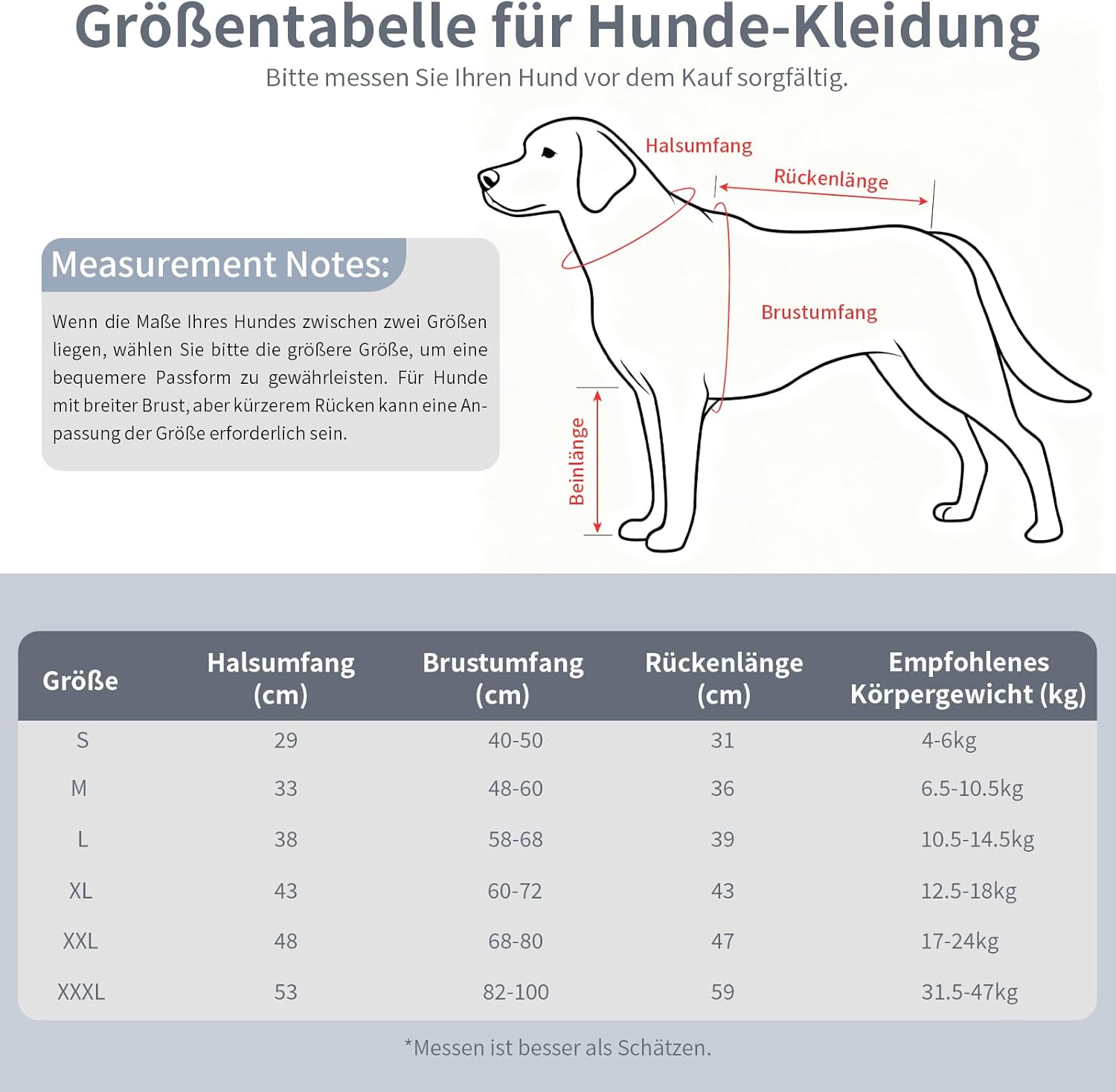 Модерна жилетка за кучета със светлоотразителни ленти. Функция за безопасност: светлоотразителните ленти на нашийника осигуряват добра видимост на вашето куче в тъмното или здрач. Оптимална топлина: Подсилена с топла поларена подплата. Идеална за тренировки, дейности на открито, а също и за употреба на закрито в студените есенни и зимни дни. Най-висок комфорт: Много мек материал за удобно носене. Практично боравене: Лесно обличане и събличане, както и удобно регулиране на прилягането благодарение на закопчалката. Лесна поддръжка: Може да се пере в пералня (препоръчва се деликатна програма) или на ръка. Може да се суши в центрофуга или на въздух. Избор на размер: Подходяща за малки до големи породи кучета, като голдън ретривър, лабрадор, хъски, самоед. Важна забележка относно размера: Моля, измерете точно обиколката на врата, обиколката на гърдите (в най-широката точка) и дължината на гърба (от основата на врата до основата на опашката) на вашето куче преди покупка. Сравнете тези измервания с нашата таблица с размери. Съдържание на опаковката: 1 x Яке за куче