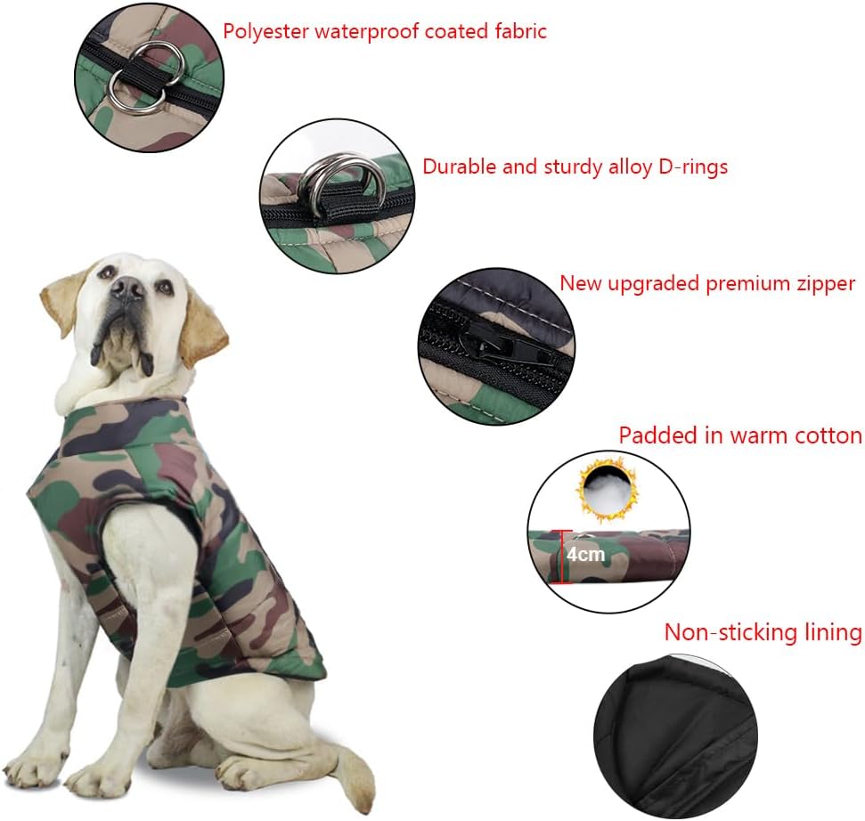 • Запазва топлината: Изработено от водоустойчив полиестер с покритие, ветроустойчиво и устойчиво на сняг. Палтото за кучета е подплатено с топъл памук, така че кучето ви да може да се адаптира към студеното време и да играе на открито.