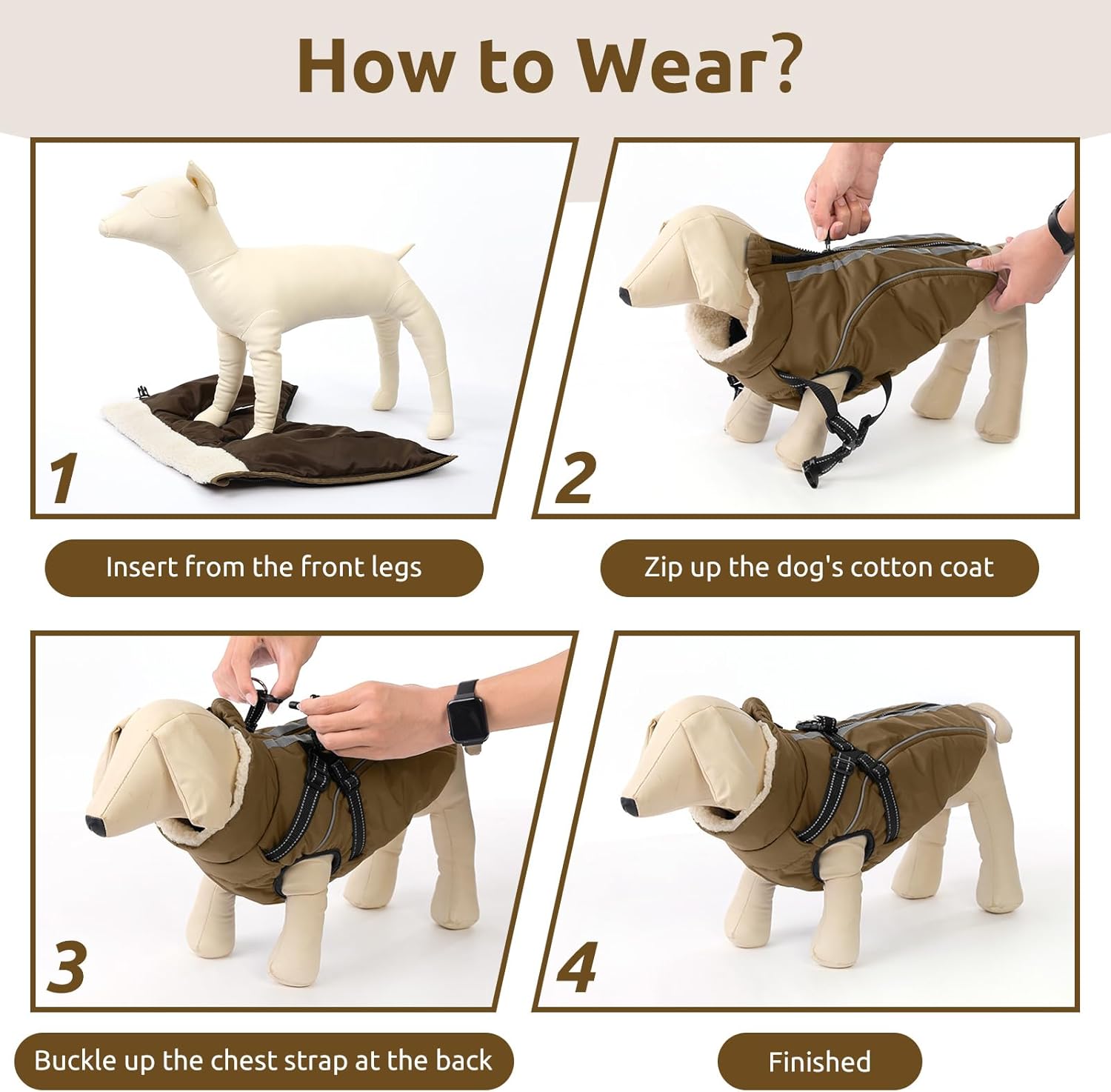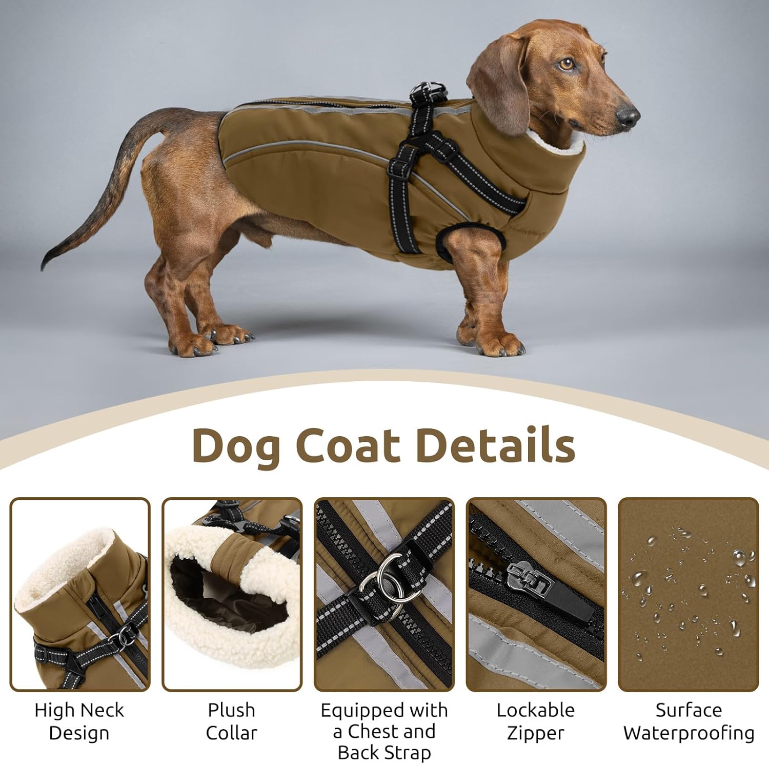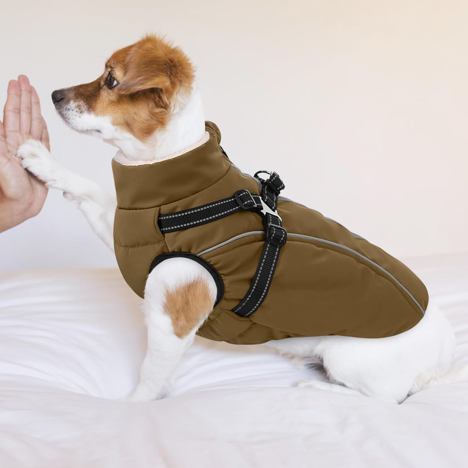 Палто за кучета, Яке за кучета, Топло зимно палто с цип, Ветроустойчиво и ветроустойчиво със светлоотразителни ленти и нагръдна презрамка за малки, средни и големи кучета, Кафяво, M