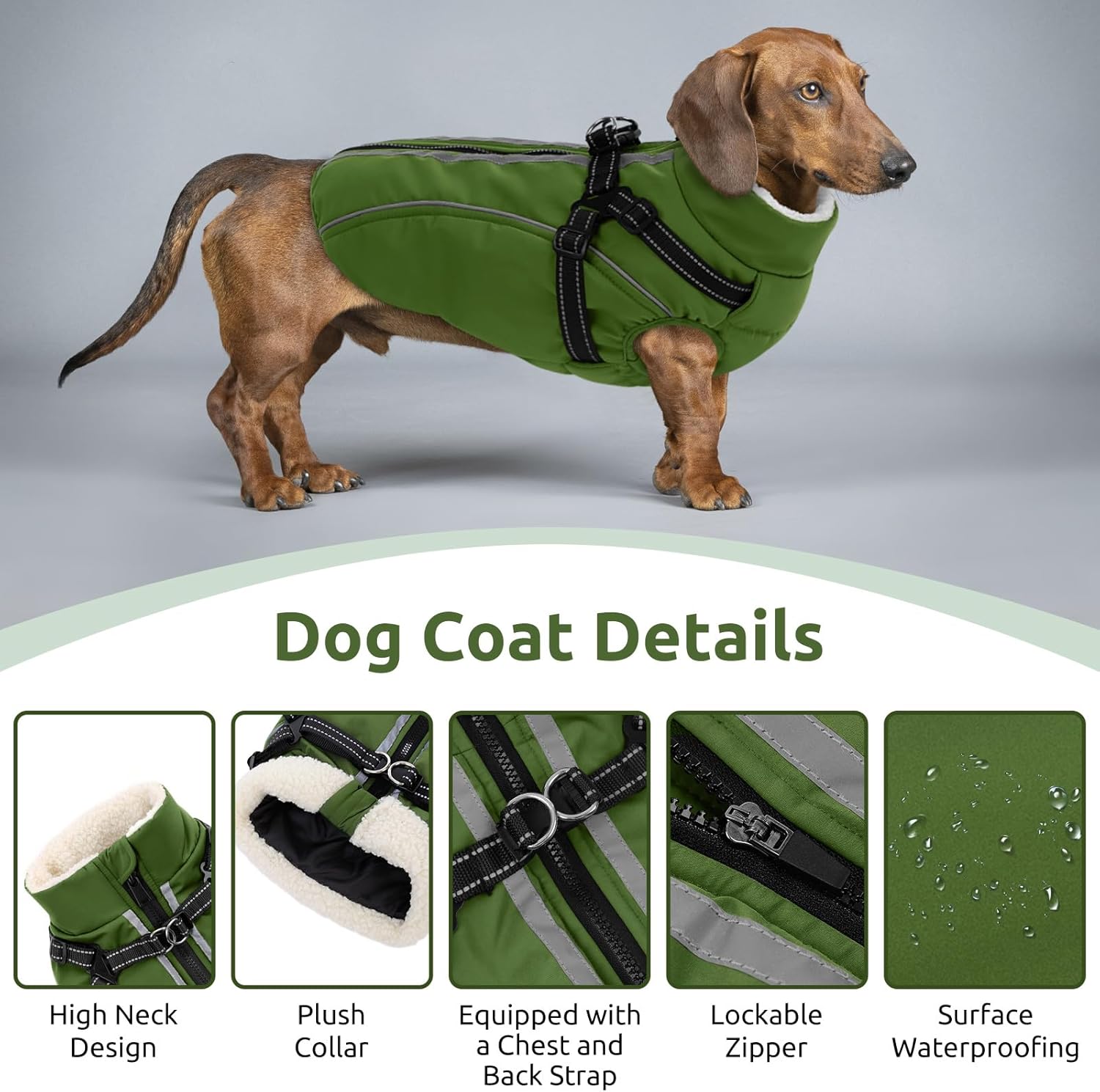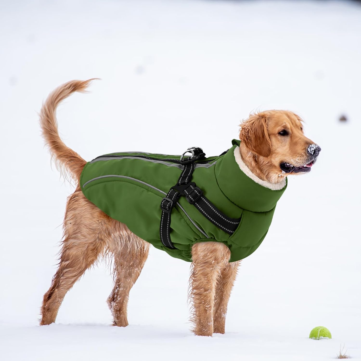 Палто за кучета, Яке за кучета, Топло зимно палто с цип, Ветроустойчиво и ветроустойчиво със светлоотразителни ленти и нагръдна презрамка за малки, средни и големи кучета, Зелено, XL