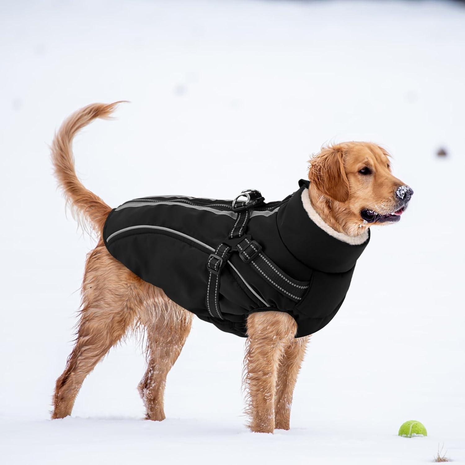 Палто за кучета, Яке за кучета, Топло зимно палто с цип, Ветроустойчиво и ветроустойчиво със светлоотразителни ленти и презрамка за гърди за малки, средни и големи кучета, Черно, M