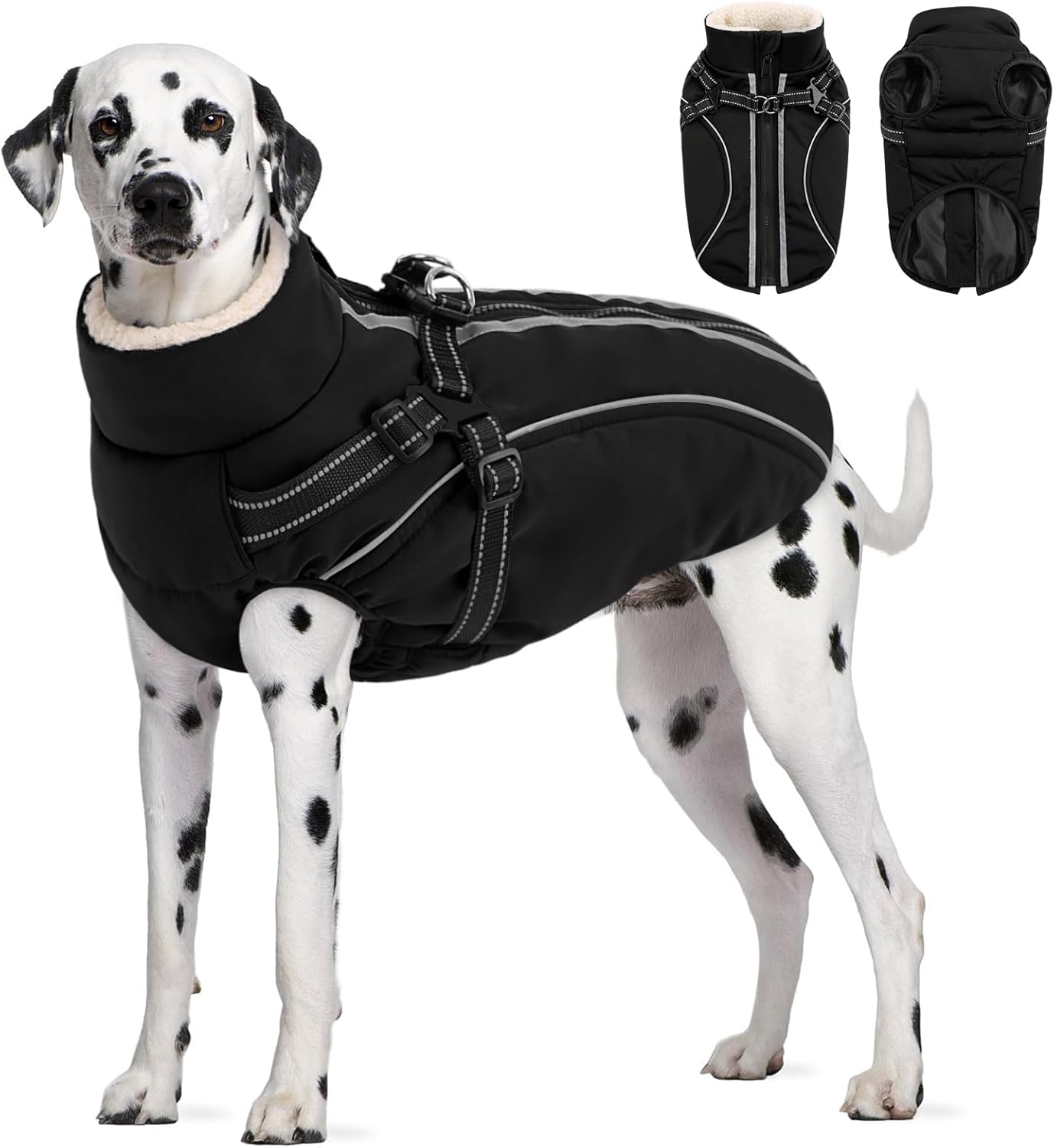 Палто за кучета, Яке за кучета, Топло зимно палто с цип, Ветроустойчиво и ветроустойчиво със светлоотразителни ленти и презрамка за гърди за малки, средни и големи кучета, Черно, XXL