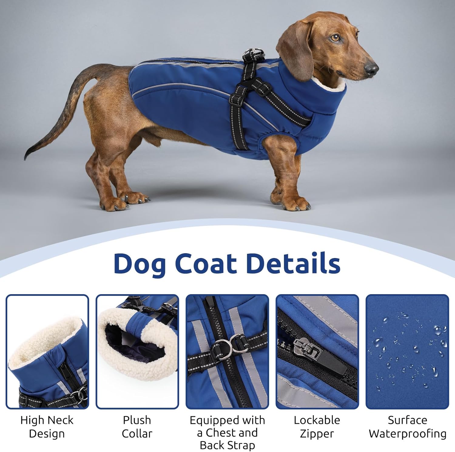 Палто за кучета, Яке за кучета, Топло зимно палто с цип, Ветроустойчиво и ветроустойчиво със светлоотразителни ленти и презрамка за гърди за малки, средни и големи кучета, Синьо, XS