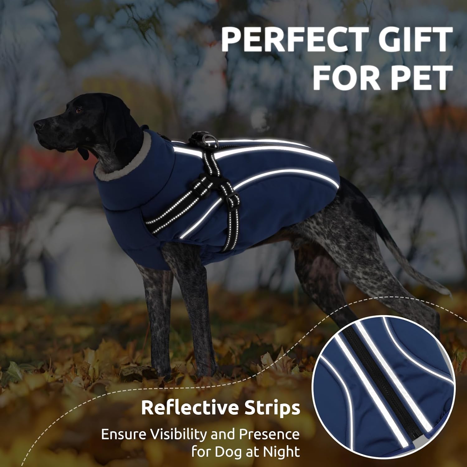 • Функции за безопасност: светлоотразителните ленти на зимното яке увеличават видимостта на вашето куче. Те отразяват светлината от уличните лампи и фаровете, така че можете да се разхождате спокойно дори в тъмното.