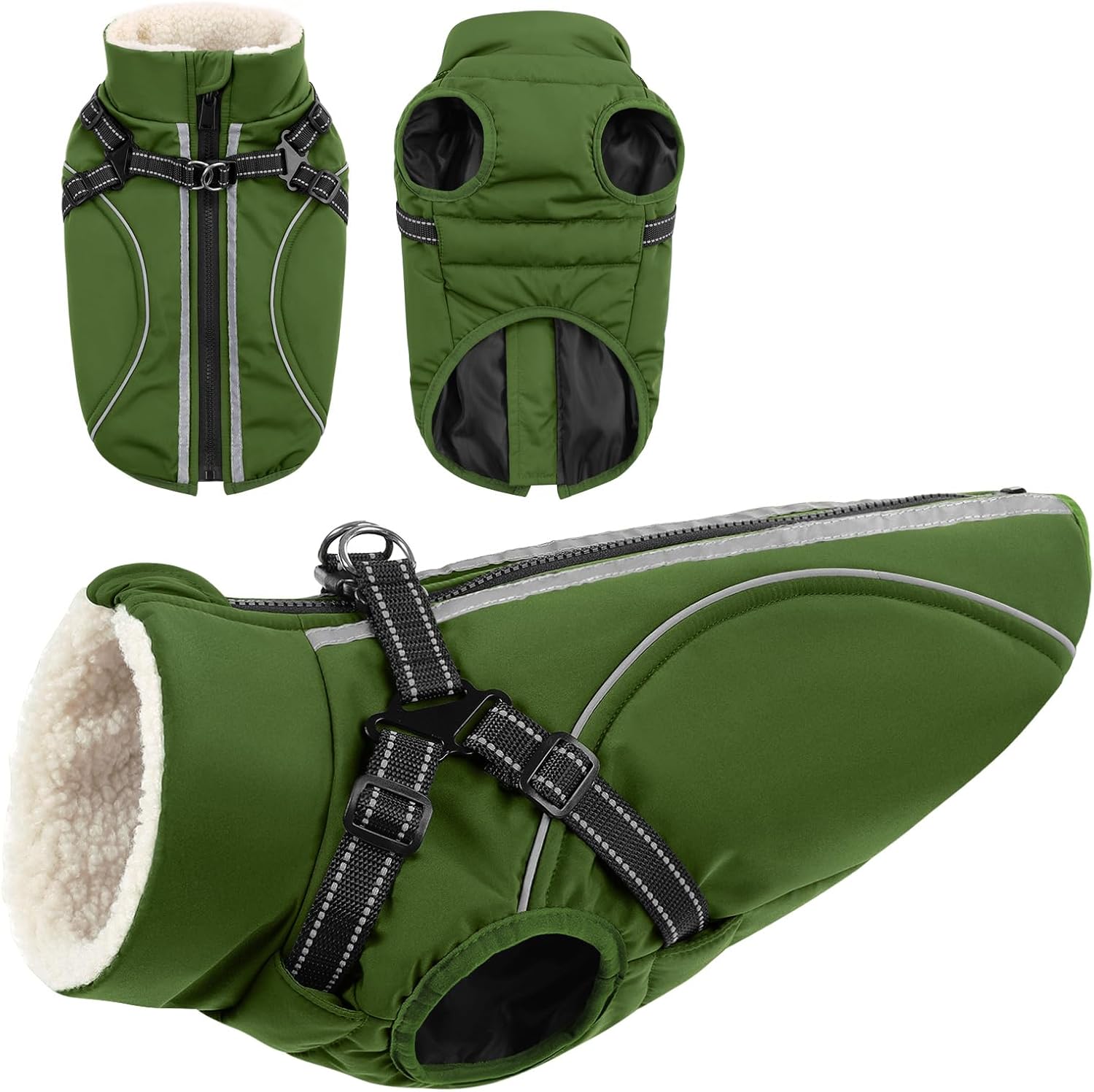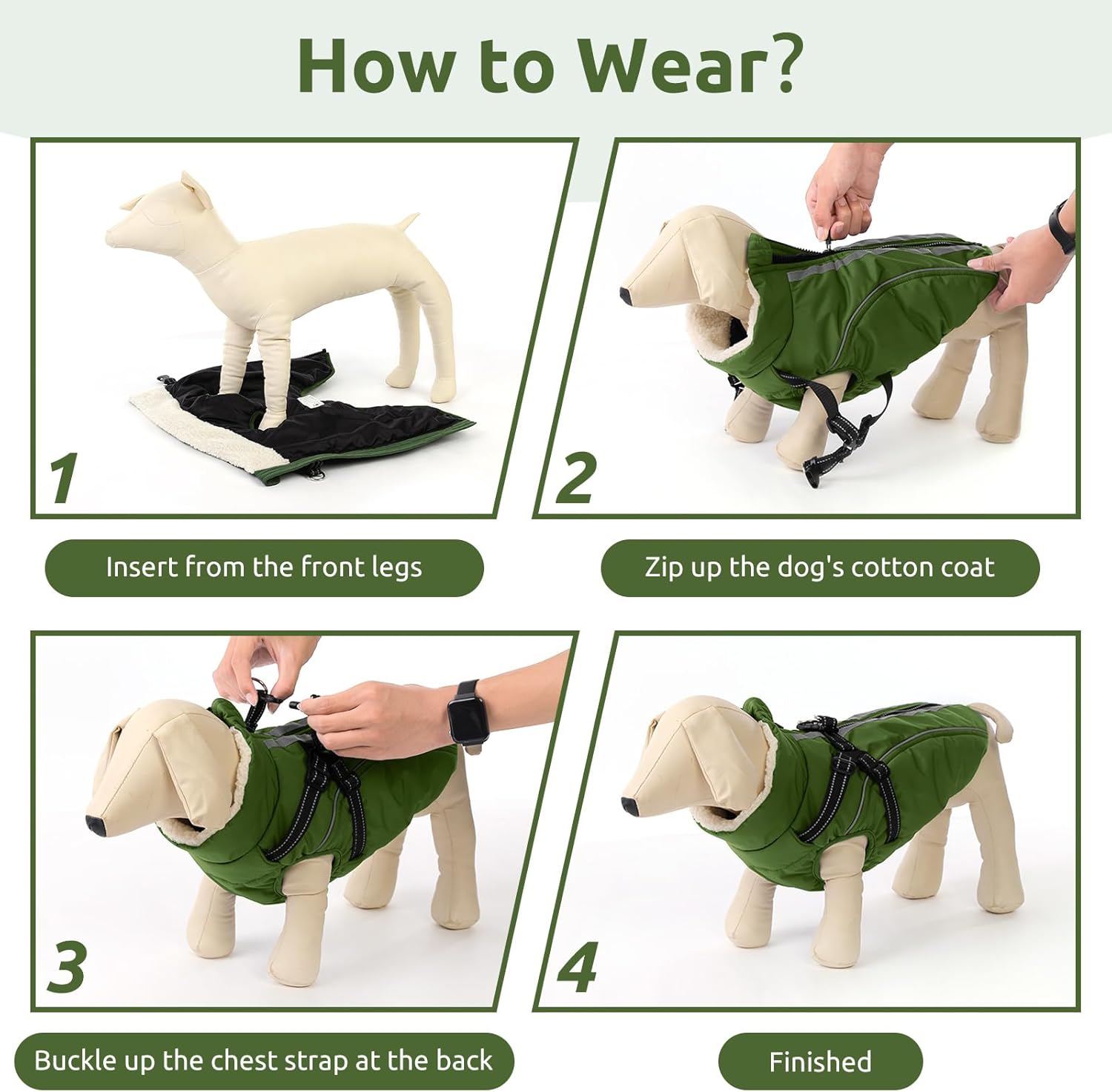 Палто за кучета, Яке за кучета, Топло зимно палто с цип, Ветроустойчиво със светлоотразителни ленти и презрамка за гърди за малки, средни и големи кучета, Зелено, XS