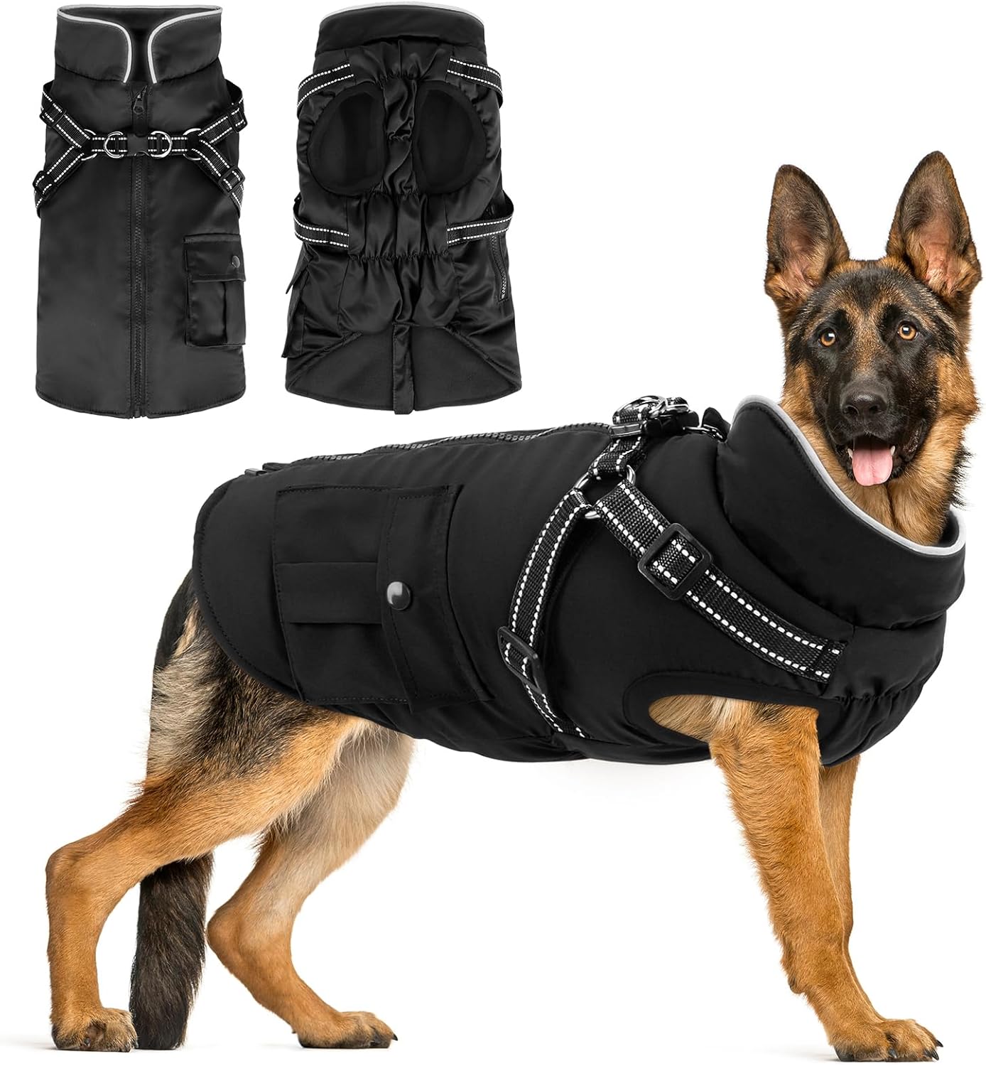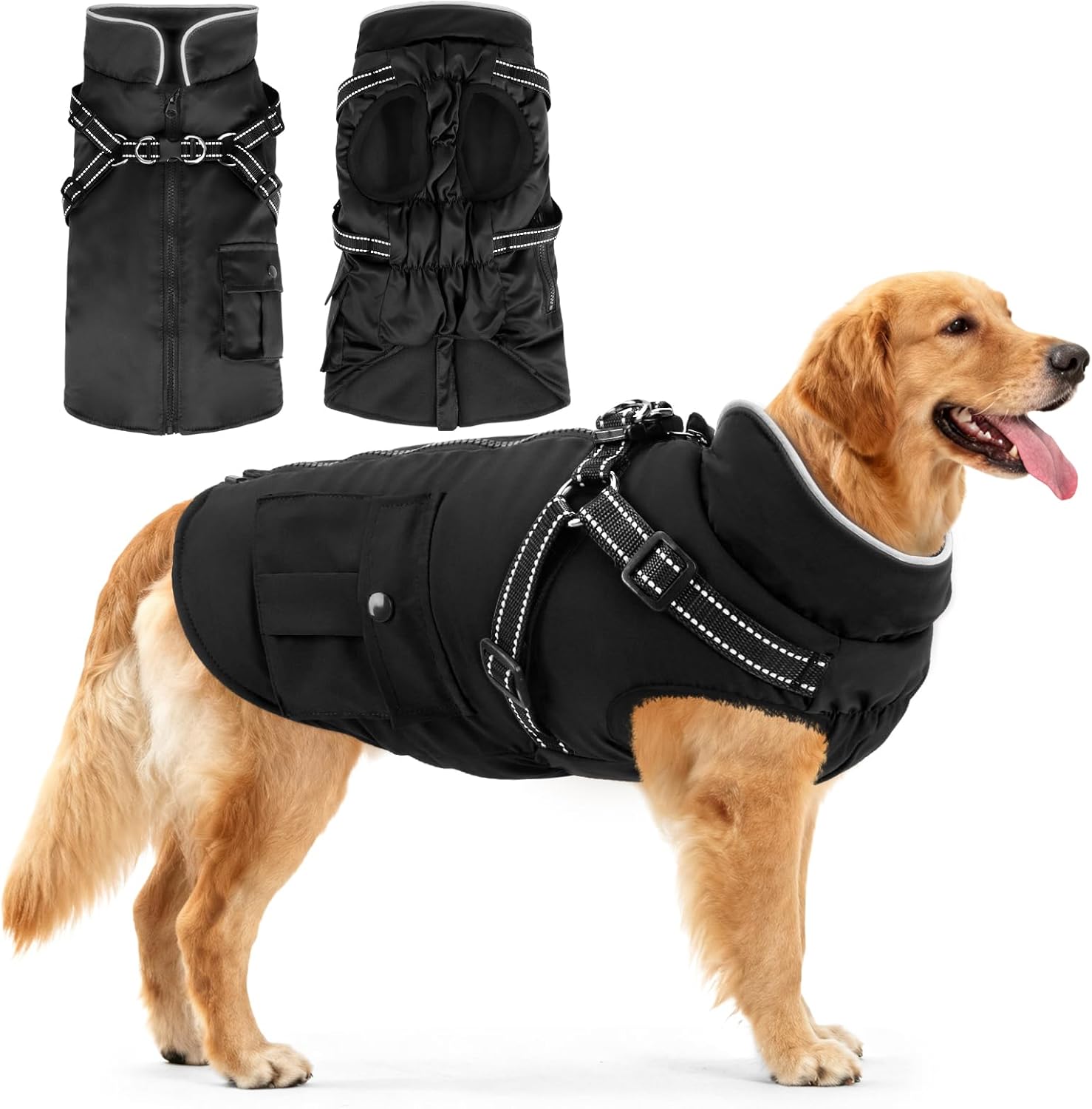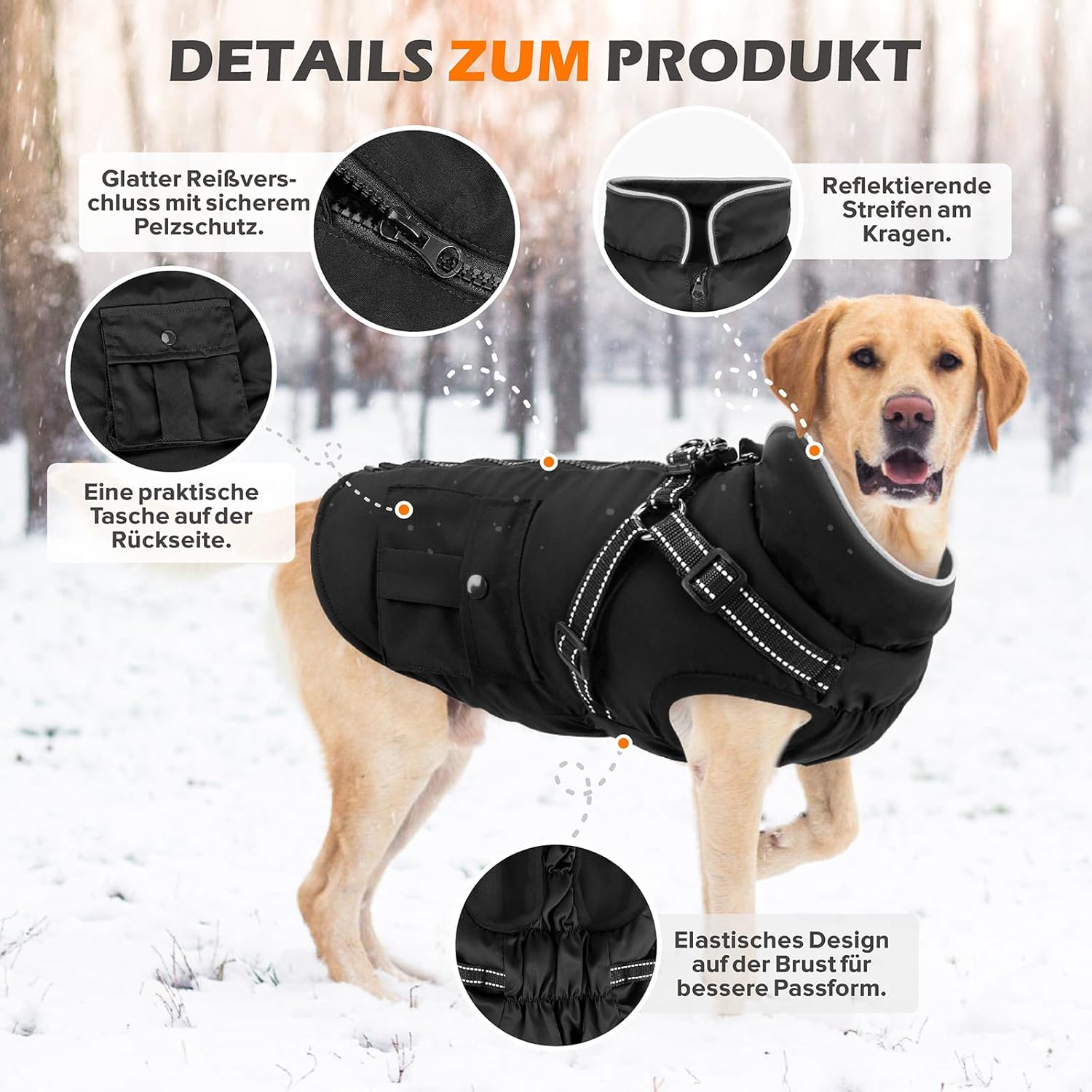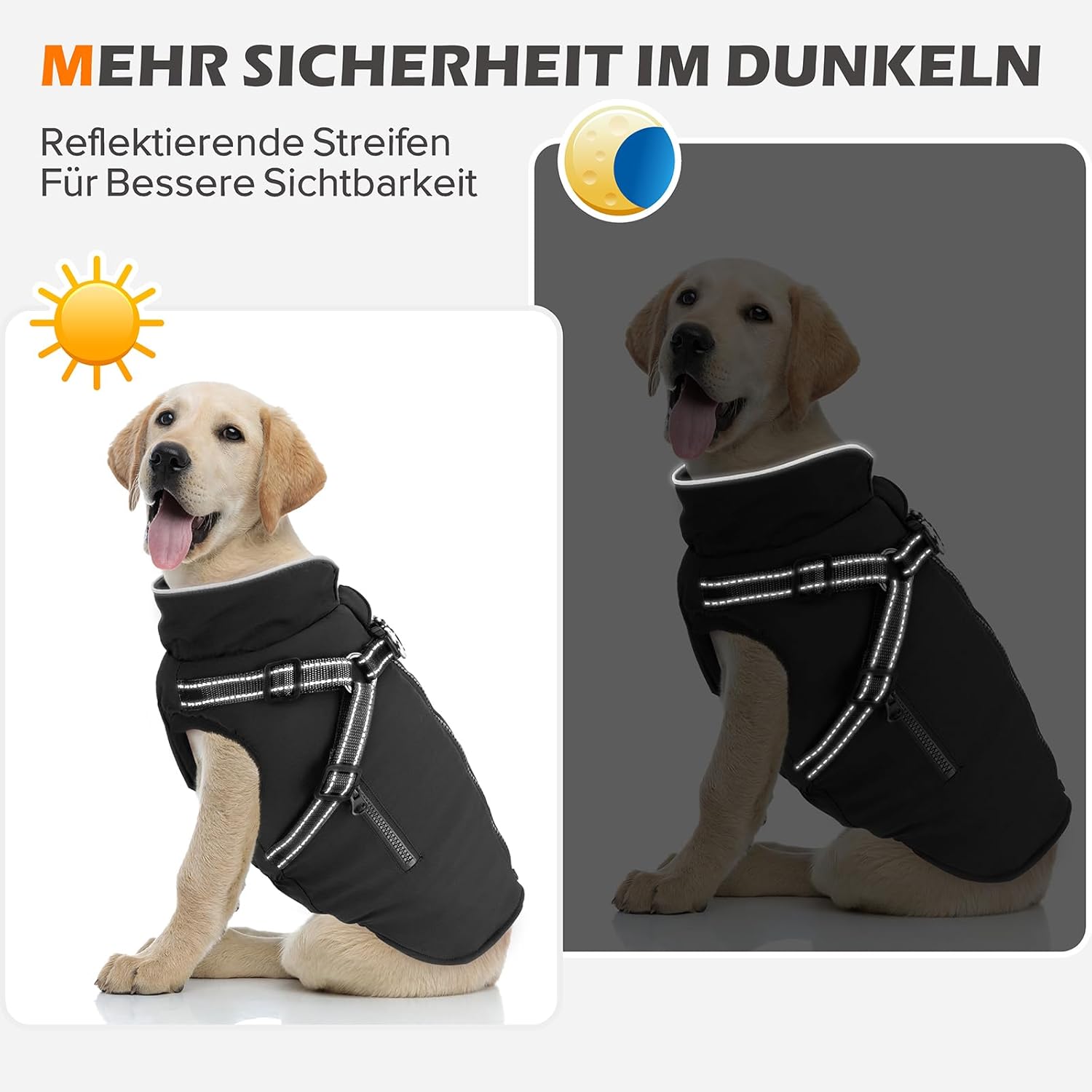 Палто за кучета, Яке за кучета, Зимно палто за големи кучета, Зимно палто за кучета с нагръдник, Зимно палто за кучета, Безръкавна жилетка с памучна подплата, Водоустойчива, Топла, Светлоотразителна, Черно, XXL