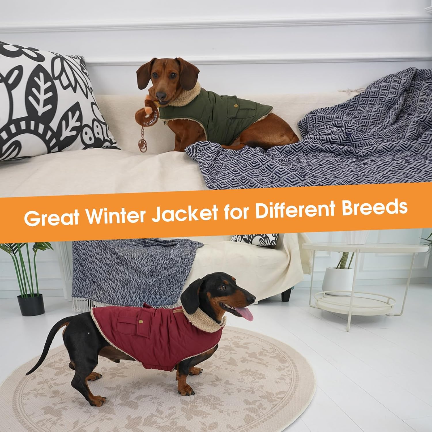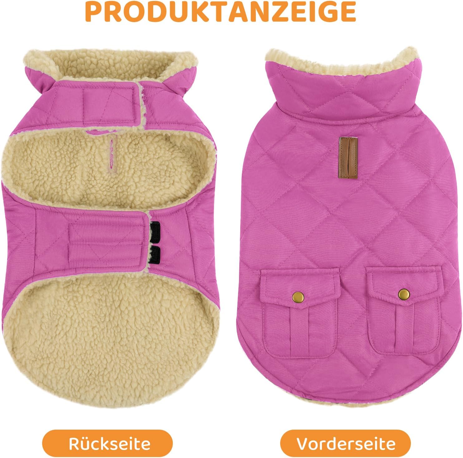• Стилна яка и ватирани джобове: Лесно е да съхранявате закуски, торби за боклук или каишка в джобовете за съхранение на гърба на кучешкото палто; силно подплатеното зимно кучешко палто може ефективно да блокира студения вятър, когато нашийникът е сгънат; Палтото за кучета създава различен вид, когато нашийникът е сгънат надолу и разкрива бежовата дебела къса плюшена подплата.