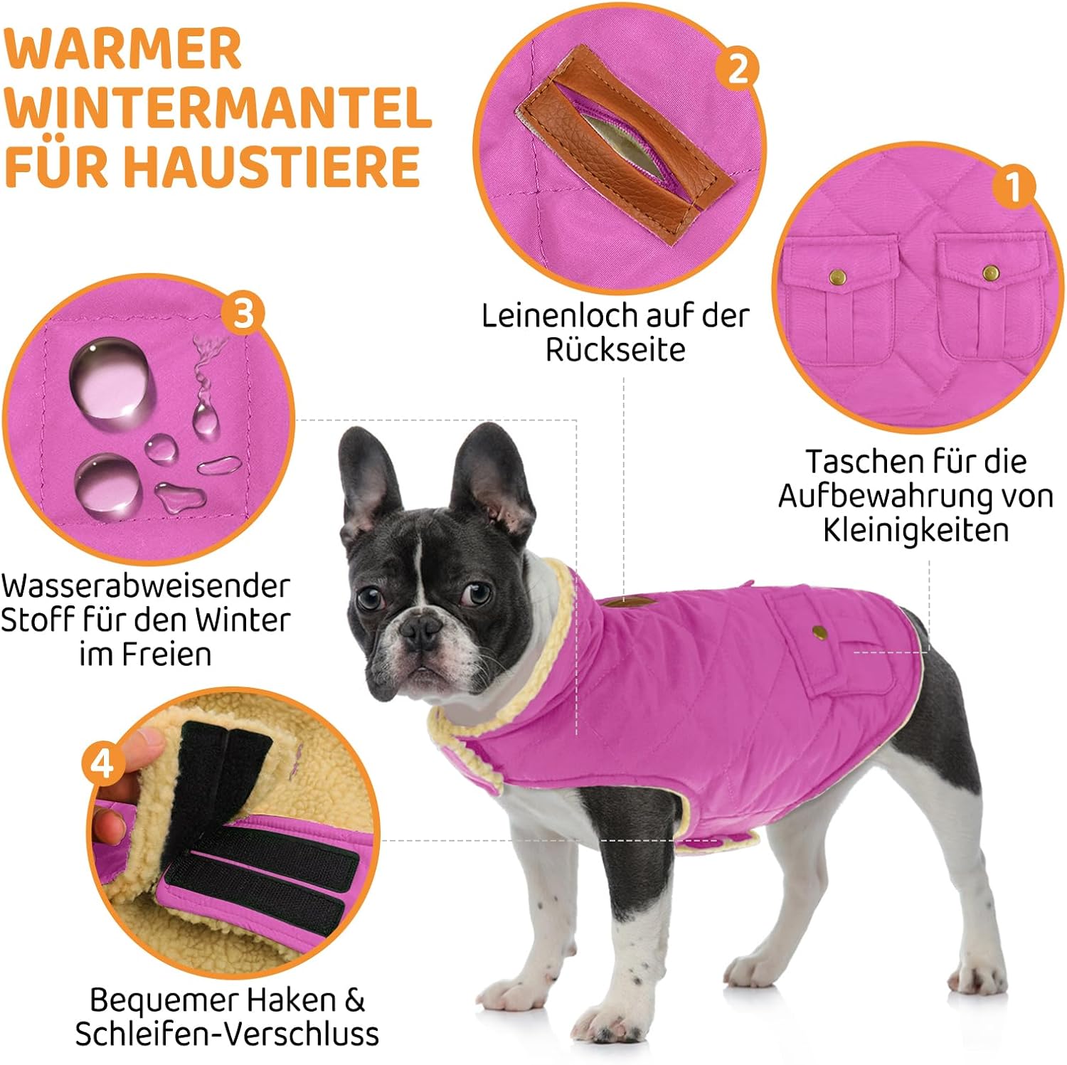 • Ветроустойчиво и предпазващо от атмосферни влияния яке за кучета: Външният материал на това дебело палто за кучета е изработен от водоотблъскващ полиестер; то държи кучетата сухи при мокри или снежни условия; Тази защита е от решаващо значение, за да се осигури комфорт и топлина при лошо време и да се предотврати намокрянето и студа на кучето.