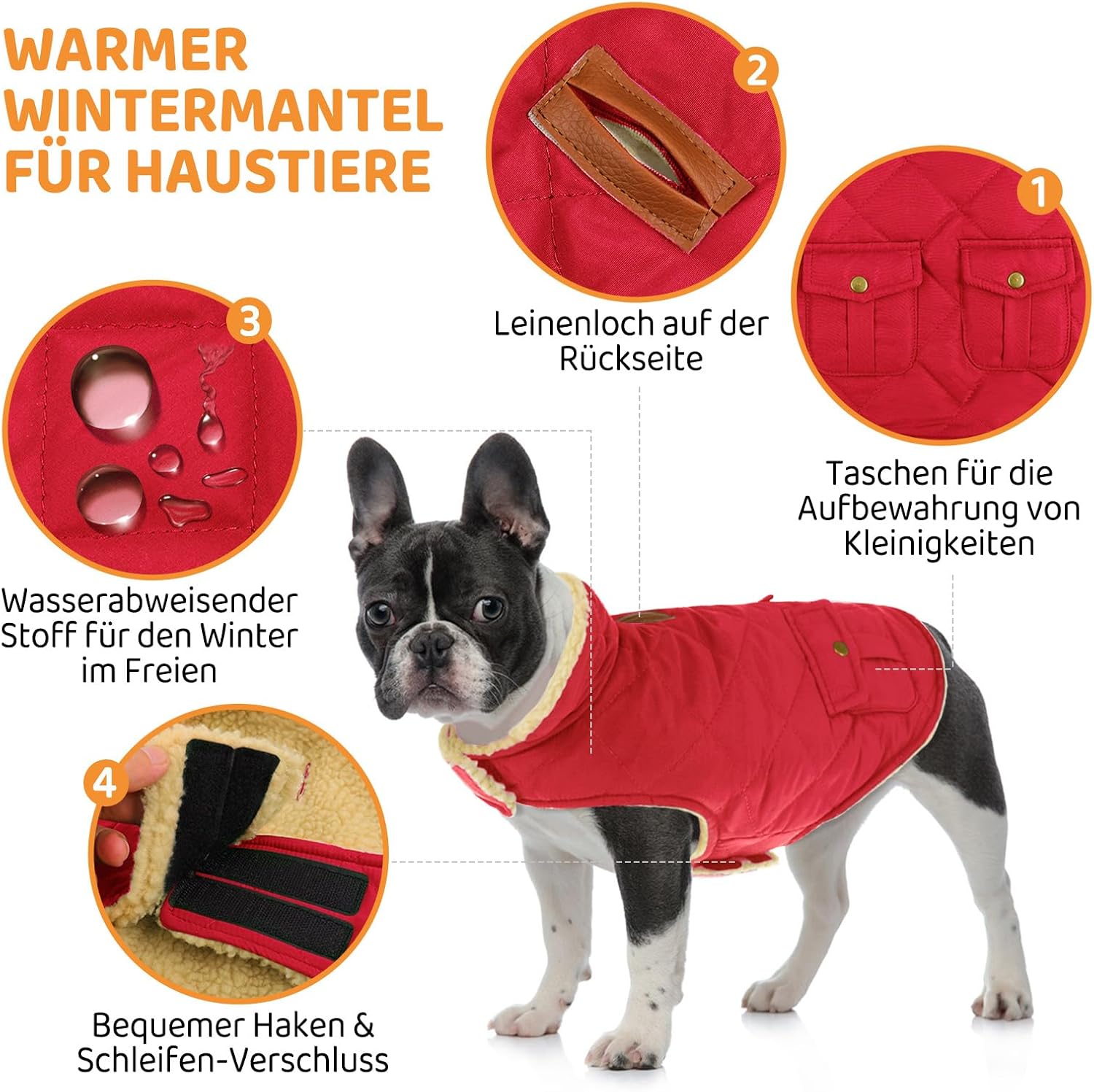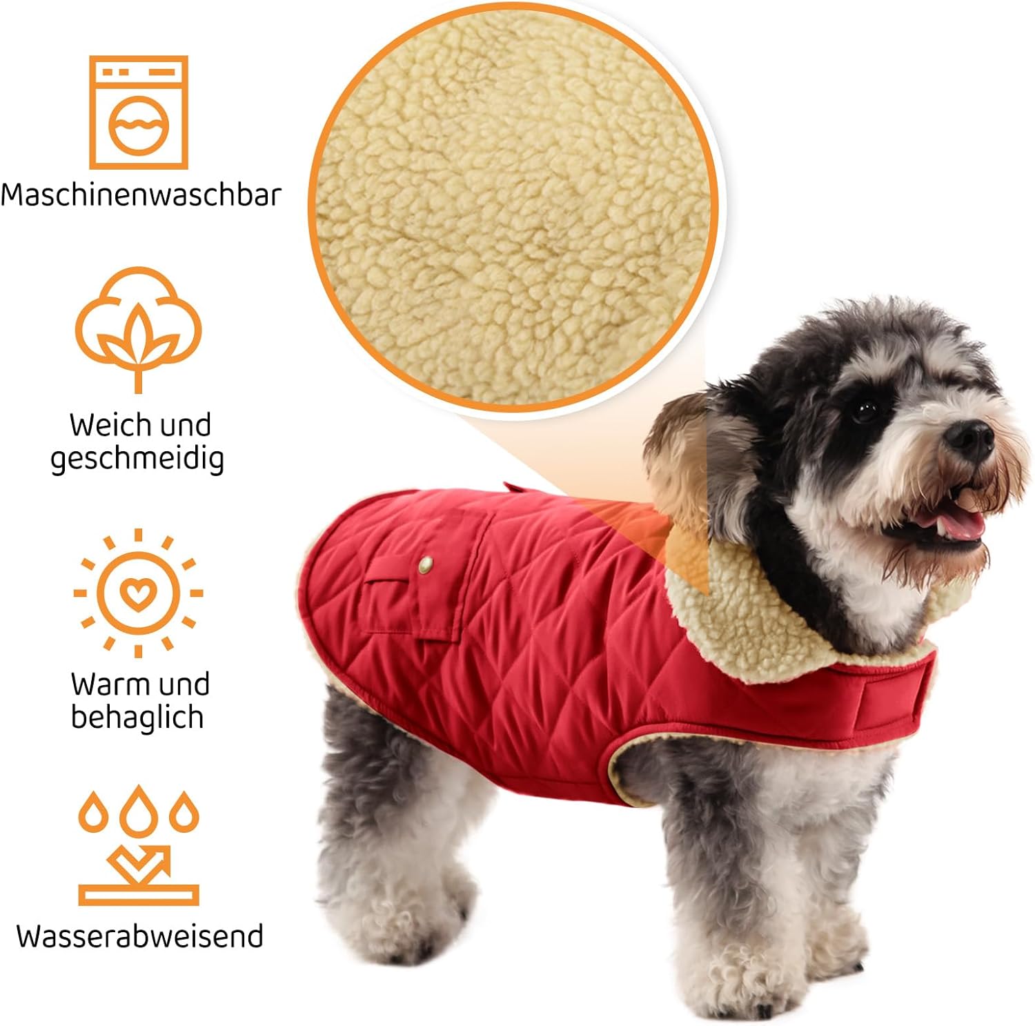• Ветроустойчиво и предпазващо от атмосферни влияния яке за кучета: Външният материал на това дебело палто за кучета е изработен от водоотблъскващ полиестер; то държи кучетата сухи при мокри или снежни условия; Тази защита е от решаващо значение, за да се осигури комфорт и топлина при лошо време и да се предотврати намокрянето и студа на кучето.