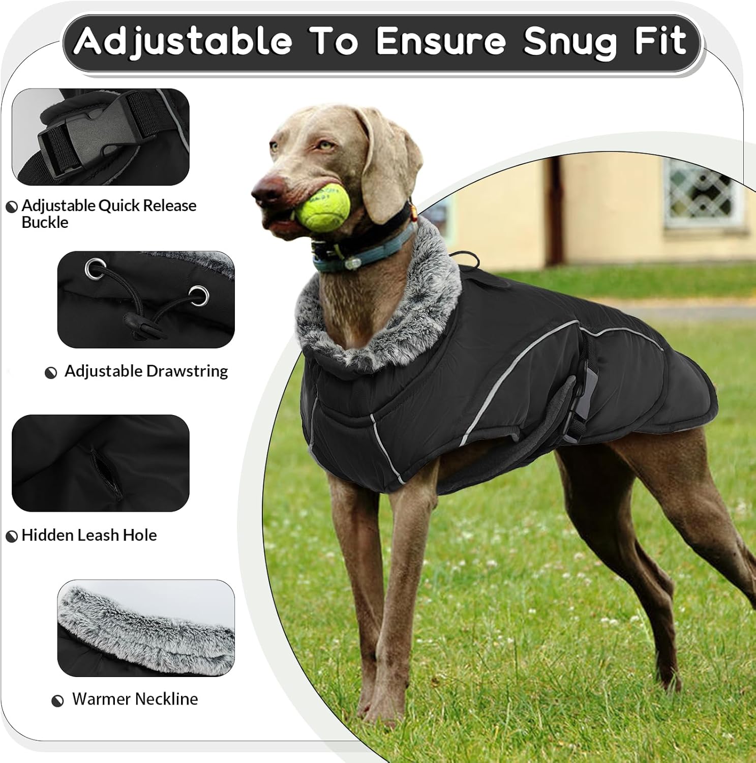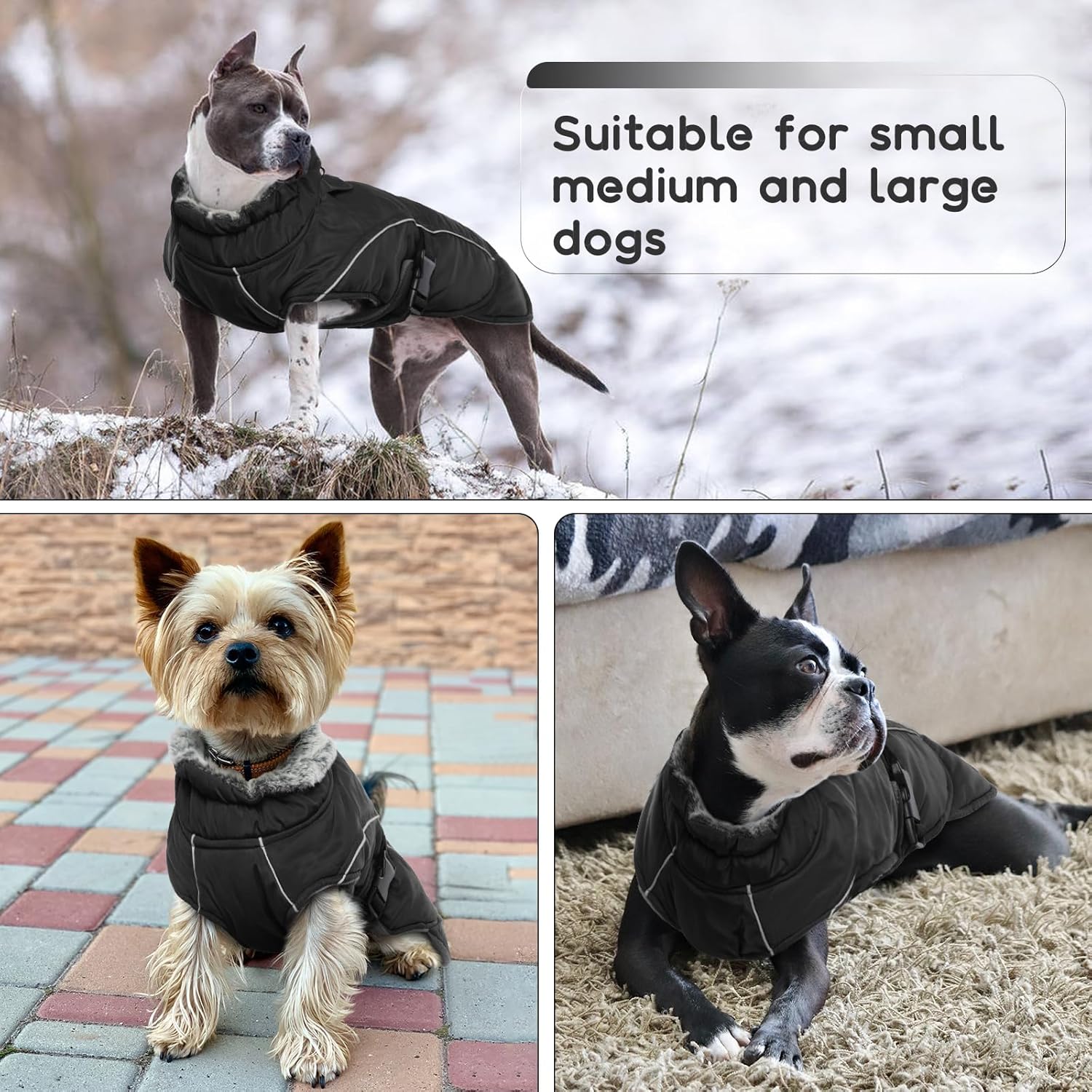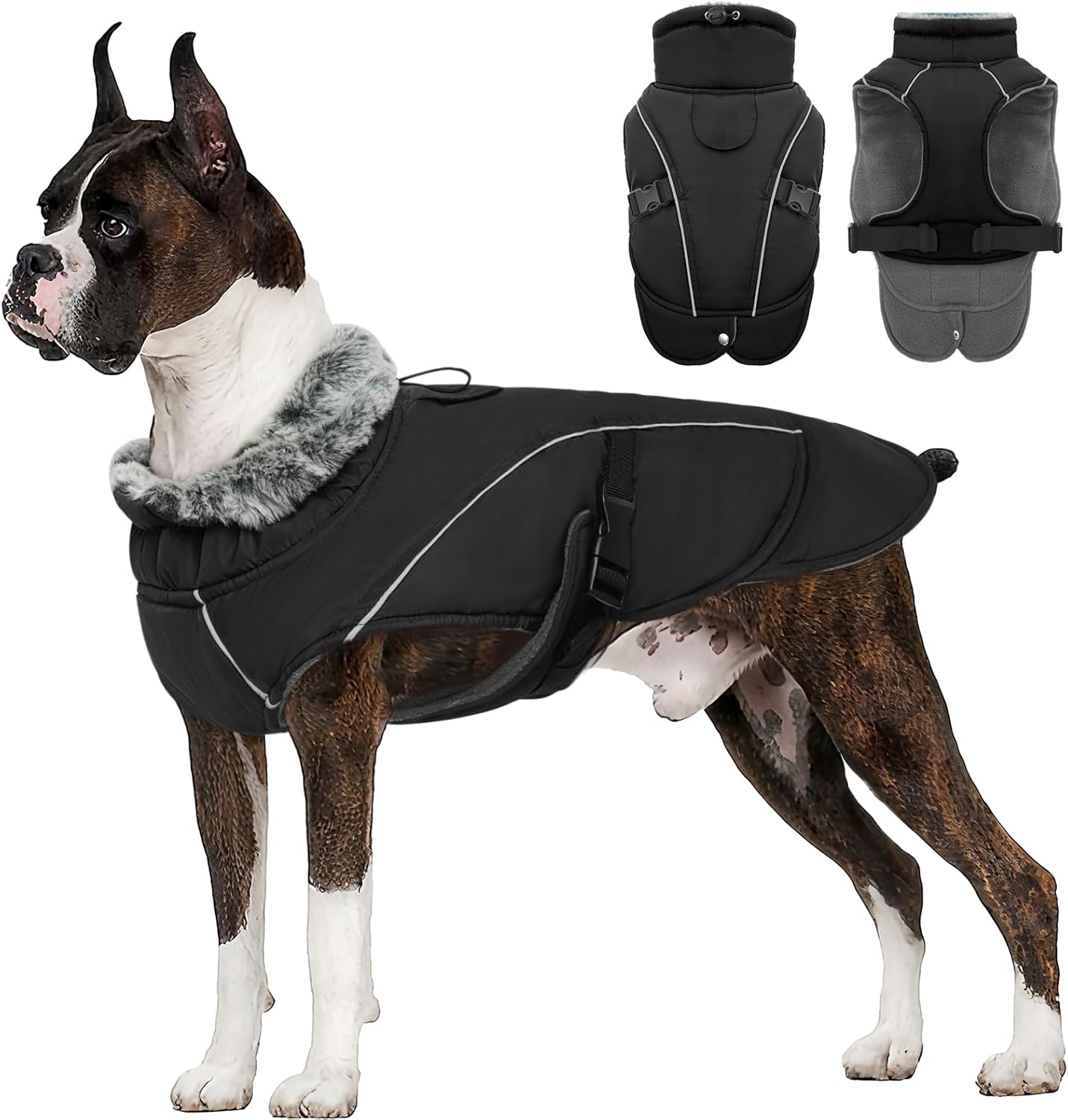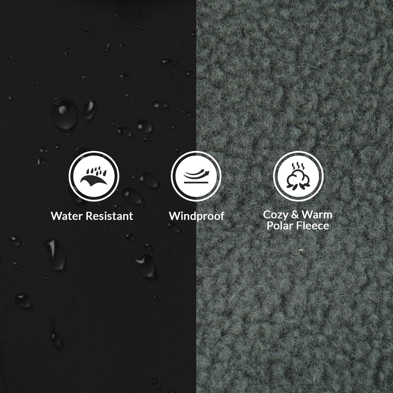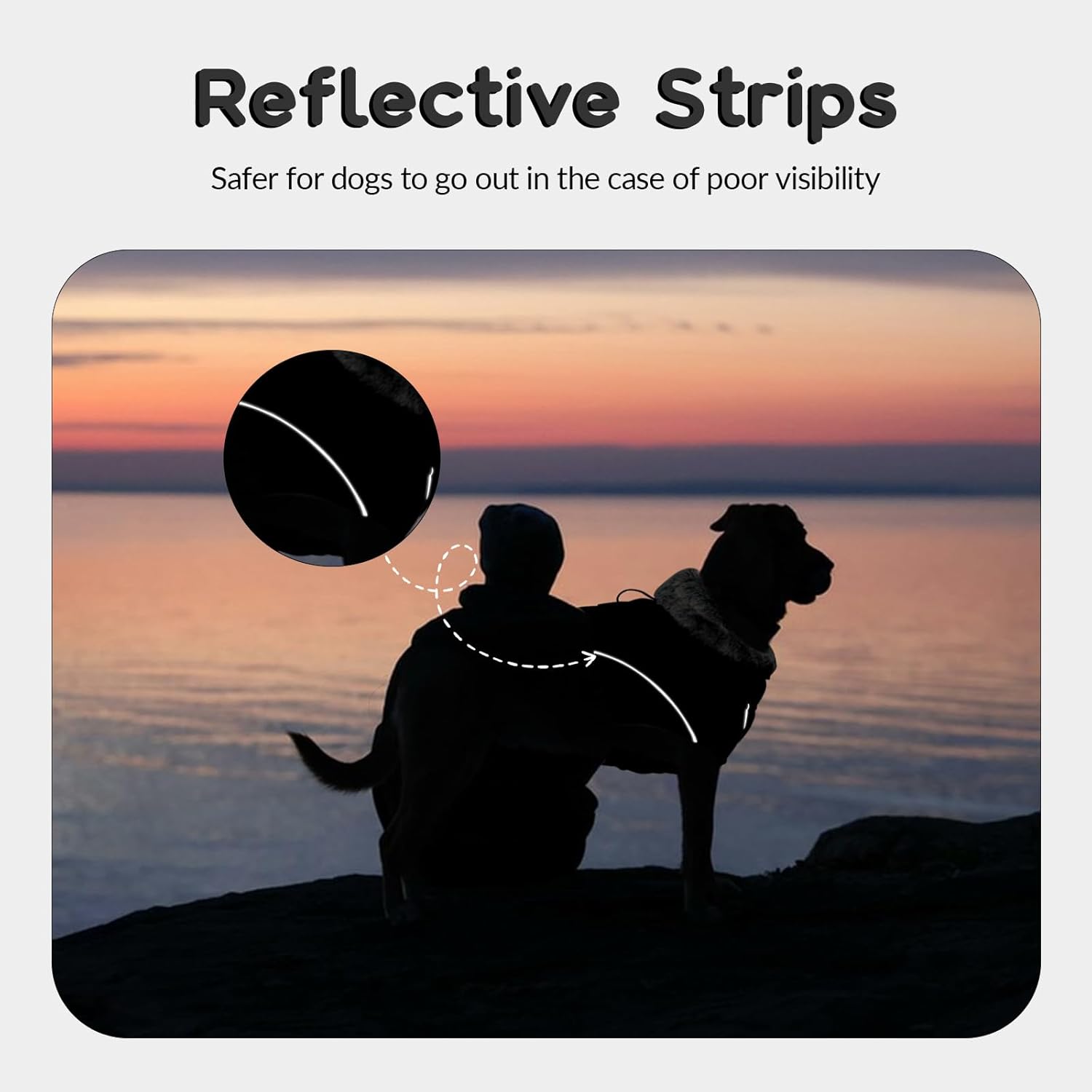Топло и водоустойчиво: Зимното яке за кучета е изработено от водоотблъскващ външен материал и вътрешен слой от полар и поддържа вашите домашни любимци сухи и топли. Кожена яка - Водоустойчивият зимен дизайн на яке за кучета със супер топла поларена яка за врата, която може да се регулира с връзка за стягане и може да се настройва и сваля, ако е необходимо. Светлоотразителни ленти - Топлият жилет за кучета е ушит със светлоотразителни ленти, за да направи кучето ви по-видимо и безопасно през нощта. Лесно обличане и сваляне - Регулируемата катарама на поларното яке за кучета позволява бързо фиксиране, което може да се регулира, за да приляга по-добре около областта на гърдите. Отвор за каишка - Има скрит отвор за каишка, където каишката за куче може да се прикрепи към якето.