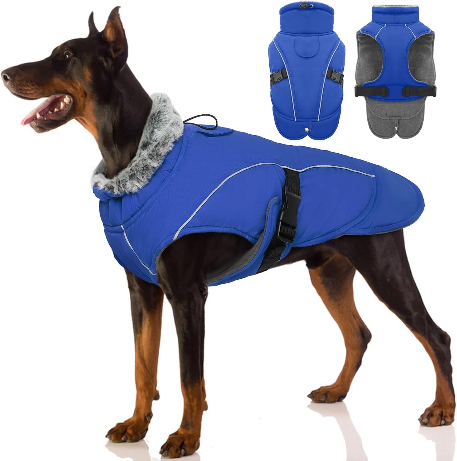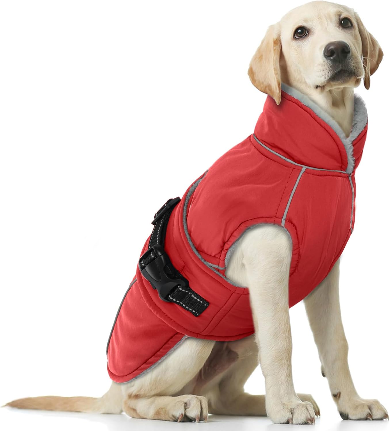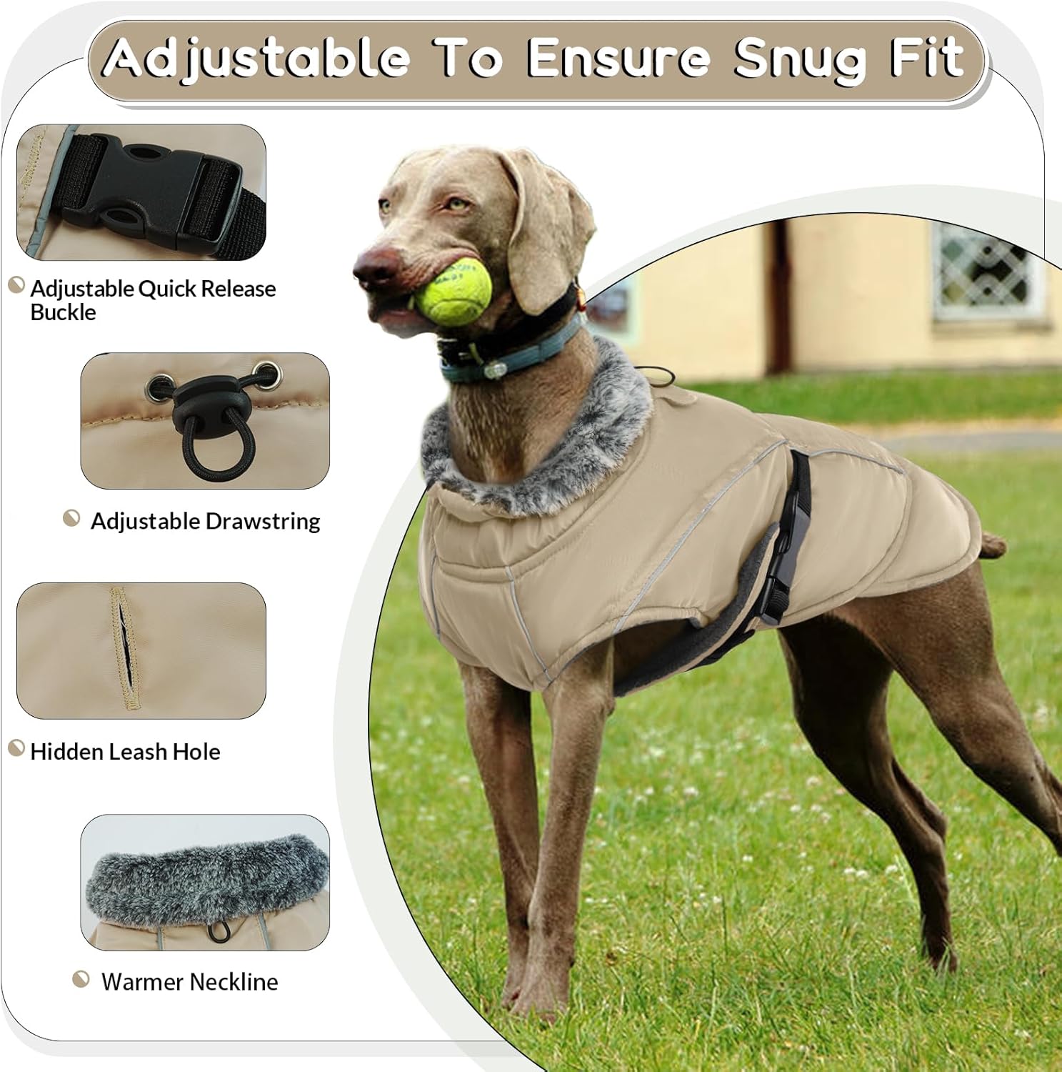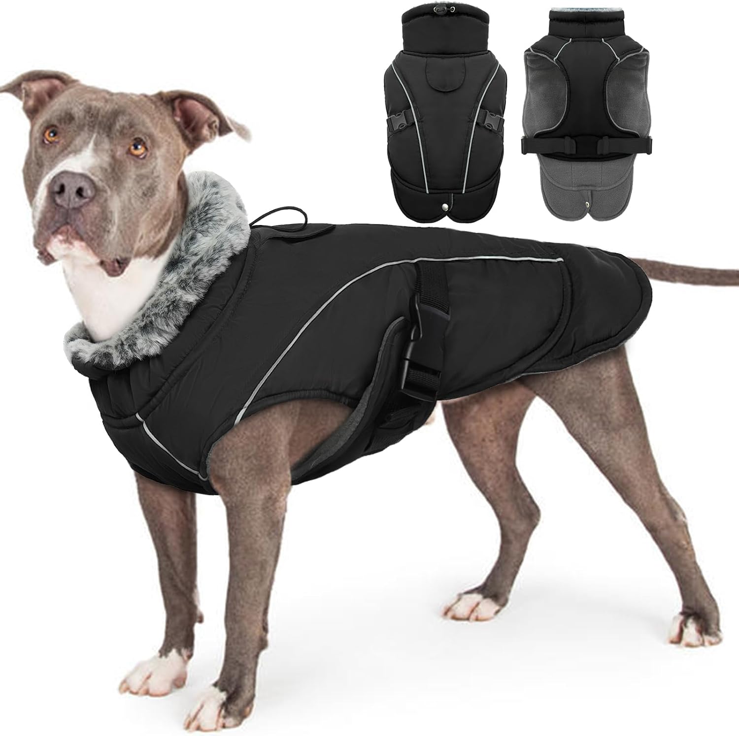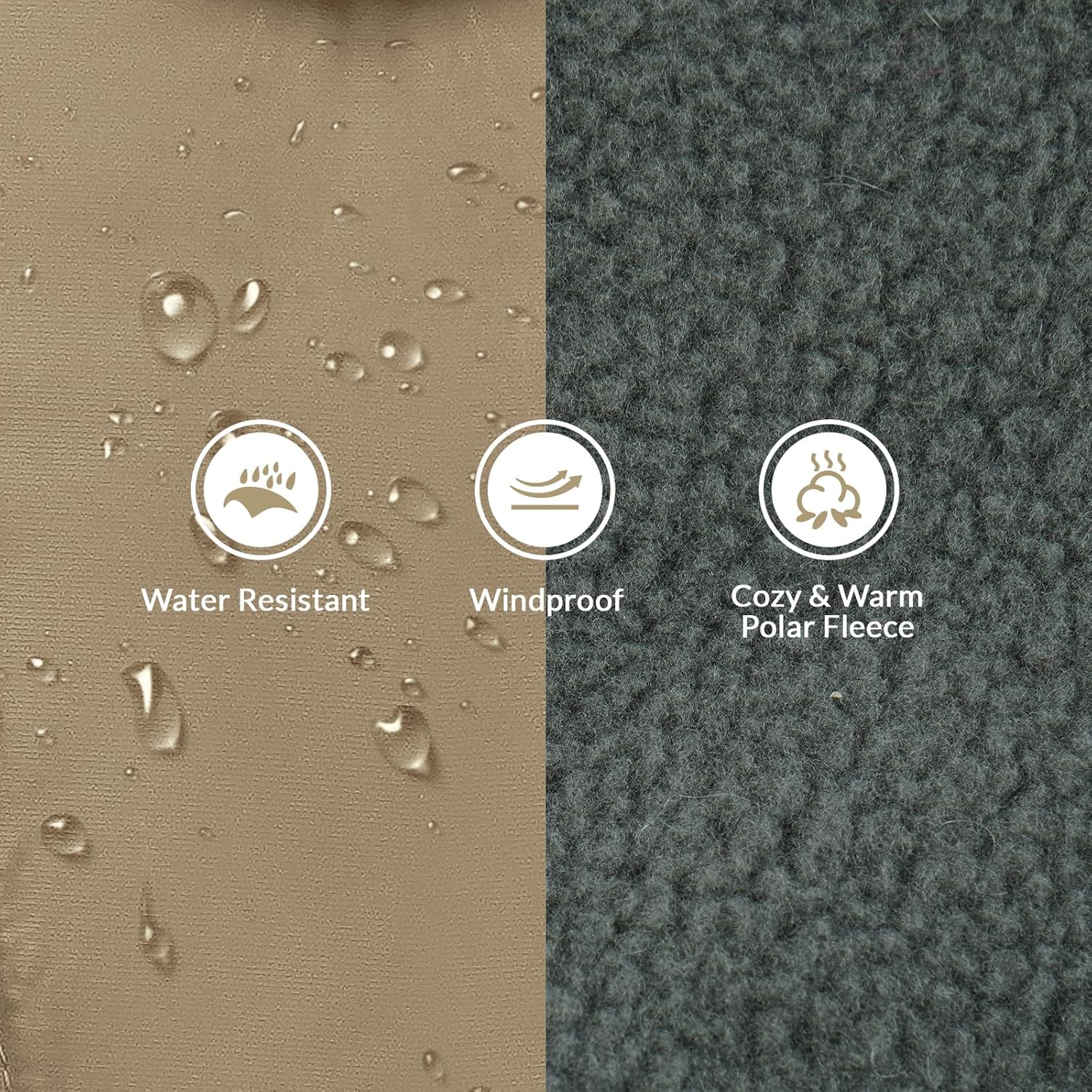 Топло и водоустойчиво: Зимното яке за кучета е изработено от водоотблъскващ външен материал и вътрешен слой от полар и поддържа вашите домашни любимци сухи и топли. Кожена яка - Водоустойчивият зимен дизайн на яке за кучета със супер топла поларена яка за врата, която може да се регулира с връзка за стягане и може да се настройва и сваля, ако е необходимо. Светлоотразителни ленти - Топлият жилет за кучета е ушит със светлоотразителни ленти, за да направи кучето ви по-видимо и безопасно през нощта. Лесно обличане и сваляне - Регулируемата катарама на поларното яке за кучета позволява бързо фиксиране, което може да се регулира, за да приляга по-добре около областта на гърдите. Отвор за каишка - Има скрит отвор за каишка, където каишката за куче може да се прикрепи към якето.