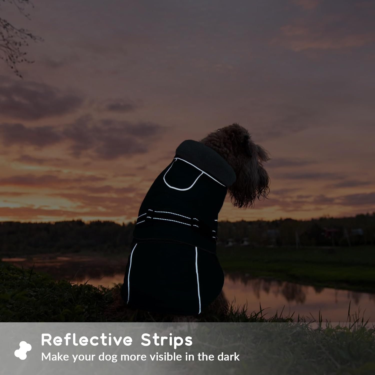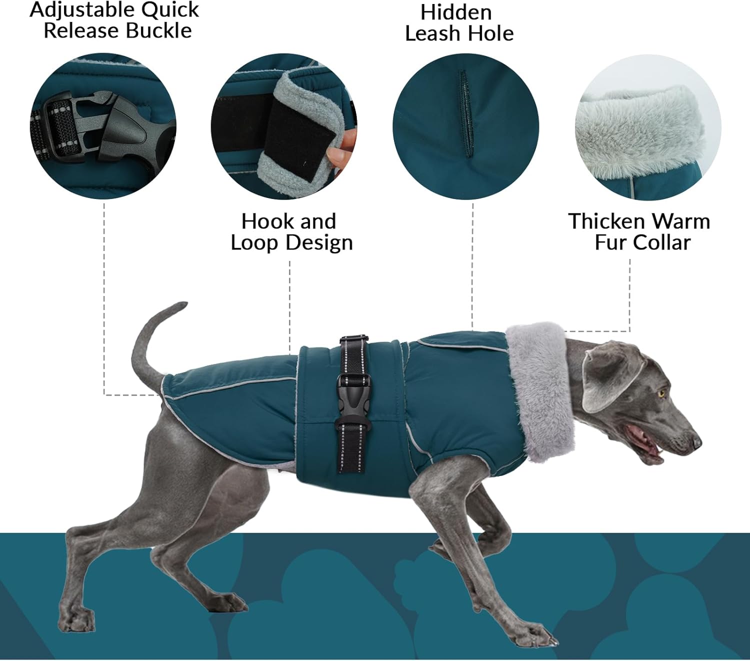 Топло и водоустойчиво: Зимното яке за кучета е изработено от водоотблъскващ външен материал и вътрешен слой от полар и поддържа вашите домашни любимци сухи и топли. Кожена яка - Водоустойчивият зимен дизайн на яке за кучета със супер топла поларена яка за врата, която може да се регулира с връзка за стягане и може да се настройва и сваля, ако е необходимо. Светлоотразителни ленти - Топлият жилет за кучета е ушит със светлоотразителни ленти, за да направи кучето ви по-видимо и безопасно през нощта. Лесно обличане и сваляне - Регулируемата катарама на поларното яке за кучета позволява бързо фиксиране, което може да се регулира, за да приляга по-добре около областта на гърдите. Отвор за каишка - Има скрит отвор за каишка, където каишката за куче може да се прикрепи към якето.