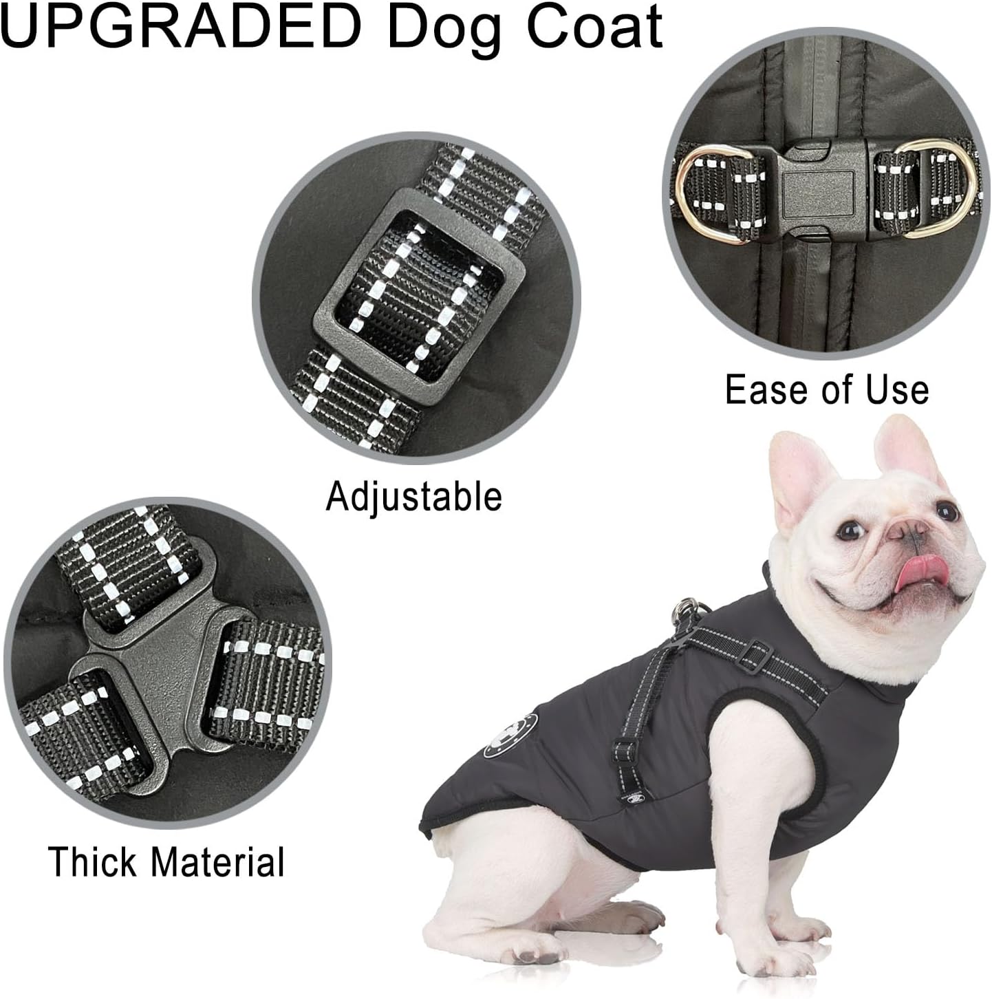 Палто за кучета за малки кучета, Яке за кучета с нагръдник, Водоустойчиво топло зимно палто за малки и средни кучета, Може да се пере в пералня, Дизайн със светлоотразителни ивици, Издръжлив D-образен пръстен, Черно