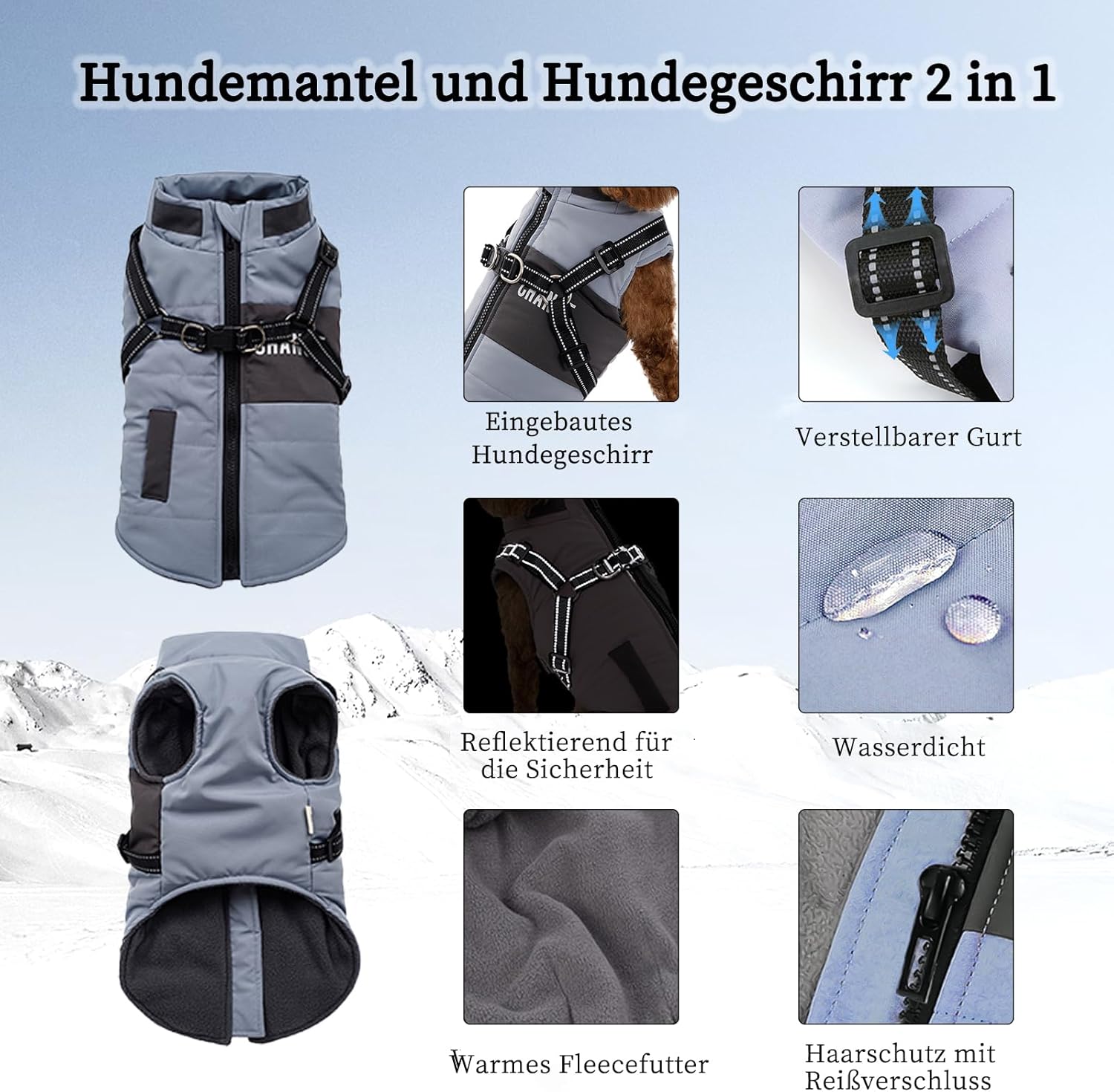 Палто за кучета с дизайн на нагръдник, не е необходим допълнителен жилетка за кучета, по-практично е за зимата навън с вашите кучета. Нагръдникът е вграден в палтата за кучета, което е по-удобно от нагръдника за кучета. С това зимно палто 2 в 1 за кучета можете да извеждате кучетата си навън по всяко време.