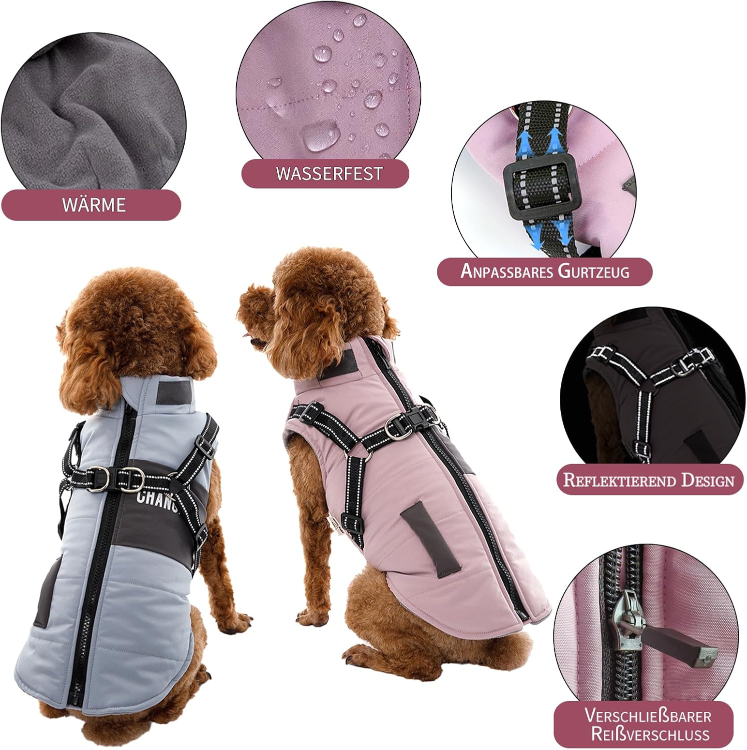 Палто за кучета с дизайн на нагръдник, не е необходим допълнителен жилетка за кучета, по-практично е за зимата навън с вашите кучета. Нагръдникът е вграден в палтата за кучета, което е по-удобно от нагръдника за кучета. С това зимно палто 2 в 1 за кучета можете да извеждате кучетата си навън по всяко време.
