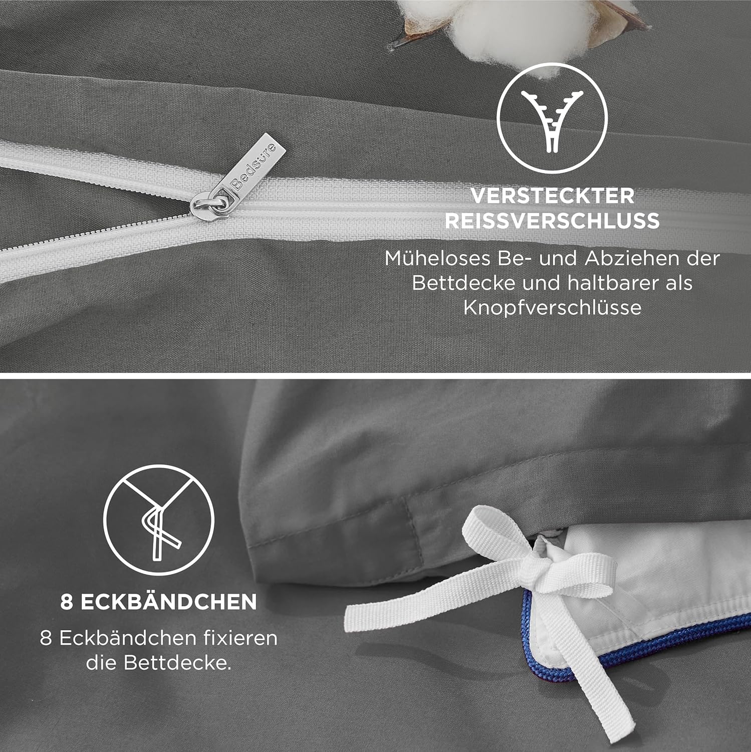 • 8 практични връзки са пришити към сивия памучен спален лен, за да се предотврати плъзгането на завивката напред-назад вътре или постоянното струпване в ъгъла. Това осигурява безгрижен сън през нощта.