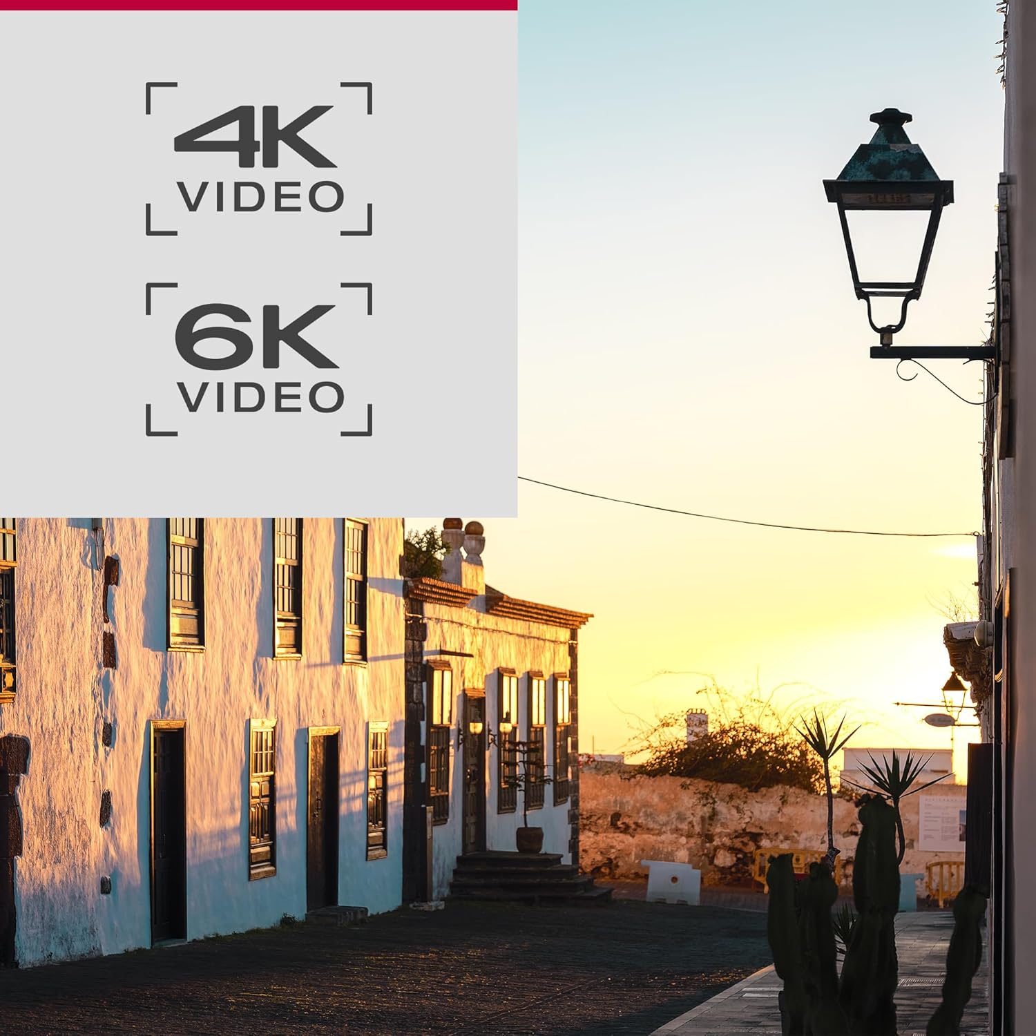 • Стабилизация на изображението: Заснемайте ясни, резки снимки и видеоклипове без трептене с резолюция до 6K благодарение на 5-осната/корпусната стабилизация, която интелигентно коригира треперещите движения на ръцете или движението по време на бягане.