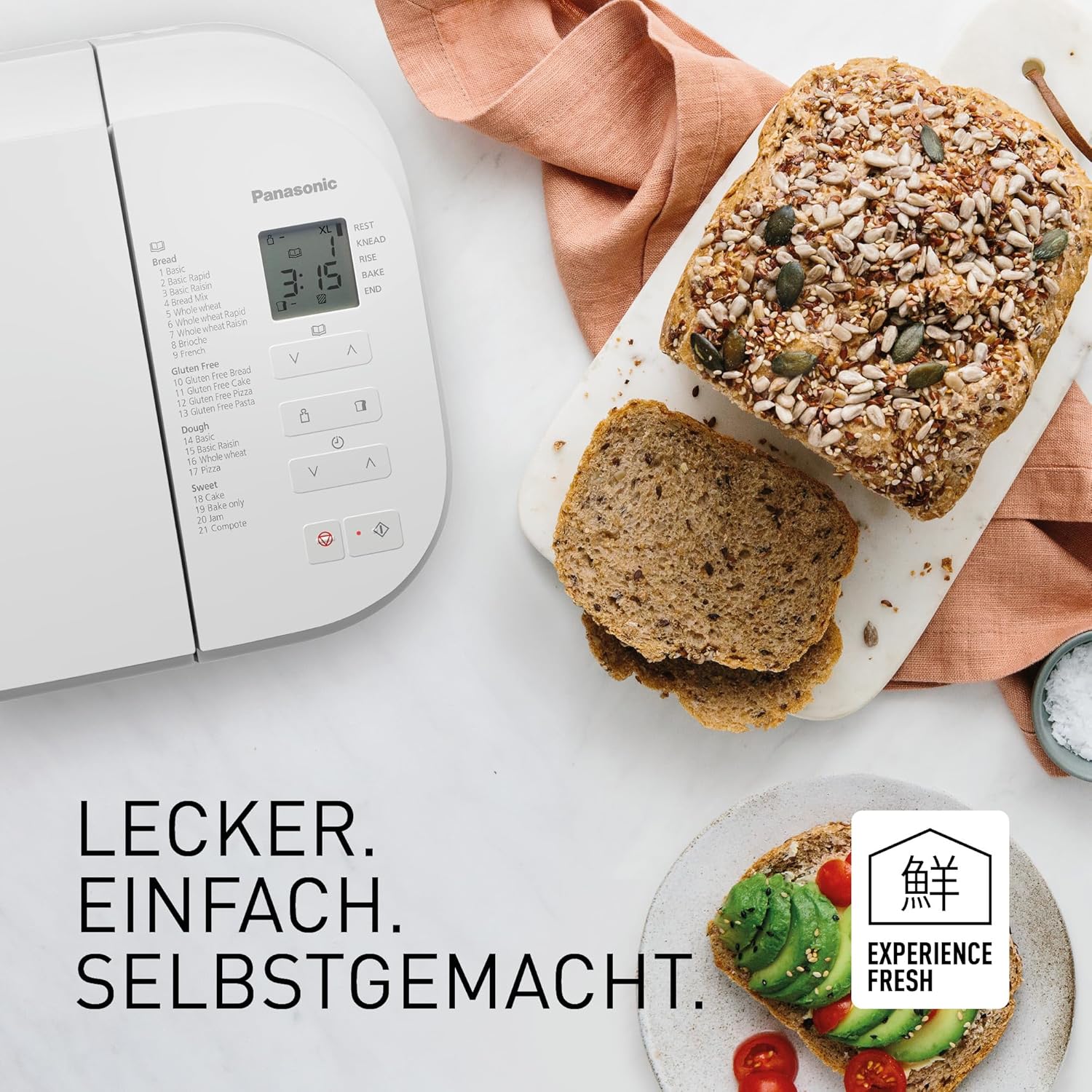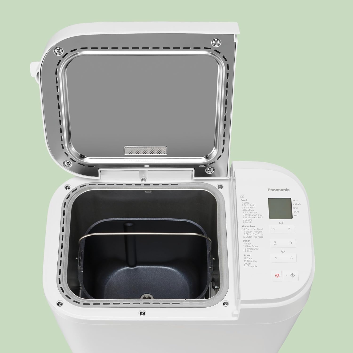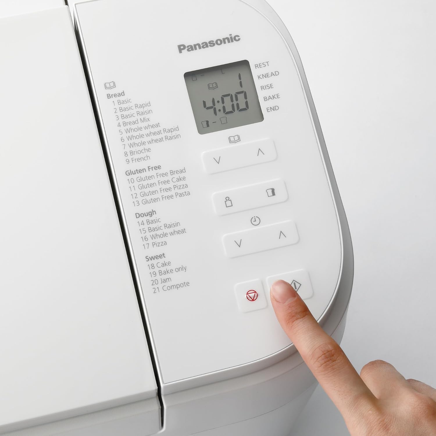 Panasonic SD-B2510W Напълно автоматична машина за хляб, 4 програми без глутен, хоризонтален дизайн, 21 автоматични програми, 2 температурни сензора, 13-часово отлагане, LCD дисплей, бял