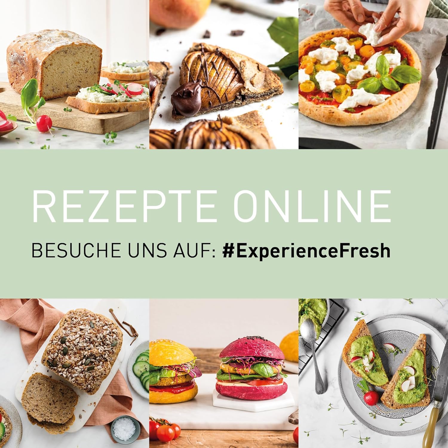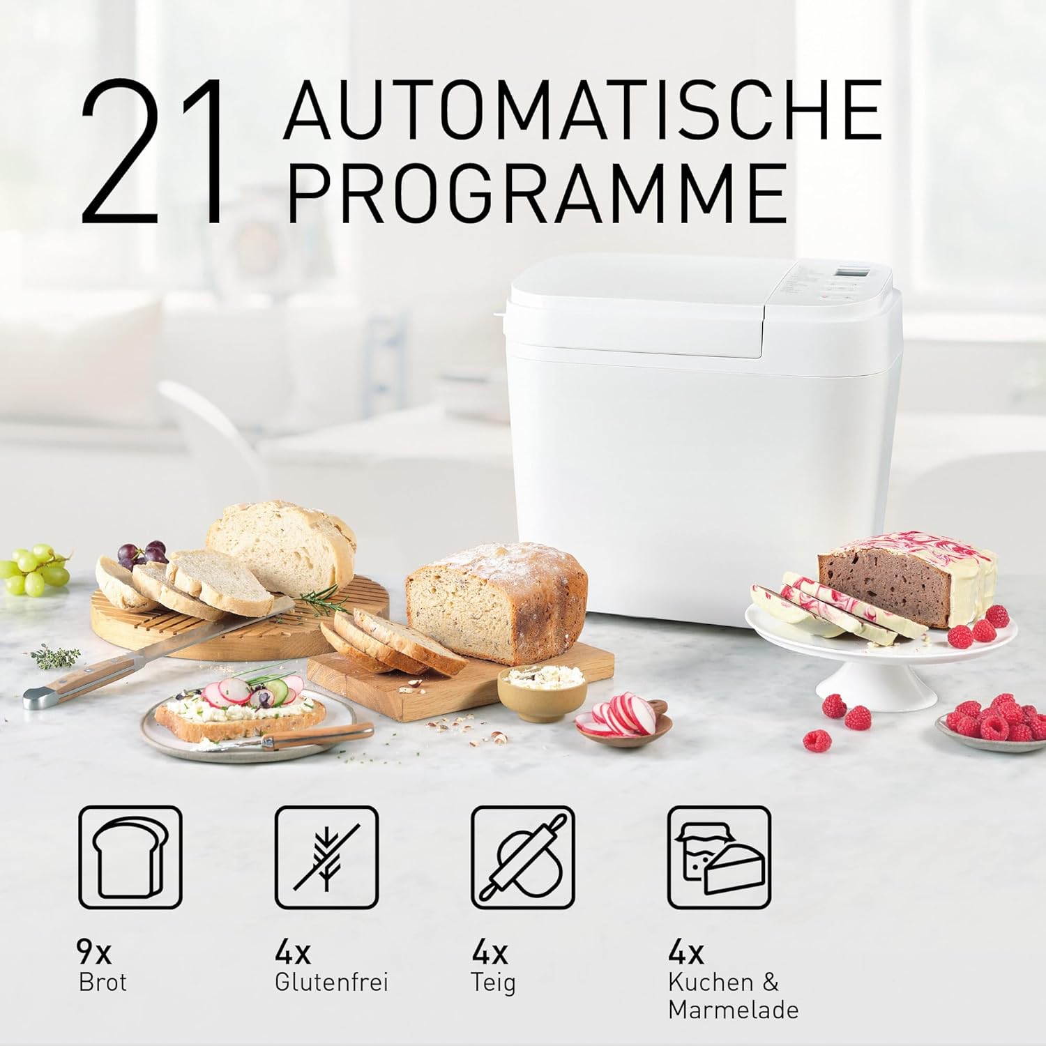 • Автоматични програми: 21 автоматични програми, като например за пълнозърнести храни, бриош, кексове и пица, улесняват печенето - просто добавете вода към сместа за хляб и готово!