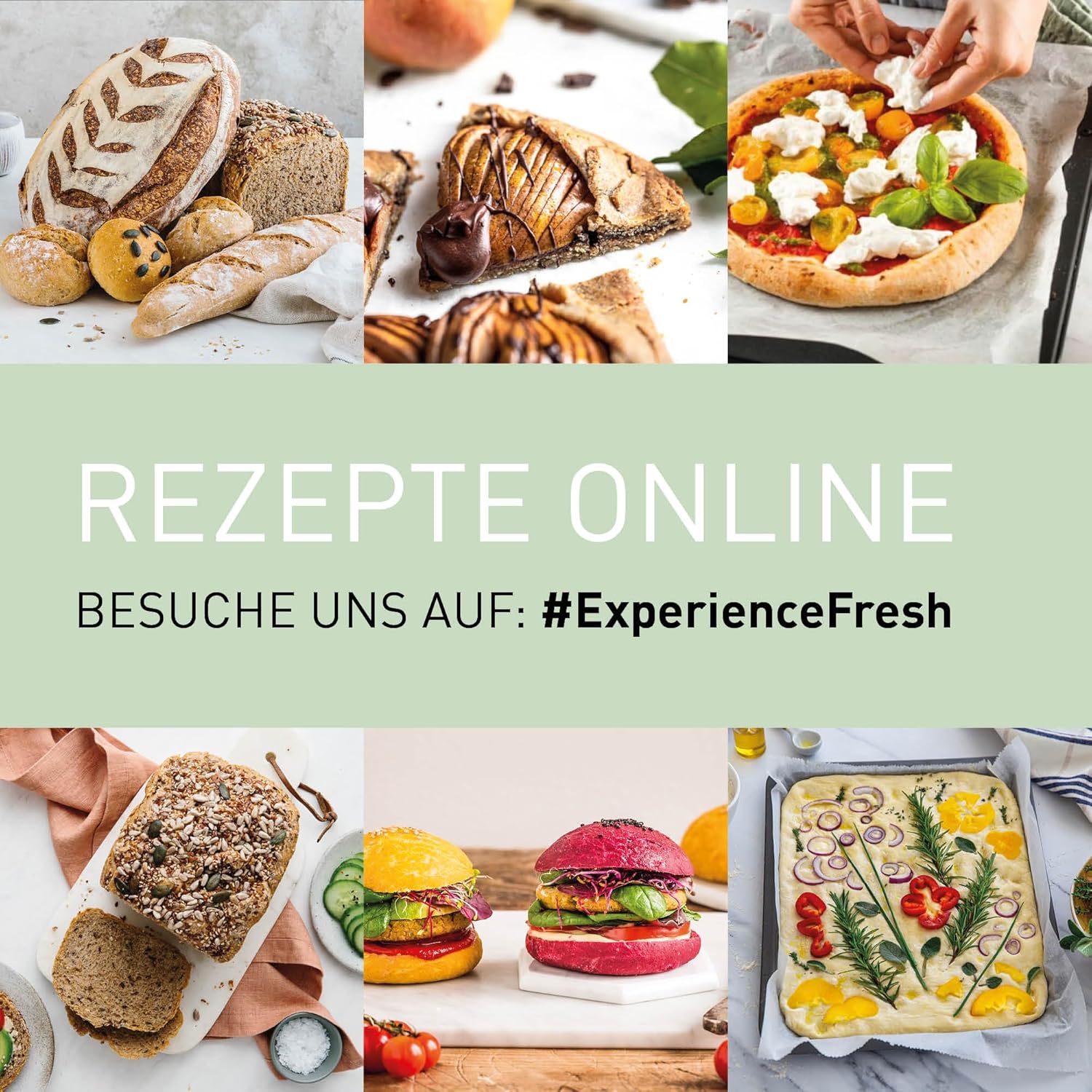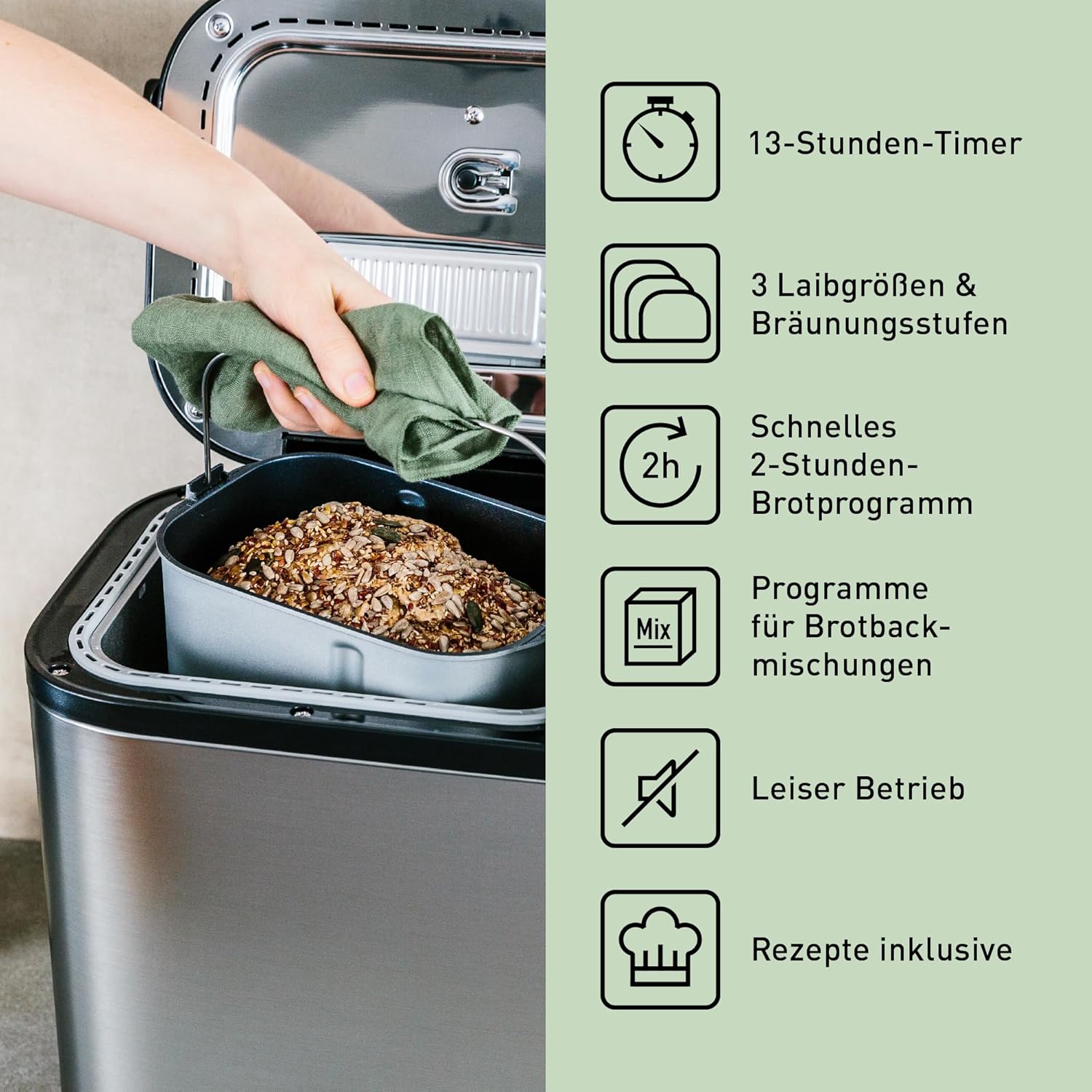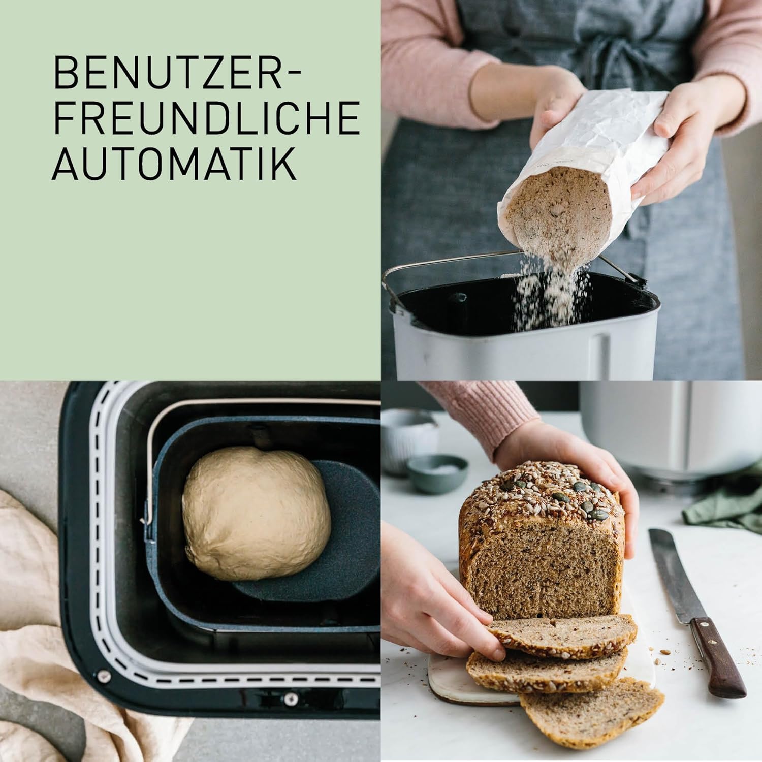 • Автоматични и ръчни настройки: тази първокласна машина за хляб има до 32 програми, включително пълнозърнест хляб, спелта, квасен хляб, бриош, кексове, пица, конфитюр. Просто добавете вода към сместа и готово! Ръчните настройки ви позволяват да проявите креативност.