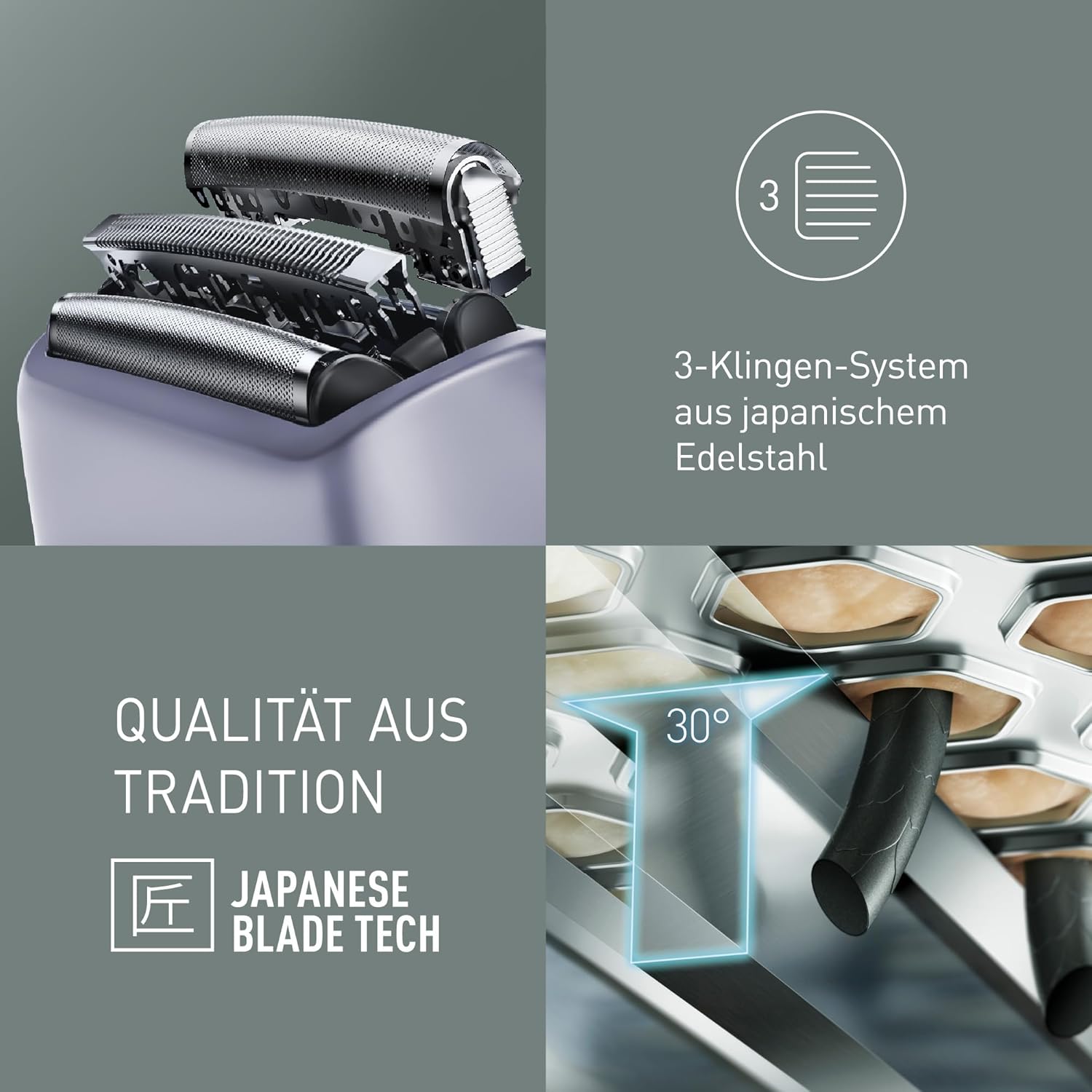 • СИСТЕМА С 3 НОЖЧЕТА: Първокласно бръснене с 3-те японски ножчета от неръждаема стомана на тази самобръсначка за сухо и мокро бръснене за острота, комфорт и издръжливост