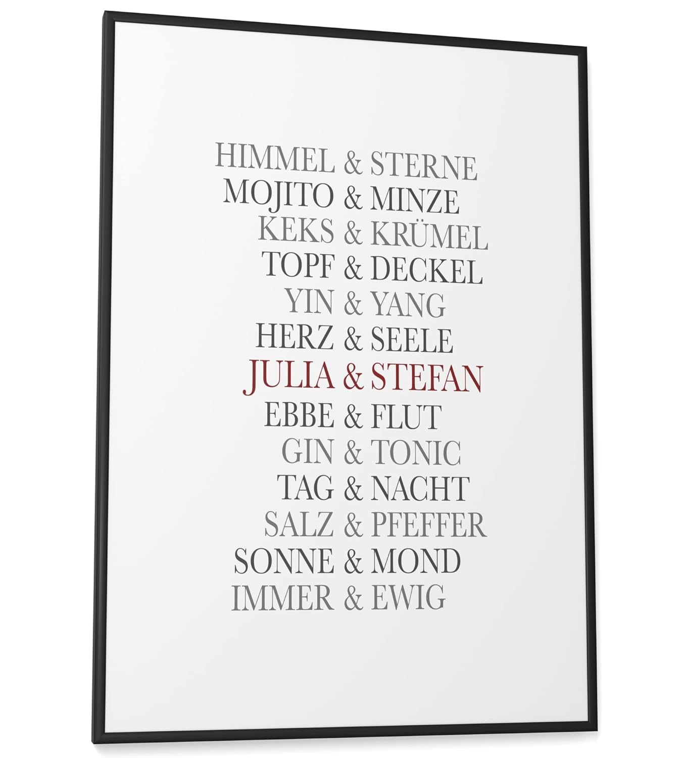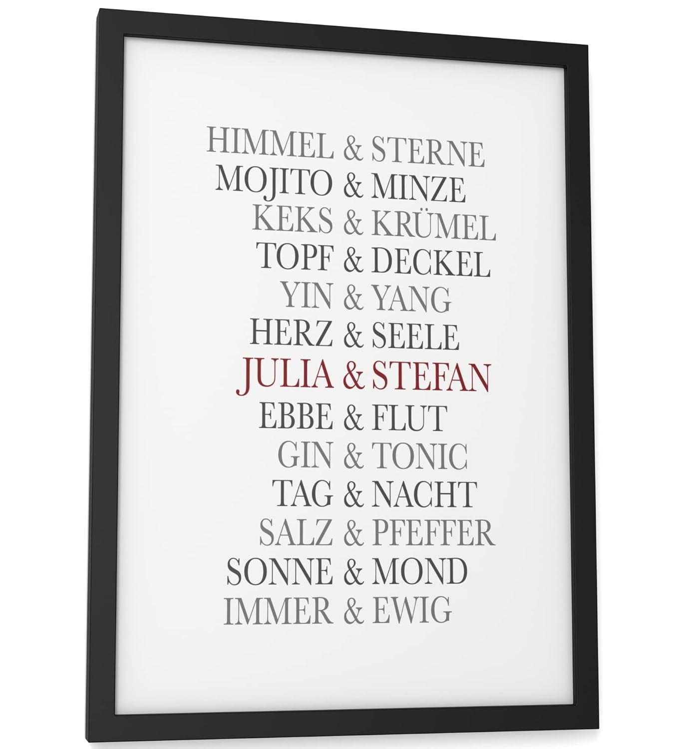 Papierschmiede® Чифт плакати, персонализирани с име, DIN A2 (42 x 59,4 см) Рамка с избираем размер, Сватбен подарък с рамка, Име, Подаръчна картина за годишнина, Стенна картина за сватба "Известни двойки"