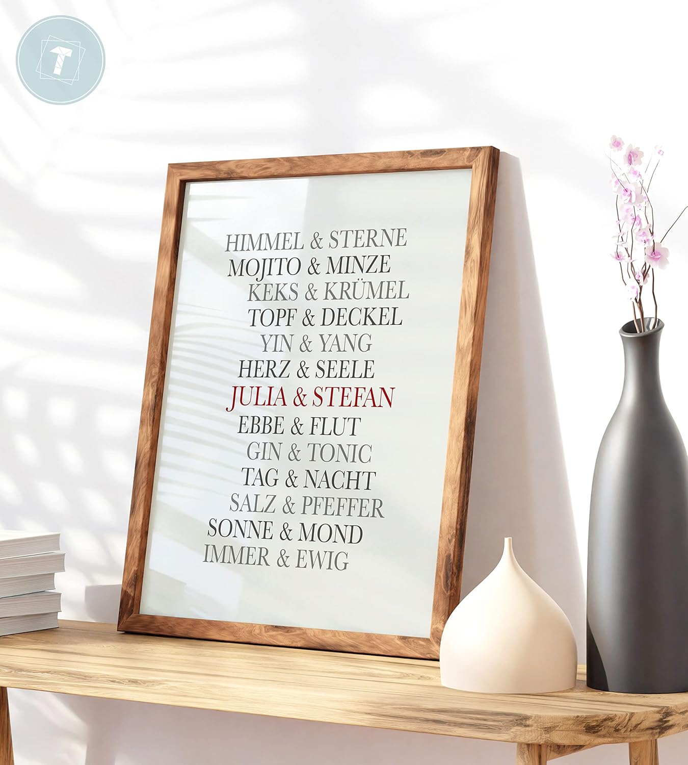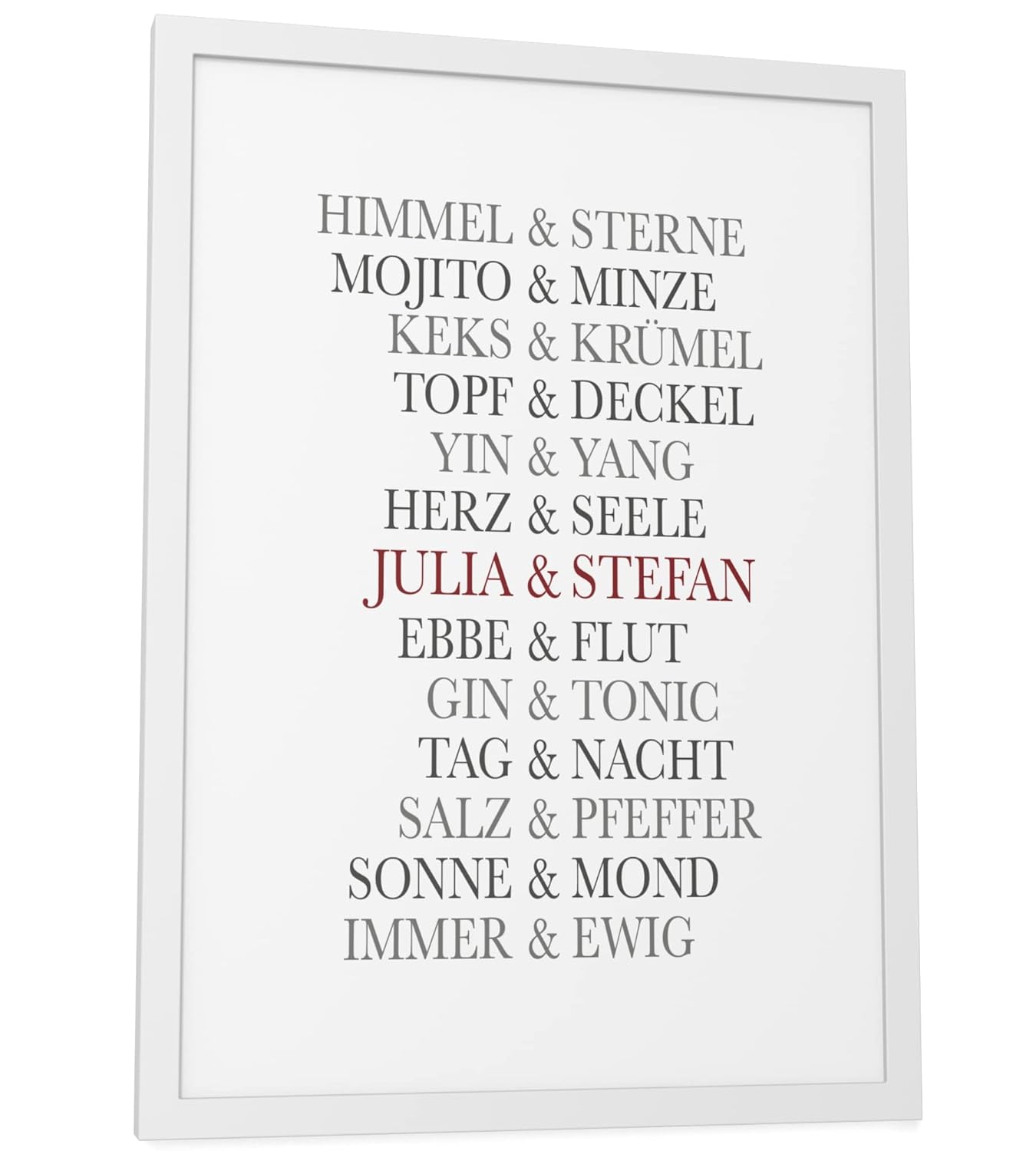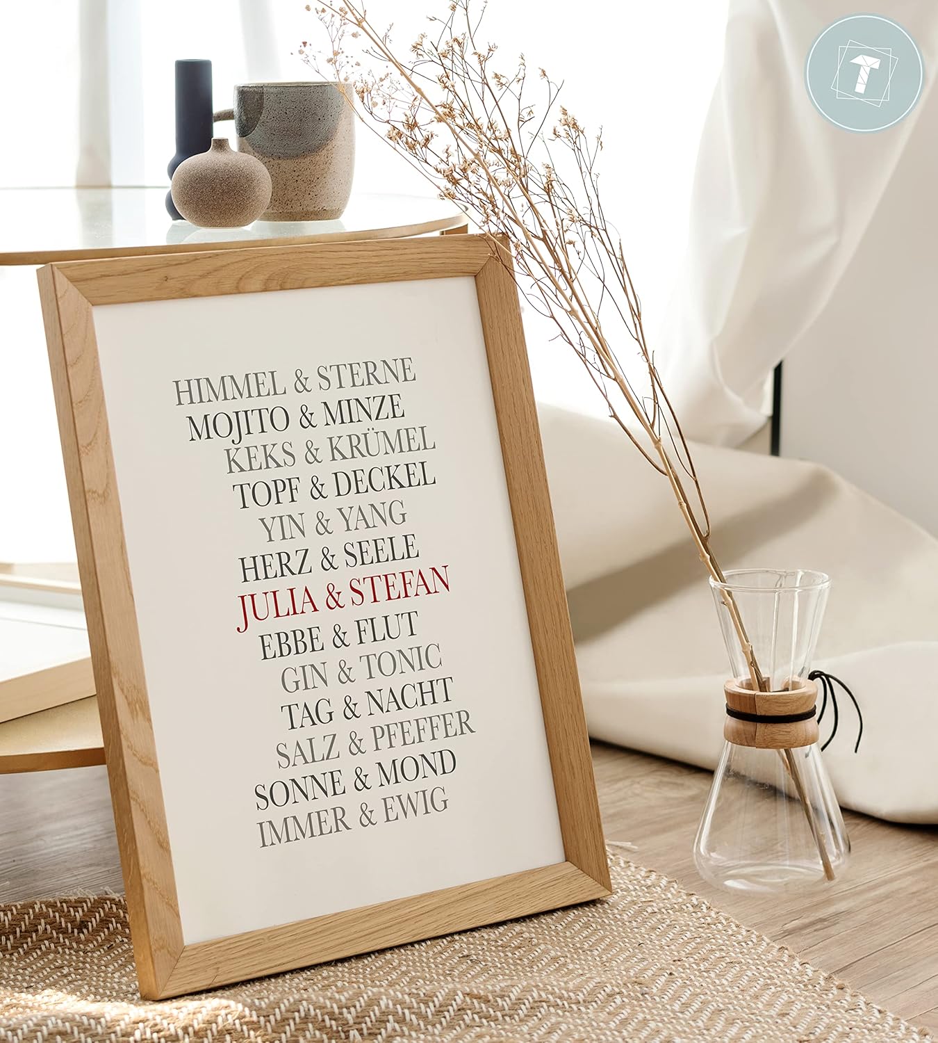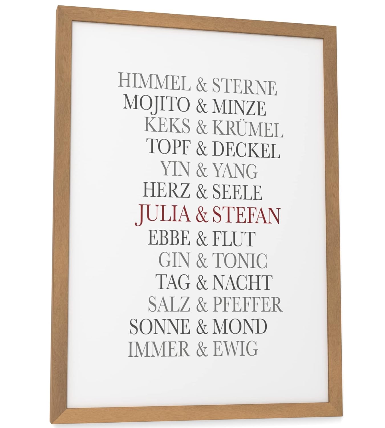 Papierschmiede® Чифт плакати, персонализирани с име, DIN A4 (21 x 30 см) Рамка с избираем размер, Сватбен подарък с рамка, Име, Подаръчна картина за годишнина, Стенна картина за сватба "Известни двойки"