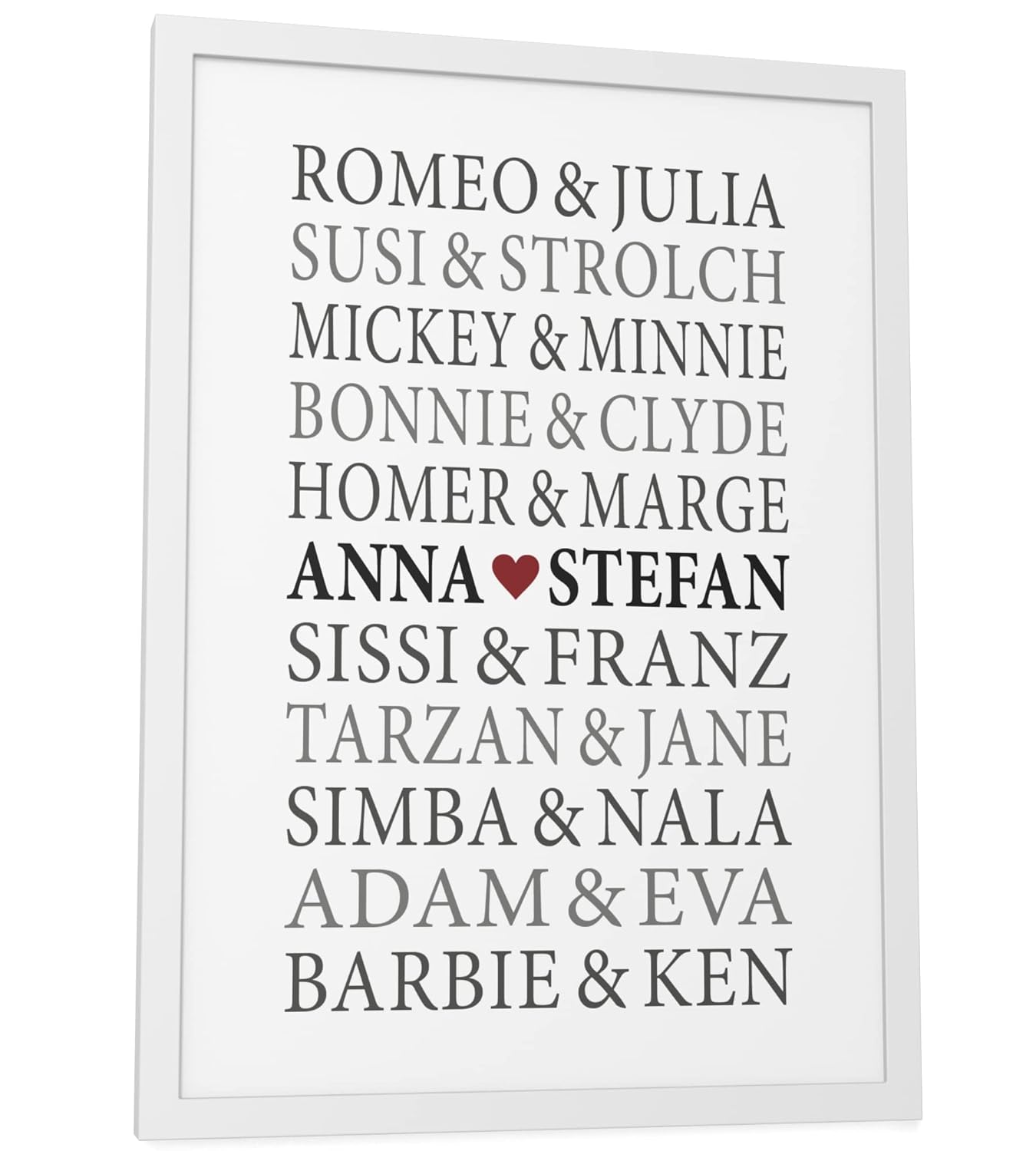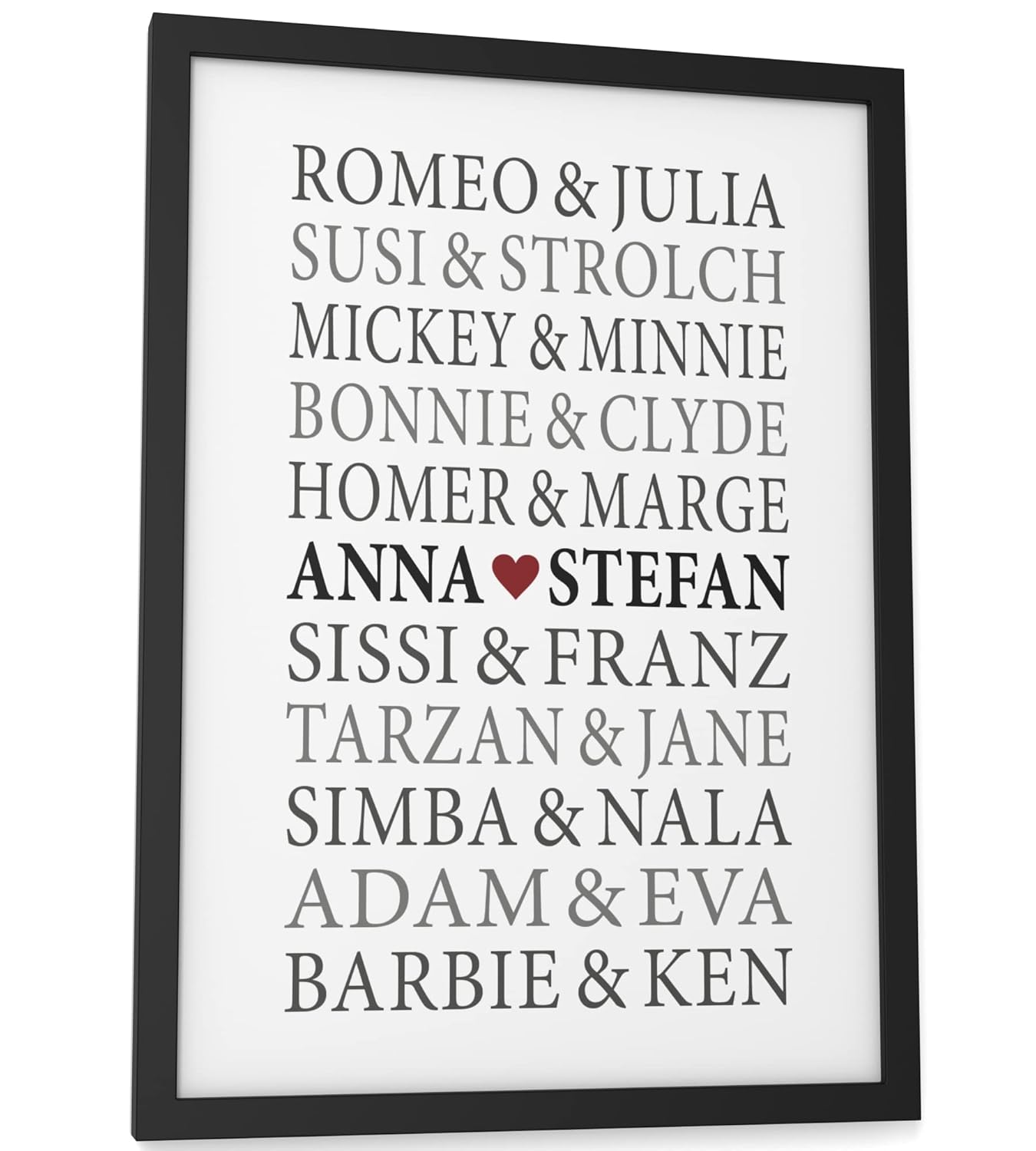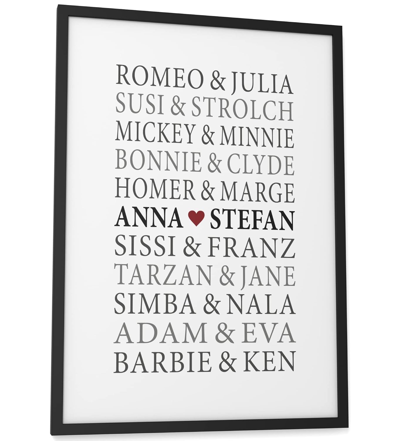 Papierschmiede® Чифт плакати, персонализирани с име, DIN A4 (21 x 30 см) Рамка с избираем размер, Сватбен подарък с рамка, Име, Подаръчна картина за годишнина, Стенна картина за сватба "Ромео и Жулиета"