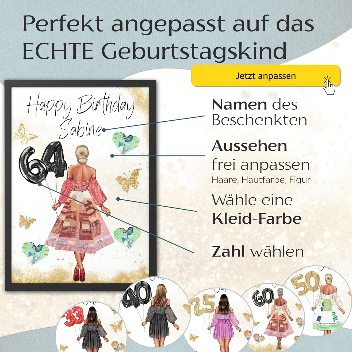 • Персонализирано и индивидуално регулируемо - Въведете името на рожденика, коригирайте цвета на косата, цвета на кожата и фигурата и изберете индивидуален цвят на роклята. Балоните с номерата са избираеми - идеални за всички възрасти.